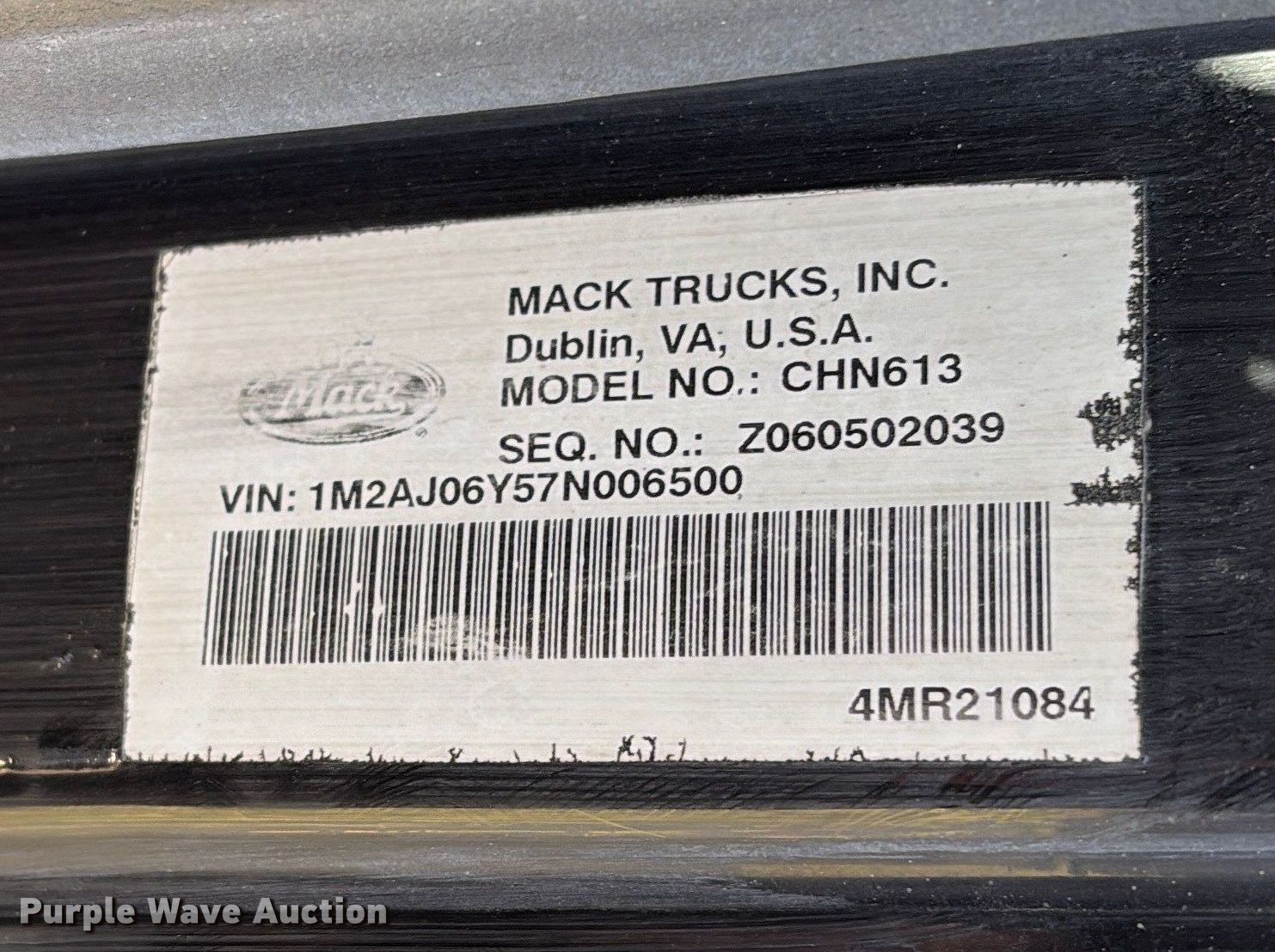 Take a look at this used 2007 Mack CHN semi truck being sold on April 30th, 2026 in the Thursday April 30 Truck and Trailer Auction made by Mack. Take a look at all of the item information below or take a look at similar auctions for Trucks.