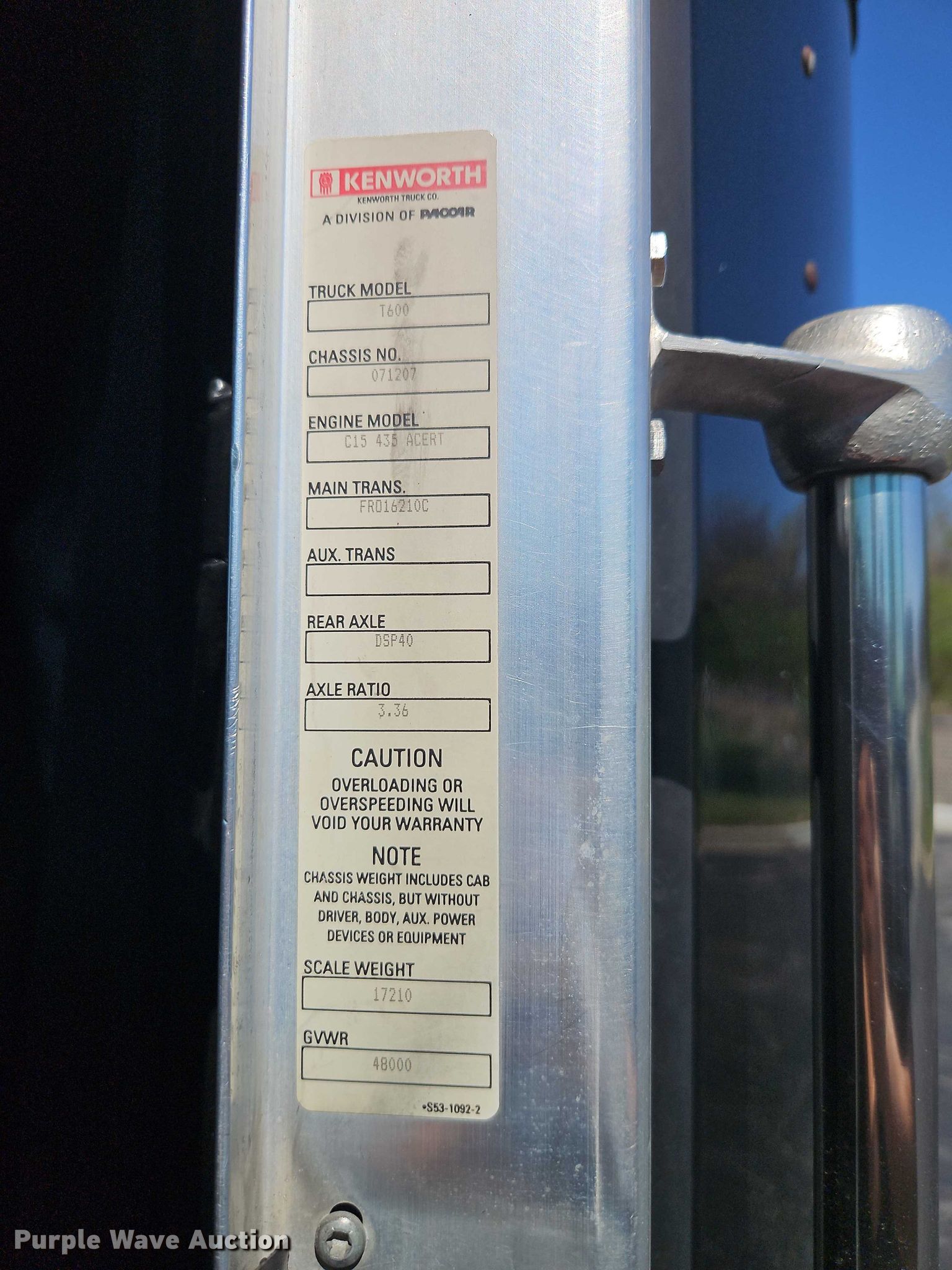 2005 Kenworth T600 semi truck. Miles: 643,012 on odometer, VIN: 1XKADB9X95J071207, Unit #: 051207A. Engine Caterpillar, Displacement: 14.6L, Cylinders: 6, Fuel type: Diesel, Engine brake. Transmission Eaton Fuller, Manual, Speed: 10. Chassis Axles: Tandem, Differential lock: Inter-axle, Suspension: Air Dump valves, Brakes: Air, GVWR: 48,000 lbs FAWR: 12,000 lbs, IAWR: 18,000 lbs, RAWR: 18,000 lbs. Interior AC, Heat, Heated mirrors, Cruise control, Air ride cab, Sleeper Kenworth AeroCab, Sleeper length: 60", Beds: Single, Rear climate control. Features Deck plate: Aluminum, Fifth wheel type: Air operated, Sliding, Fuel tank: Dual. Tires Size: 275/80R22.5. Notes Oil leak, Parts may be missing, Non-operational engine, Non-operational unit Unit must be towed or hauled. Nebraska title. Title distribution may be delayed up to 30 days from verification of funds. Sun Coast Resources. Grandview, MO 64030