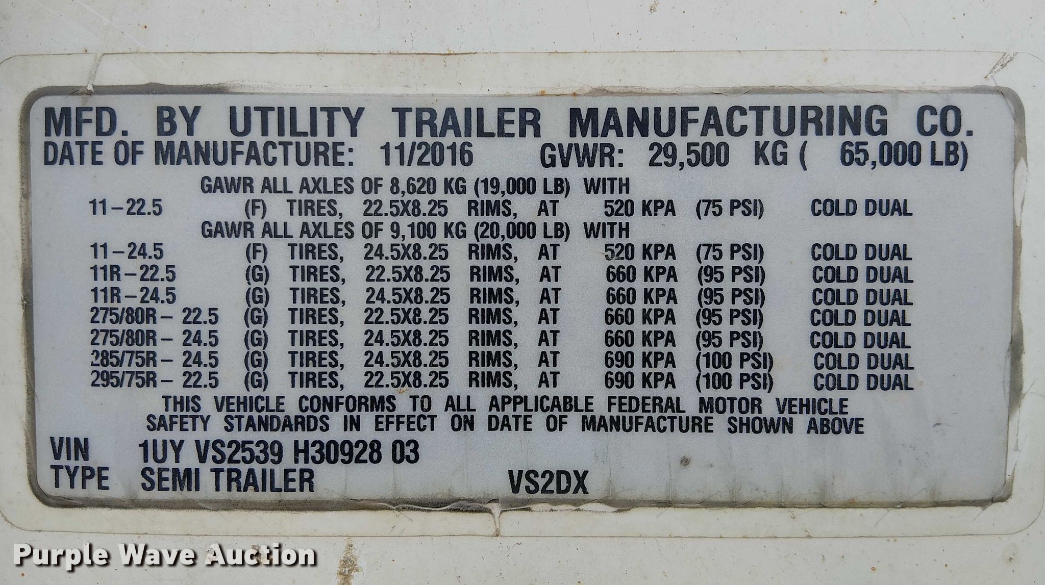 2017 Utility VS2DX dry van trailer. VIN: 1UYVS2539H3092803, Unit #: 87468205. Dimensions Overall Length: 53', Width: 102". Features Deck type: Aluminum, E-track rail system. Chassis Landing gear: Dual, Suspension: Air, Brakes: Air, Axles: Tandem Sliding, GVWR: 65,000 lbs, GAWR: 19,000 lbs. Tires Aluminum wheels, Steel wheels, Size: 295/75R22.5. Notes Semi not included. Repossessed item, stored at a secured facility. Please review REQUIRED REMOVAL INSTRUCTIONS. Titles will be distributed after confirmation of payment and removal. Oklahoma title. Title distribution may be delayed up to 30 days from verification of funds. Lender Owned. 10429 Pansy Road. Adelanto, CA 92301