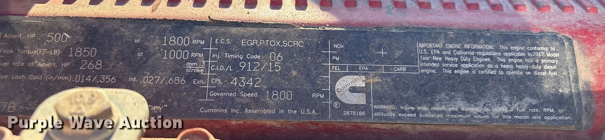 2018 Kenworth W900 semi truck. Miles: 309,311 on odometer, Hours: 14,344 on meter, VIN: 1XKWD49X3JJ202840, Unit #: 86832895. Engine Cummins X15 500, Serial: 80010724, Displacement: 15.0L, Cylinders: 6, Fuel type: Diesel, HP: 500, Engine brake. Transmission Eaton, Manual, Speed: 10. Chassis Axles: Tandem, Differential lock: Inter-axle, Suspension: Air Dump valves, Brakes: Air, Truck chassis: 16' 3". Interior AC, Heat, Heated mirrors, Power windows, Power locks, Cruise control, Air ride cab. Features Deck plate: Aluminum, Fifth wheel type: Fixed, Fuel tank: Dual. Tires Size: 11R24.5. Notes Dash warning indicator: Traction control, Pressure sensor, SAS Signal, YRS Sensor, Windshield chipped or cracked, Collision damage, Frame damage, Drive shaft disconnected, Air system issues, will not build pressure, Unit must be towed or hauled. Insurance salvage, stored at a secured facility. Please review REQUIRED REMOVAL INSTRUCTIONS. Titles will be distributed after confirmation of payment and removal. Mississippi salvage title. Mileage has not been verified. Exempt will be written in the odometer disclosure on the title. Title distribution may be delayed up to 30 days from verification of funds. Insurance Salvage. Florence, MS 39073