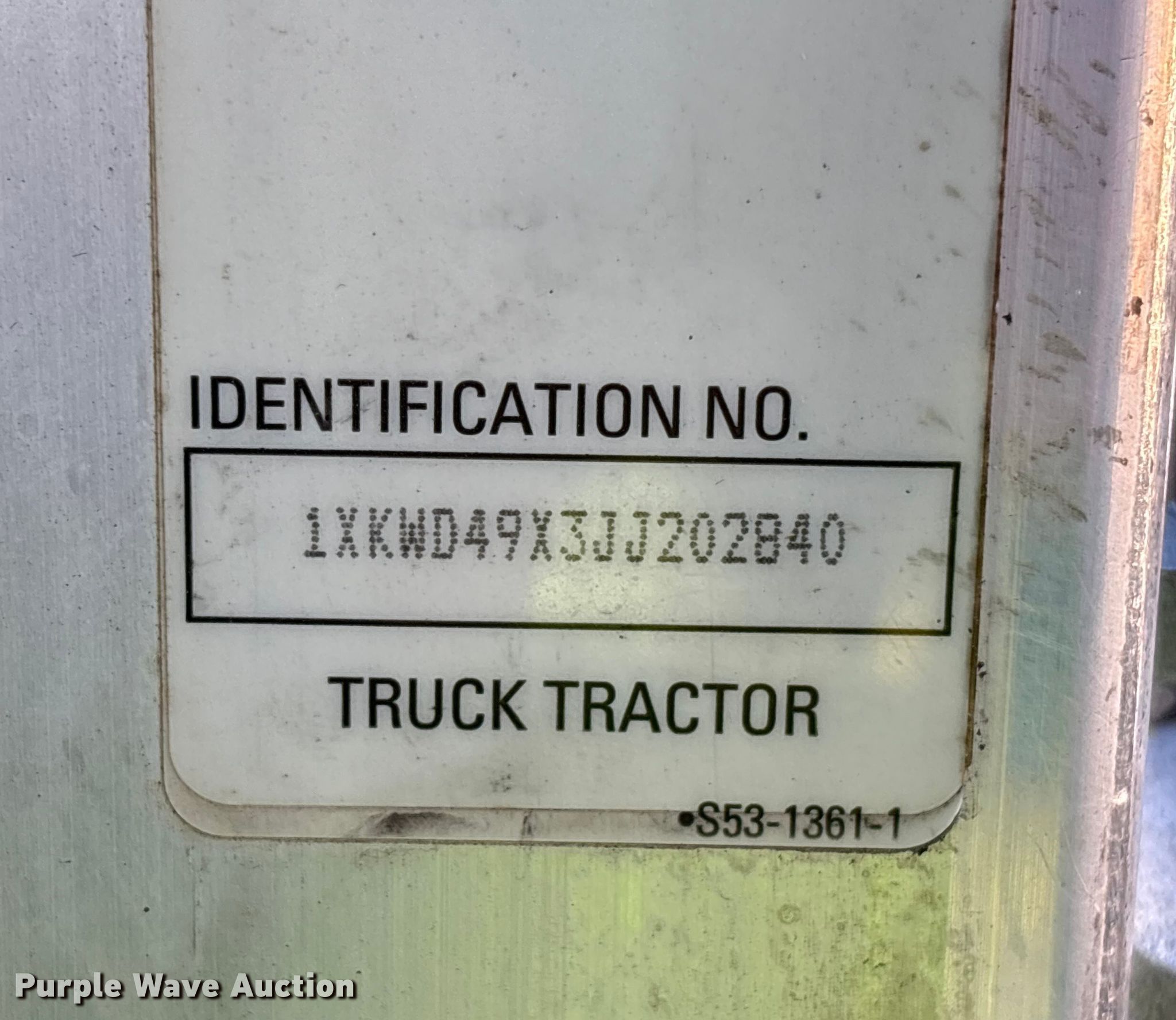 Purple Wave is selling a used Truck Tractor in Mississippi. This item is a 2018 Kenworth W900 semi truck with the following: Miles: 309,311 on odometer, Hours: 14,344 on meter, VIN: 1XKWD49X3JJ202840, Unit #: 86832895