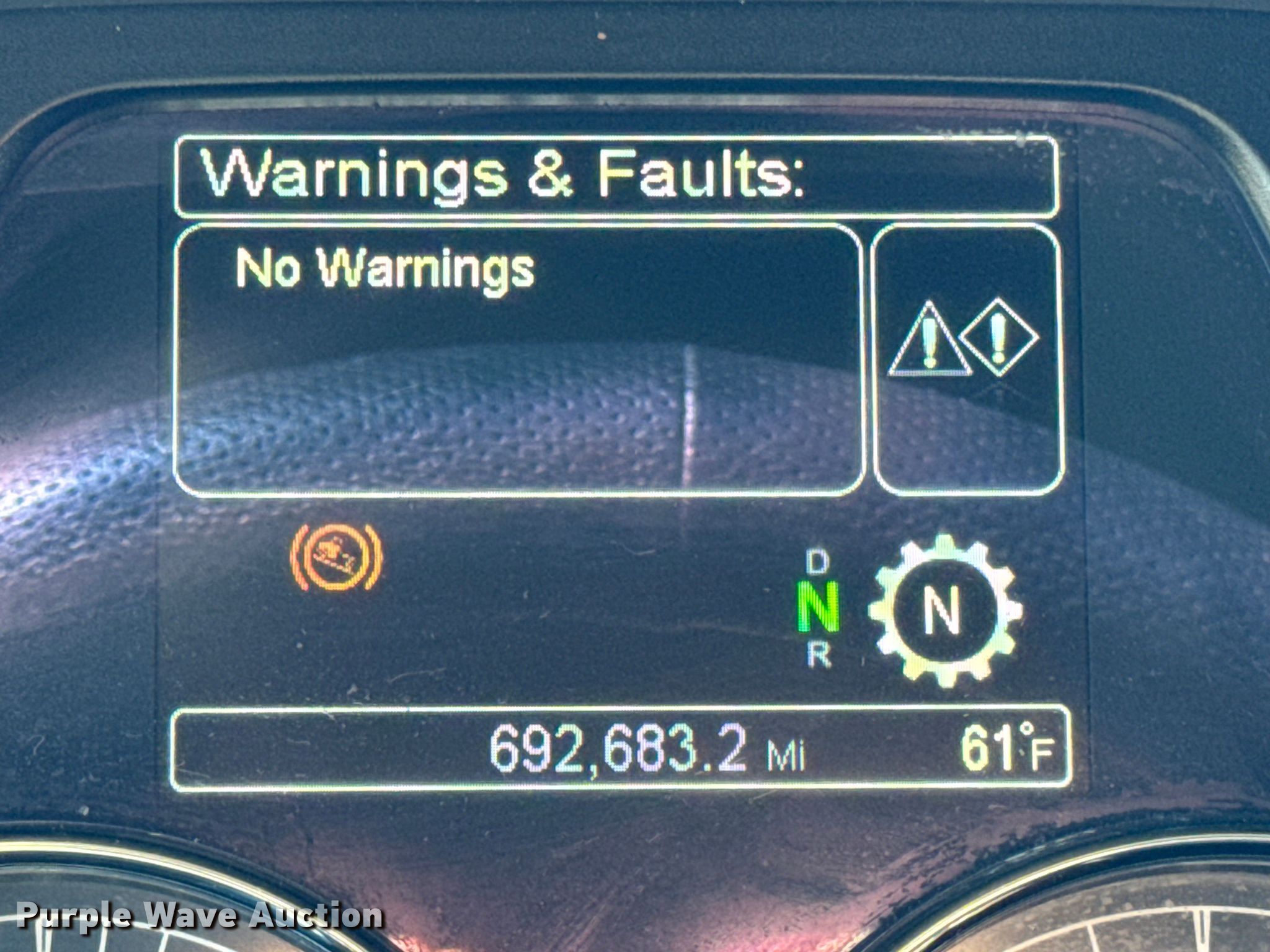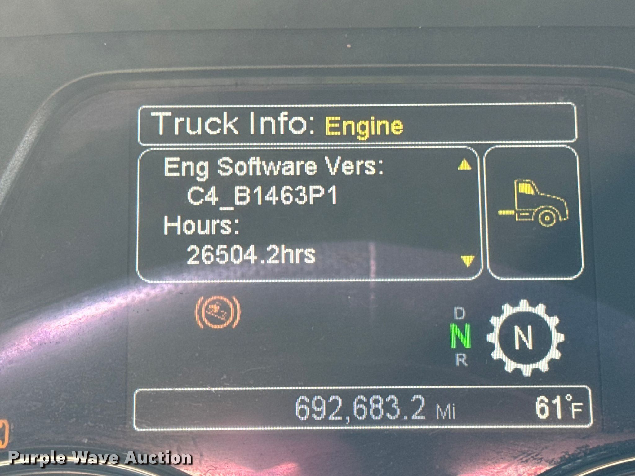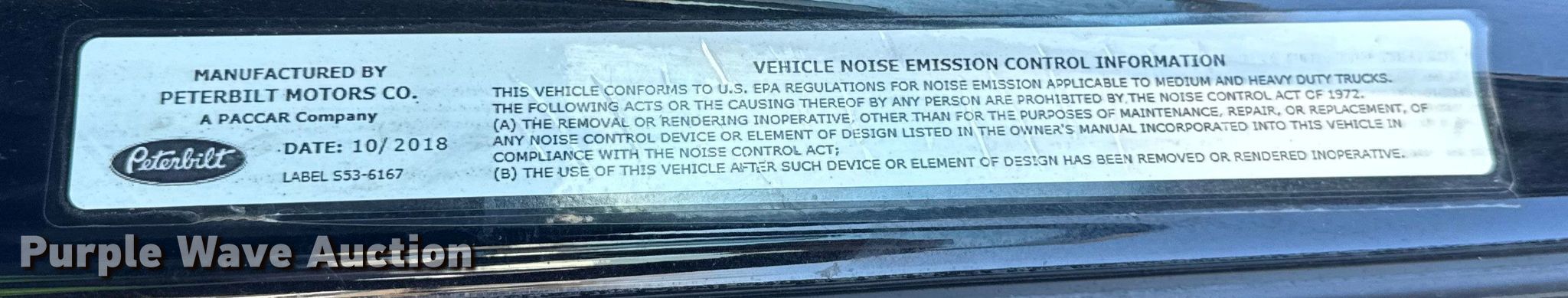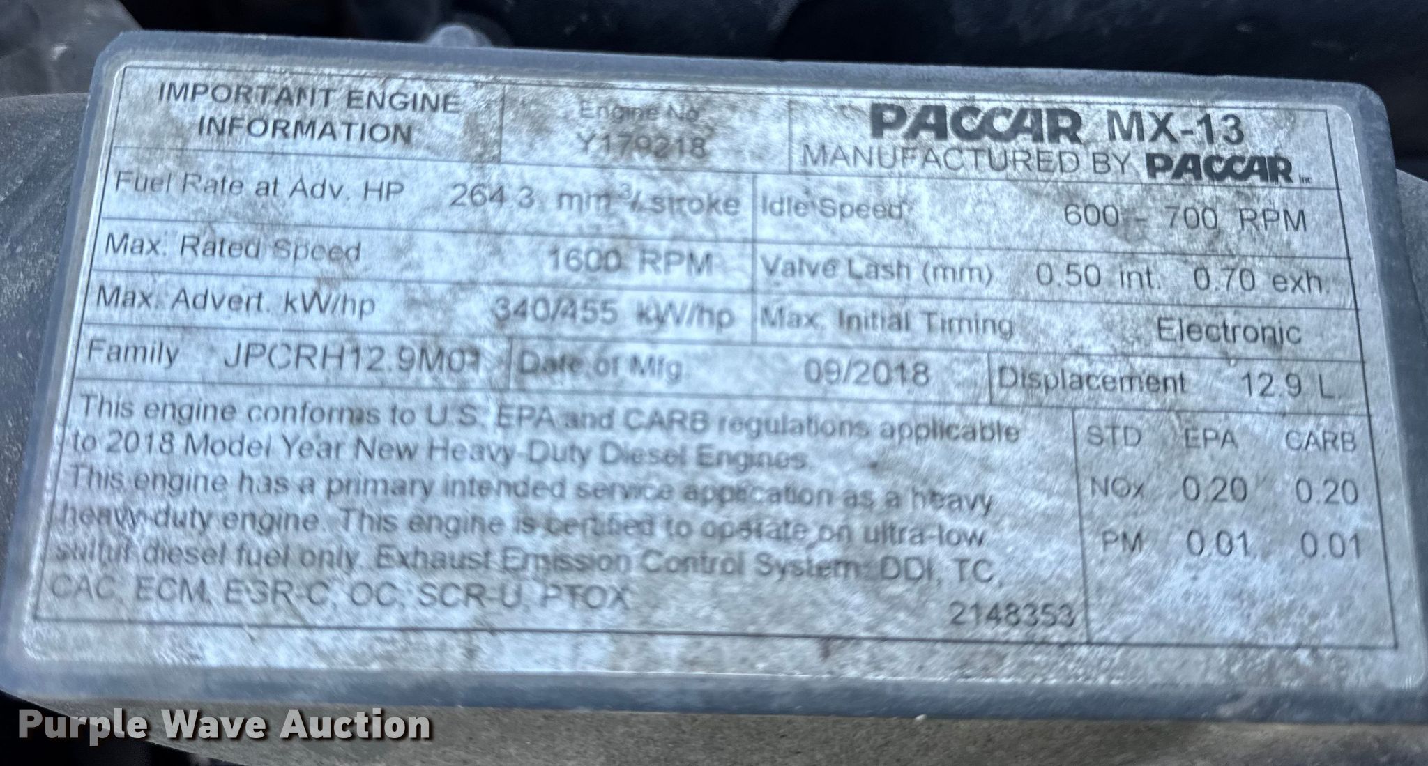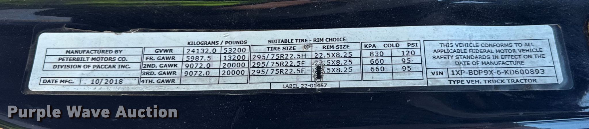 2019 Peterbilt 579 semi truck. Miles: 692,683 on odometer, Hours: 26,504 on meter, VIN: 1XPBDP9X6KD600893, Unit #: 97662995. Engine Paccar MX-13, Displacement: 12.9L, Cylinders: 6, Fuel type: Diesel, HP: 455, Engine brake. Transmission Automated manual. Chassis Axles: Tandem, Differential lock: Inter-axle, Suspension: Air Dump valves, Brakes: Air, GVWR: 53,200 lbs FAWR: 13,200 lbs, IAWR: 20,000 lbs, RAWR: 20,000 lbs. Interior AC, Heat, Heated mirrors, Power windows, Power locks, Cruise control, Air ride cab, Sleeper Sleeper length: 72", Beds: Double bunk, Rear climate control. Features Deck plate: Aluminum, Fifth wheel type: Air operated, Sliding, Fuel tank: Dual. Tires Size: 295/75R22.5. Notes Dash warning indicator: Check engine, Jump start required during on-site data collection. Repossessed item, stored at a secured facility. Please review REQUIRED REMOVAL INSTRUCTIONS. Titles will be distributed after confirmation of payment and removal. Indiana title. Title distribution may be delayed up to 30 days from verification of funds. Lender Owned. Bartlett, IL 60103