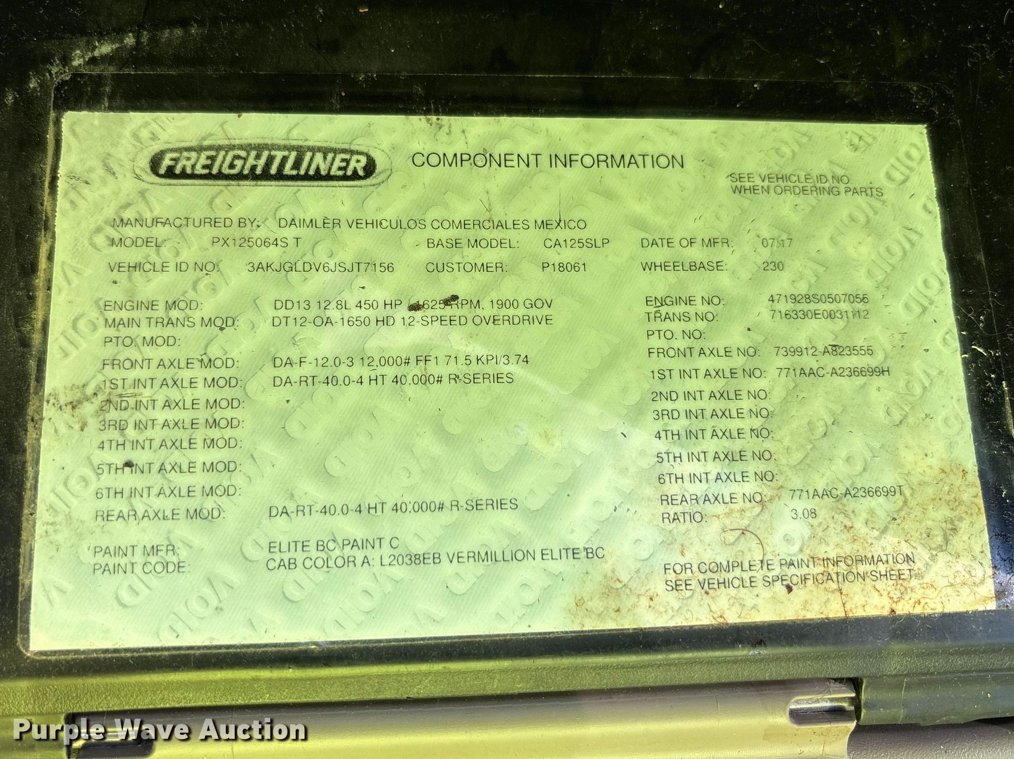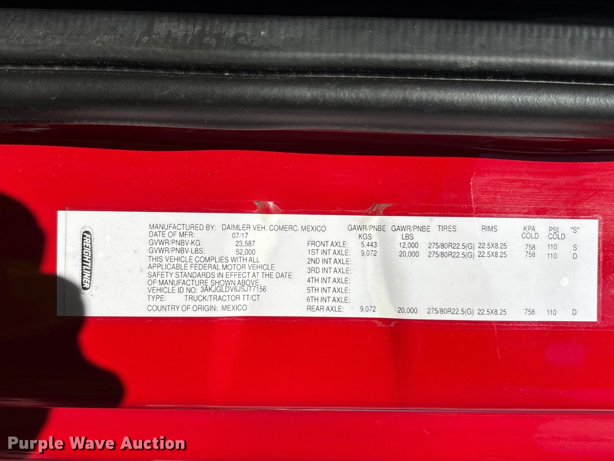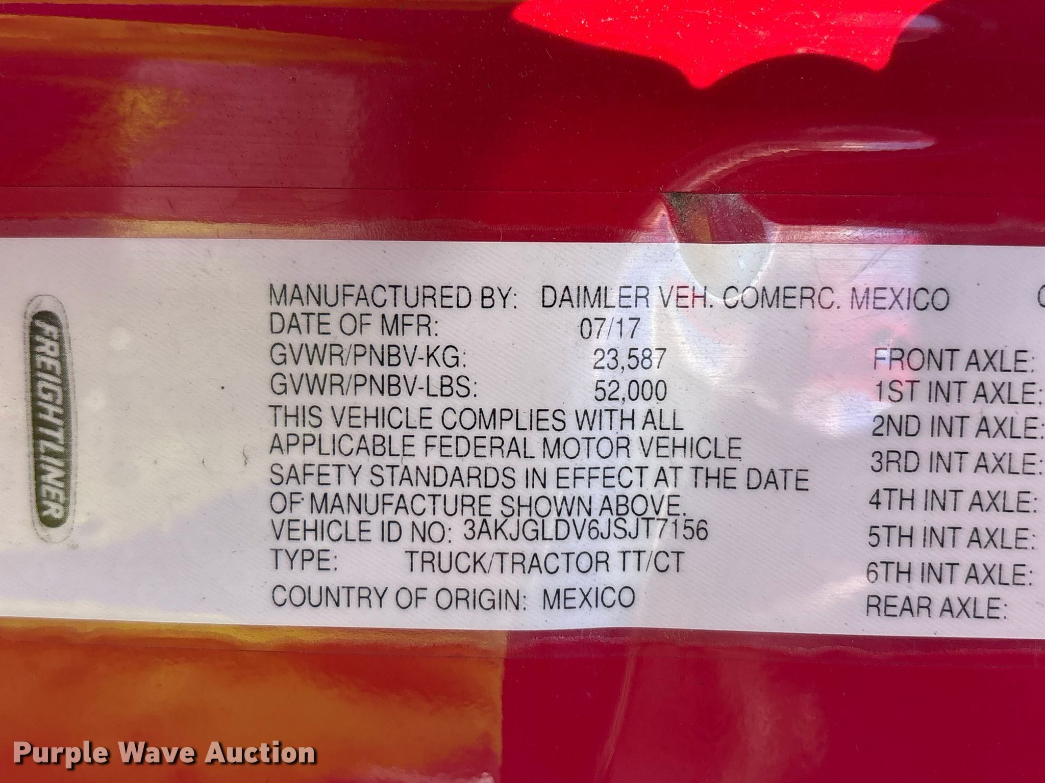 2018 Freightliner Cascadia semi truck. Miles: 895,340 on odometer, VIN: 3AKJGLDV6JSJT7156, Unit #: 98601725. Engine Detroit Diesel DD13, Displacement: 12.8L, Cylinders: 6, Fuel type: Diesel, Engine brake. Transmission Automated manual. Chassis Axles: Tandem, Gear ratio: 3.08, Differential lock: Inter-axle, Suspension: Air Dump valves, Brakes: Air, GVWR: 52,000 lbs FAWR: 12,000 lbs, IAWR: 20,000 lbs, RAWR: 20,000 lbs, Wheelbase: 230". Interior AC, Heat, Heated mirrors, Power windows, Power locks, Cruise control, Air ride cab, Brake controller, Sleeper Sleeper length: 72", Beds: Double bunk, Refrigerator, Rear climate control, Auxiliary power unit Comfort Pro. Features Deck plate: Aluminum, Fifth wheel type: Air operated, Sliding, Fuel tank: Dual. Tires Size: 295/75R22.5. Notes Dash warning indicator: Check engine, Stop engine, Jump start required during on-site data collection, Unknown operating condition auxiliary power unit, Unit in limp mode Will not exceed 5 MPH, Unit must be towed or hauled. Repossessed item, stored at a secured facility. Please review REQUIRED REMOVAL INSTRUCTIONS. Titles will be distributed after confirmation of payment and removal. Indiana title. Title distribution may be delayed up to 30 days from verification of funds. Lender Owned. 3600 East Washington Boulevard. Fort Wayne, IN 46803