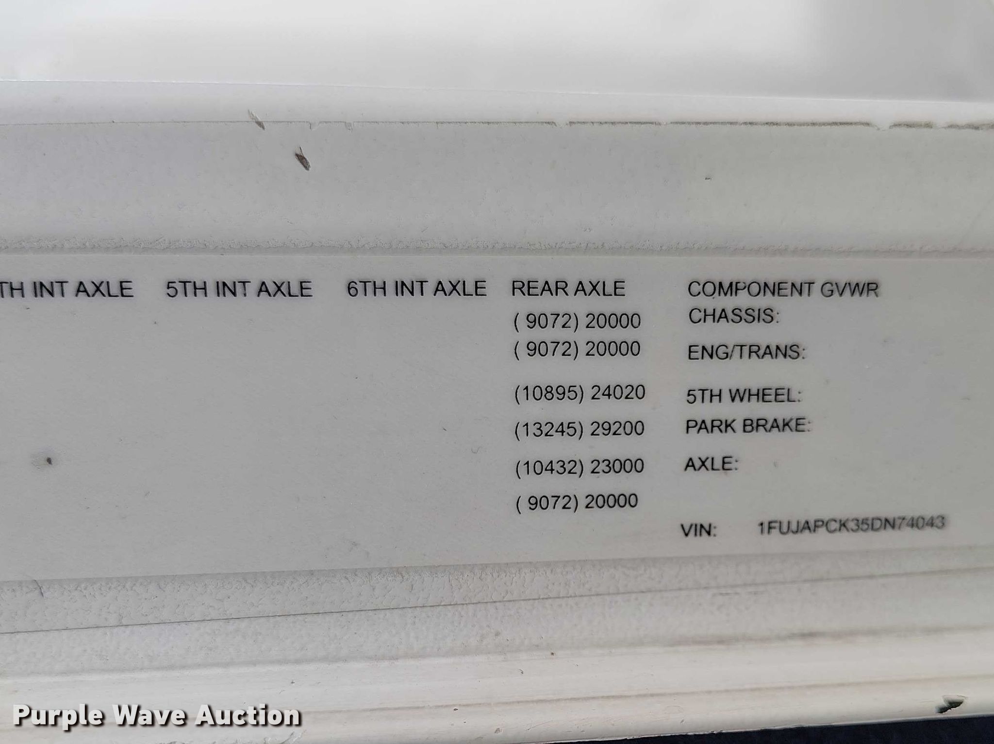 2005 Freightliner FLD semi truck. Miles: 64,548 on odometer, VIN: 1FUJAPCK35DN74043, Unit #: 75088275. Engine Cummins N14 Plus, Displacement: 14.0L, Cylinders: 6, Fuel type: Diesel, Engine brake. Transmission Eaton Fuller RTLO-16913A, Manual, Speed: 13. Chassis Axles: Tandem, Differential lock: Inter-axle, Suspension: Air Dump valves, Brakes: Air, GVWR: 52,000 lbs FAWR: 12,000 lbs, IAWR: 20,000 lbs, RAWR: 20,000 lbs. Interior AC, Heat, Heated mirrors, Power windows, Cruise control, Air ride cab, Sleeper Sleeper length: 72", Beds: Double bunk, Fold out sofa, TV, Rear climate control. Features Deck plate: Steel, Fifth wheel type: Air operated, Sliding, Fuel tank: Dual. Tires Size: 285/75R24.5. Notes Jump start required during on-site data collection, Fifth wheel air lines removed. Repossessed item, stored at a secured facility. Please review REQUIRED REMOVAL INSTRUCTIONS. Titles will be distributed after confirmation of payment and removal. Wyoming title. Title distribution may be delayed up to 30 days from verification of funds. Lender Owned. 2600 Salt Creek Highway. Casper, WY 82601