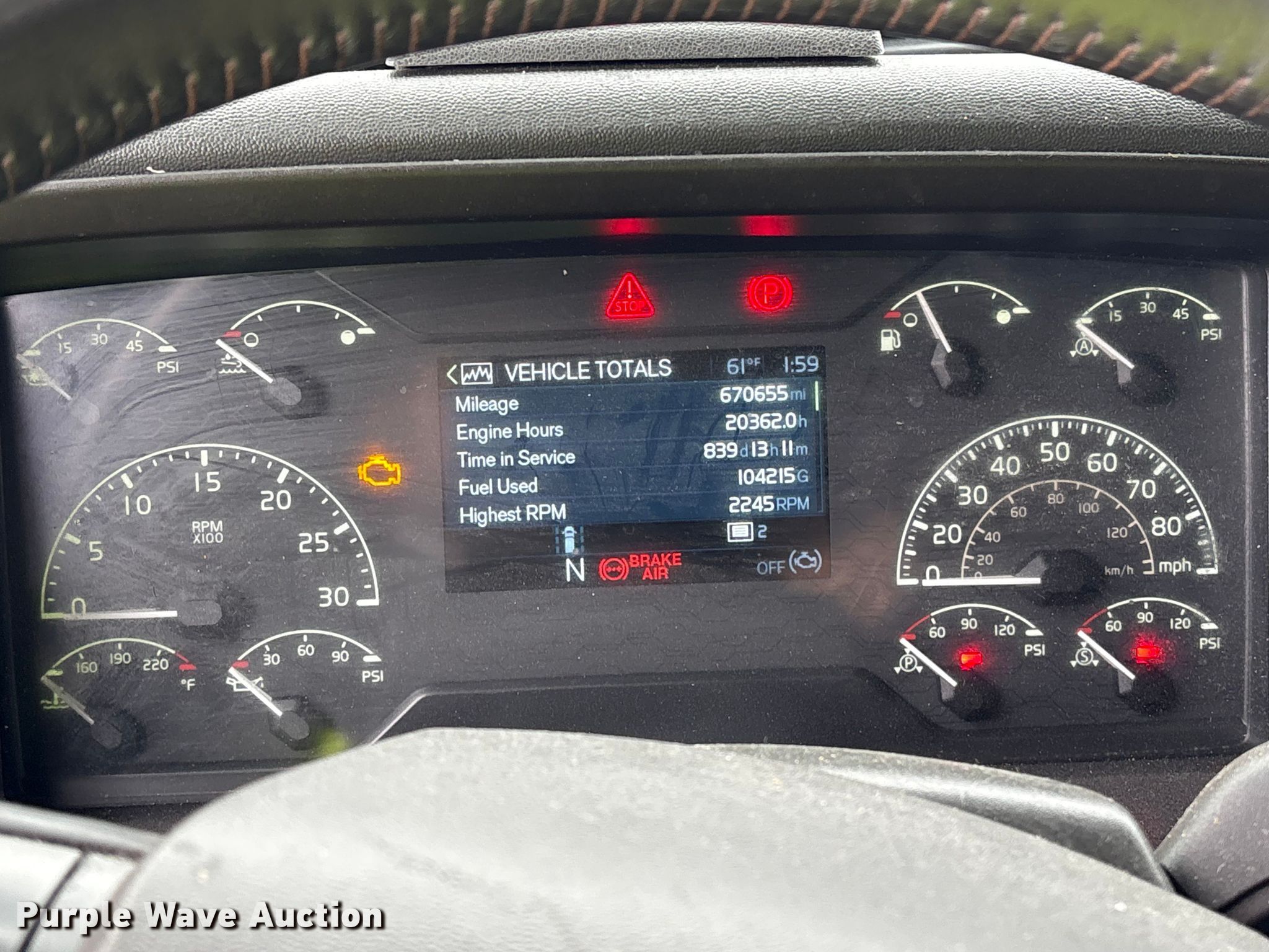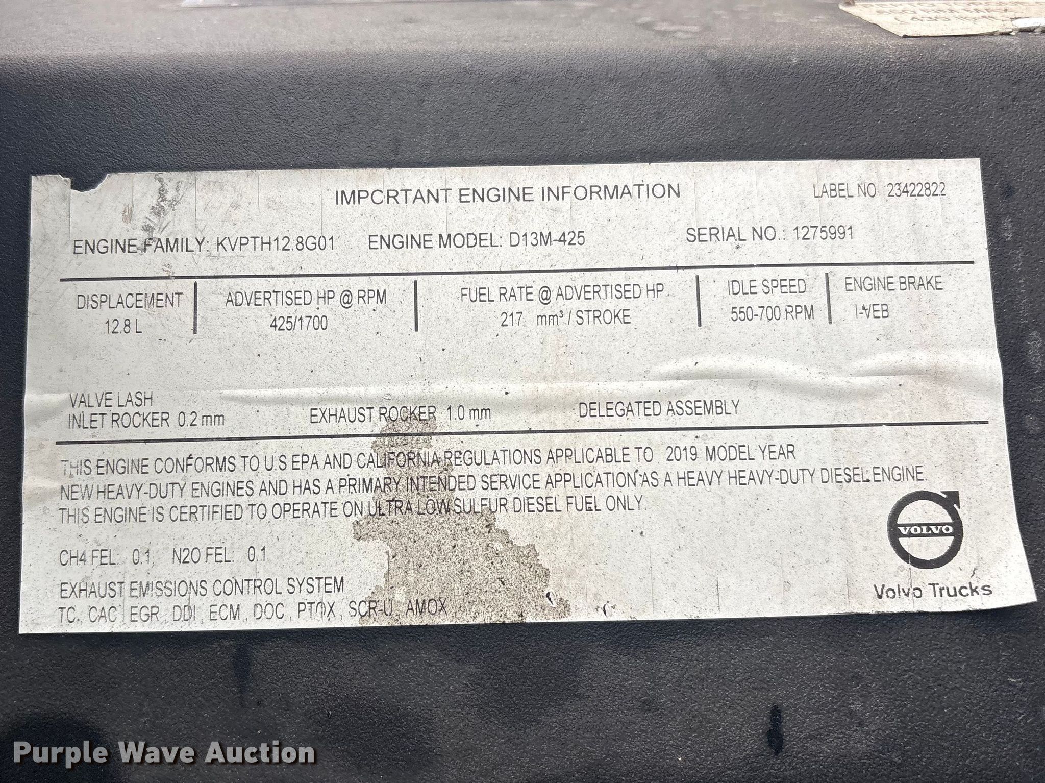 2020 Volvo VNL semi truck. Miles: 670,655 on odometer, Hours: 20,362 on meter, VIN: 4V4NC9EH4LN265838, Unit #: 76228445. Engine Volvo D13M-425, Serial: 1275991, Displacement: 12.8L, Cylinders: 6, Fuel type: Diesel, HP: 425, Engine brake. Transmission Automated manual. Chassis Axles: Tandem, Differential lock: Inter-axle, Suspension: Air Dump valves, Brakes: Air, GVWR: 51,200 lbs FAWR: 13,200 lbs, IAWR: 19,000 lbs, RAWR: 19,000 lbs. Interior AC, Heat, Heated mirrors, Power windows, Power locks, Cruise control, Air ride cab, Sleeper Sleeper length: 67", Beds: Double bunk, TV, Refrigerator, Microwave, Rear climate control, Auxiliary power unit Thermo King, Engine Yanmar TK270VFM.. Features Deck plate: Aluminum, Fifth wheel type: Air operated, Sliding, Fuel tank: Dual. Tires Size: 295/75R22.5. Notes Dash warning indicator: Check engine, Stop engine, Windshield chipped or cracked, Jump start required during on-site data collection. Repossessed item, stored at a secured facility. Please review REQUIRED REMOVAL INSTRUCTIONS. Titles will be distributed after confirmation of payment and removal. Georgia title. Title distribution may be delayed up to 30 days from verification of funds. Lender Owned. 2408 West 21st Street South. Tulsa, OK 74107