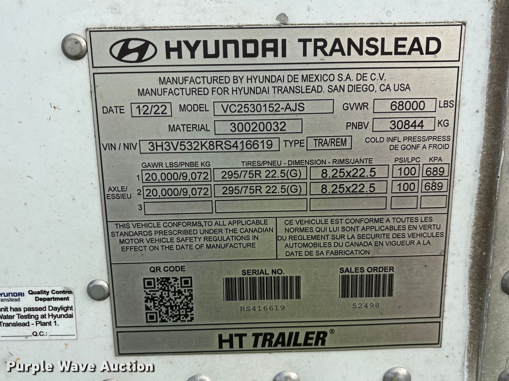 Purple Wave is selling a used Dry Van Trailer in North Carolina. This item is a 2024 Hyundai Translead dry van trailer with the following: VIN: 3H3V532K8RS416619, Unit #: 76609905