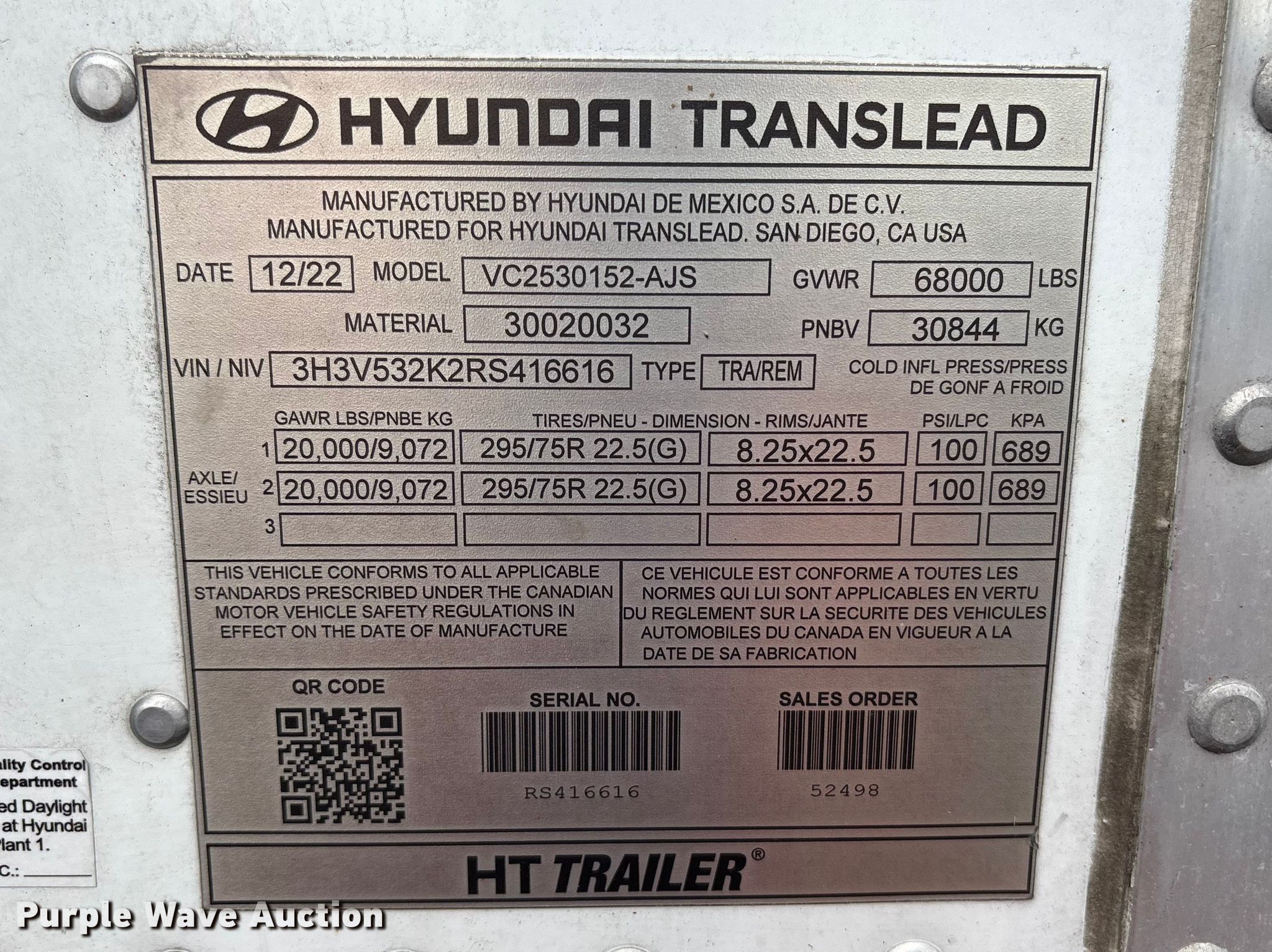 Purple Wave is selling a used Dry Van Trailer in Pennsylvania. This item is a 2024 Hyundai VC2530152-AJS dry van trailer with the following: VIN: 3H3V532K2RS416616, Unit #: 79891915