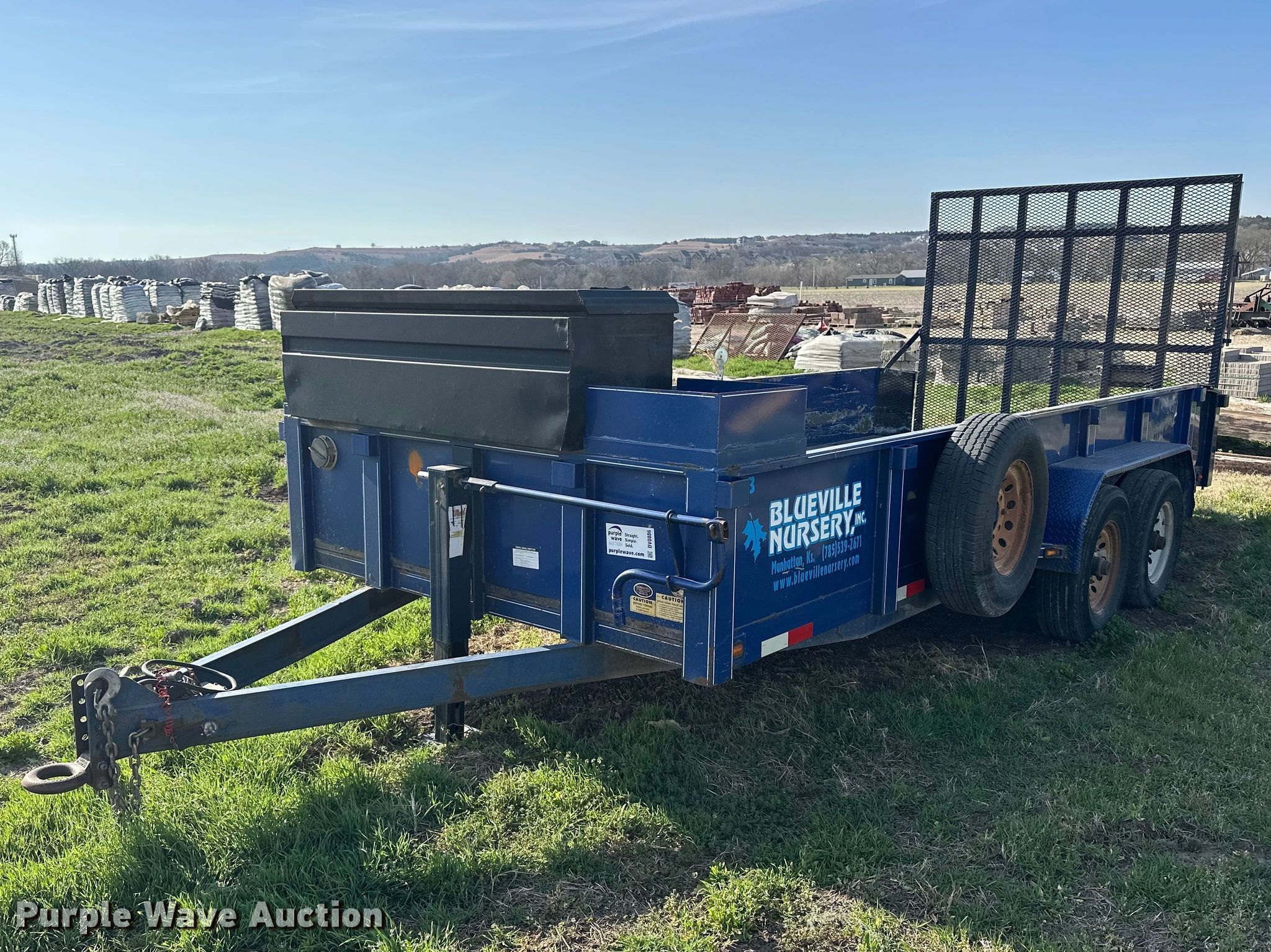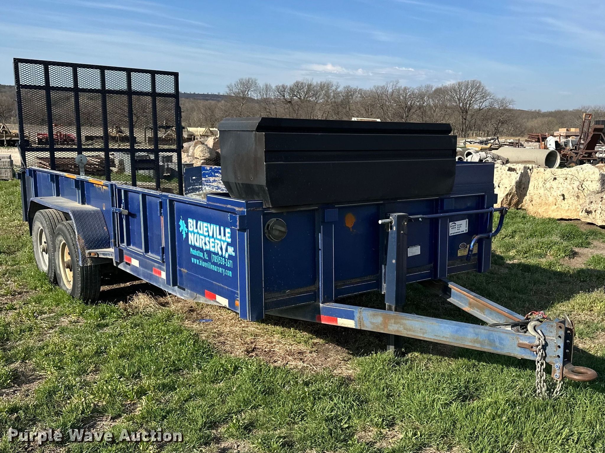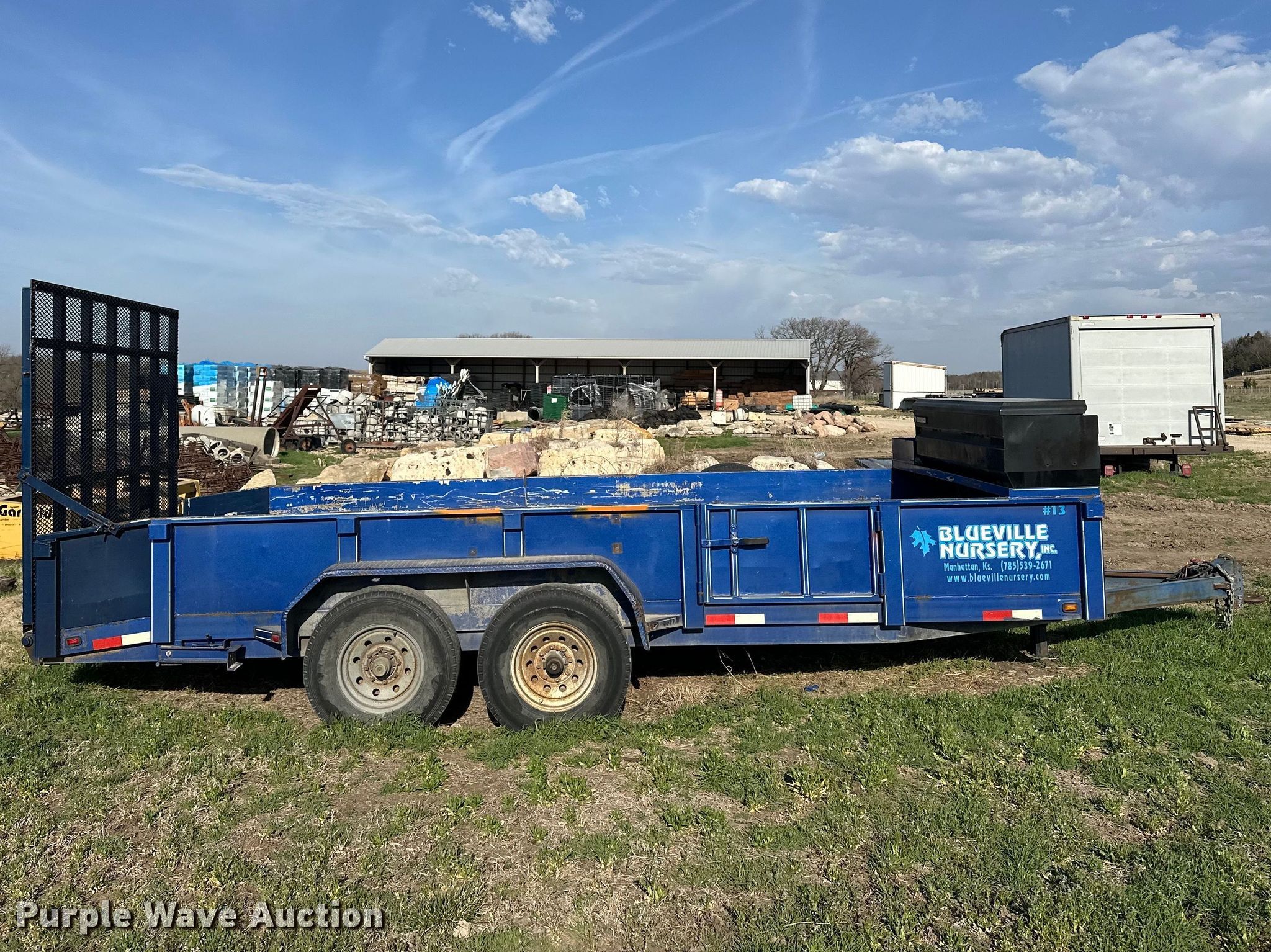2015 Titan utility trailer. VIN: 4TGF18207F1073034, Unit #: 13. Dimensions Overall Length: 22', Width: 102", Deck Length: 18', Width: 82", Side height: 20", Tail length: 24', Ramps: Manual Length: 6'. Features Deck type: Wood. Chassis Hitch: Pintle, Landing gear: Single, Suspension: Torsion, Brakes: Electric, Axles: Tandem. Tires Steel wheels, Size: ST235/80R16. Kansas title. Title distribution may be delayed up to 14 days from verification of funds. Blueville Landscape. Manhattan, KS 66503