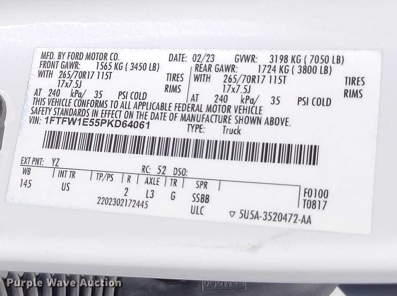 Purple Wave is selling a used 1/2 Ton Pickup or Van in Colorado. This item is a 2023 Ford F150 Crew Cab pickup truck with the following: Miles: 84,983 on odometer, Hours: 3,220 on meter, VIN: 1FTFW1E55PKD64061, Unit #: 02.977