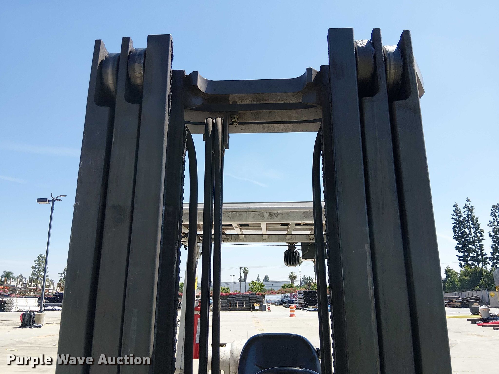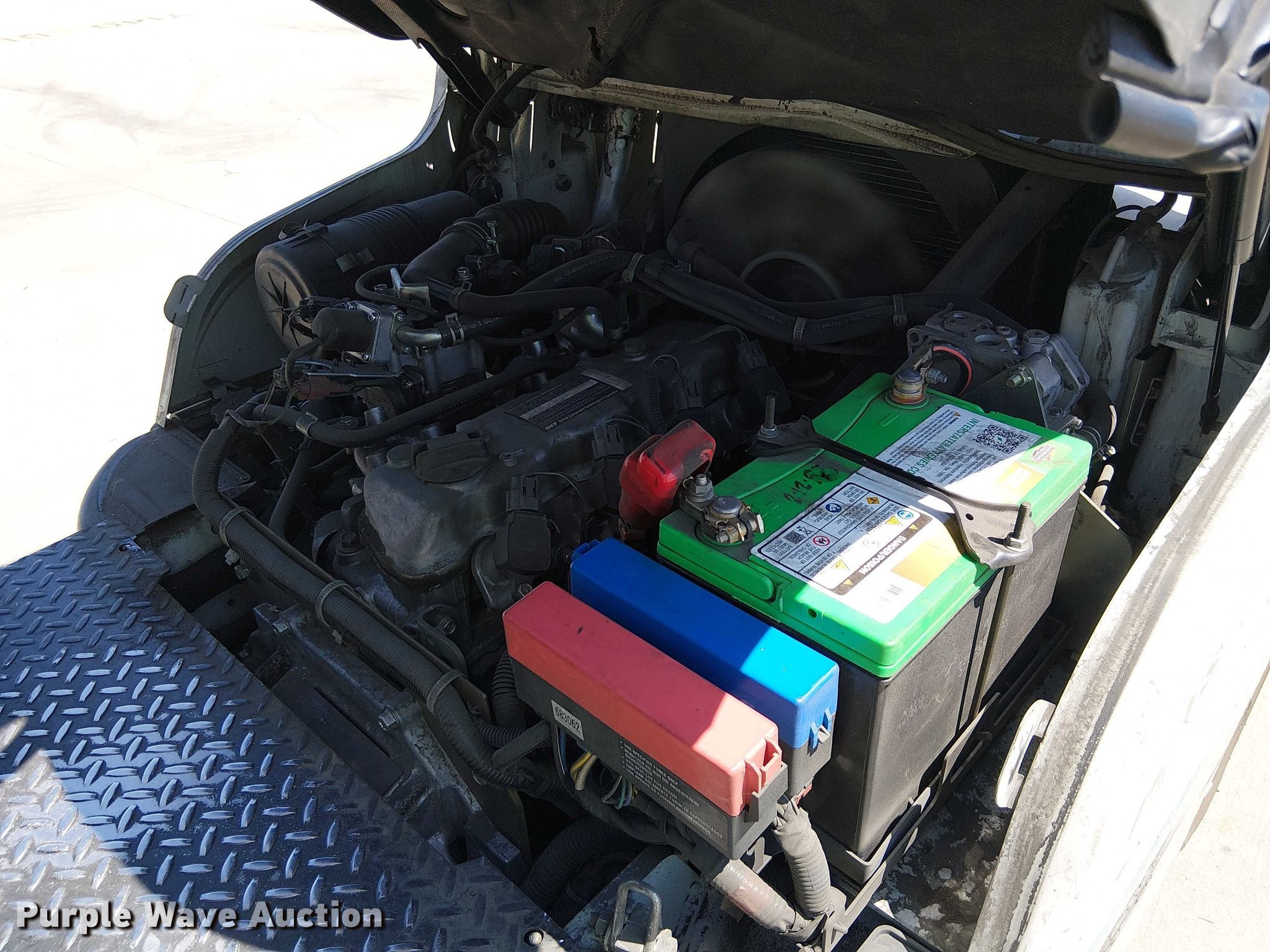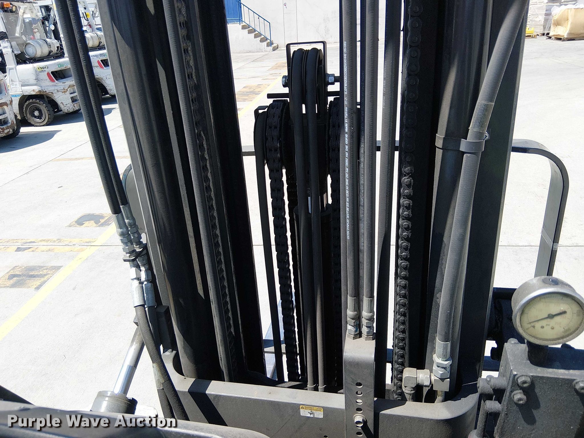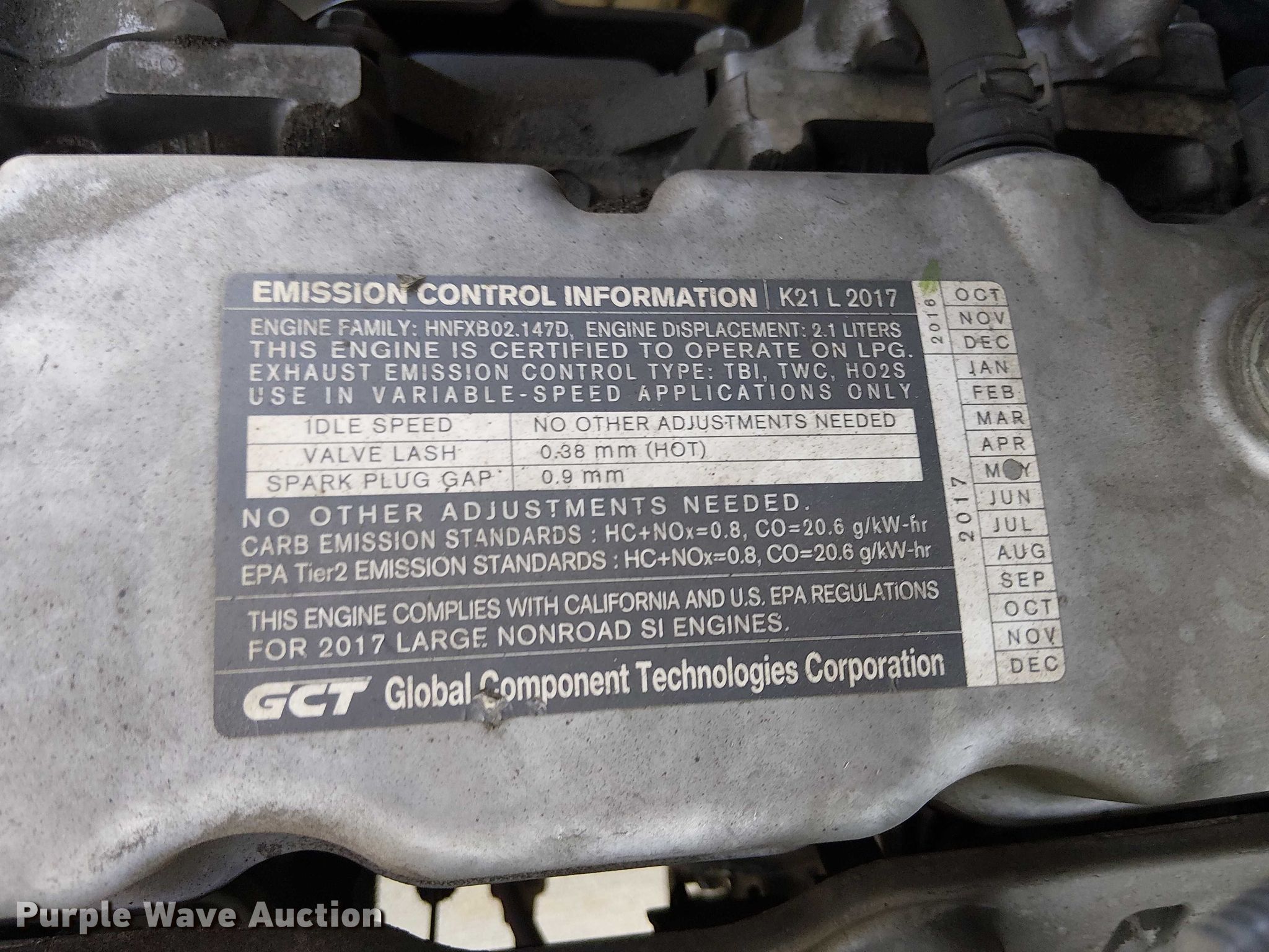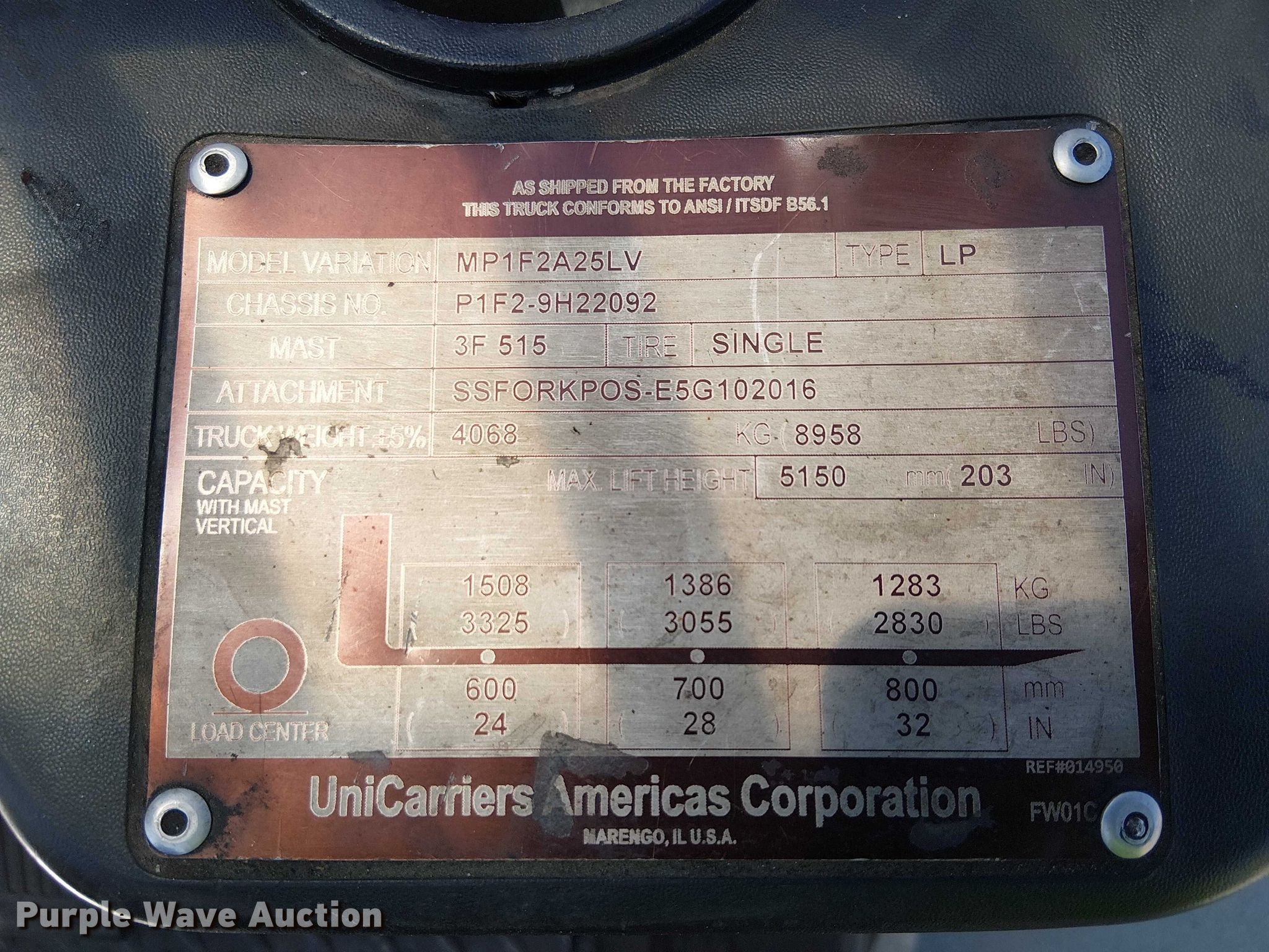 2017 UniCarriers PF50 forklift. Hours: 10,407 on meter, Miles or hours may vary, unit still in use, Serial: P1F2-9H22092, Unit #: SFS3136. Engine GCT K21L, Displacement: 2.1L, Cylinders: 4, Fuel type: LPG LP bottle: Not included. Transmission Automatic. Operators station OROPS. Features Maximum lift capacity: 3,325 lbs, Maximum lift height: 203", Collapsed mast height: 88", Mast stages: 3, Side shift, Mast tilt, Fork positioner, Fork length: 48". Tires Front: 7.00-12, Rear: 6.00-9, Solid. Ferguson. Pomona, CA 91766