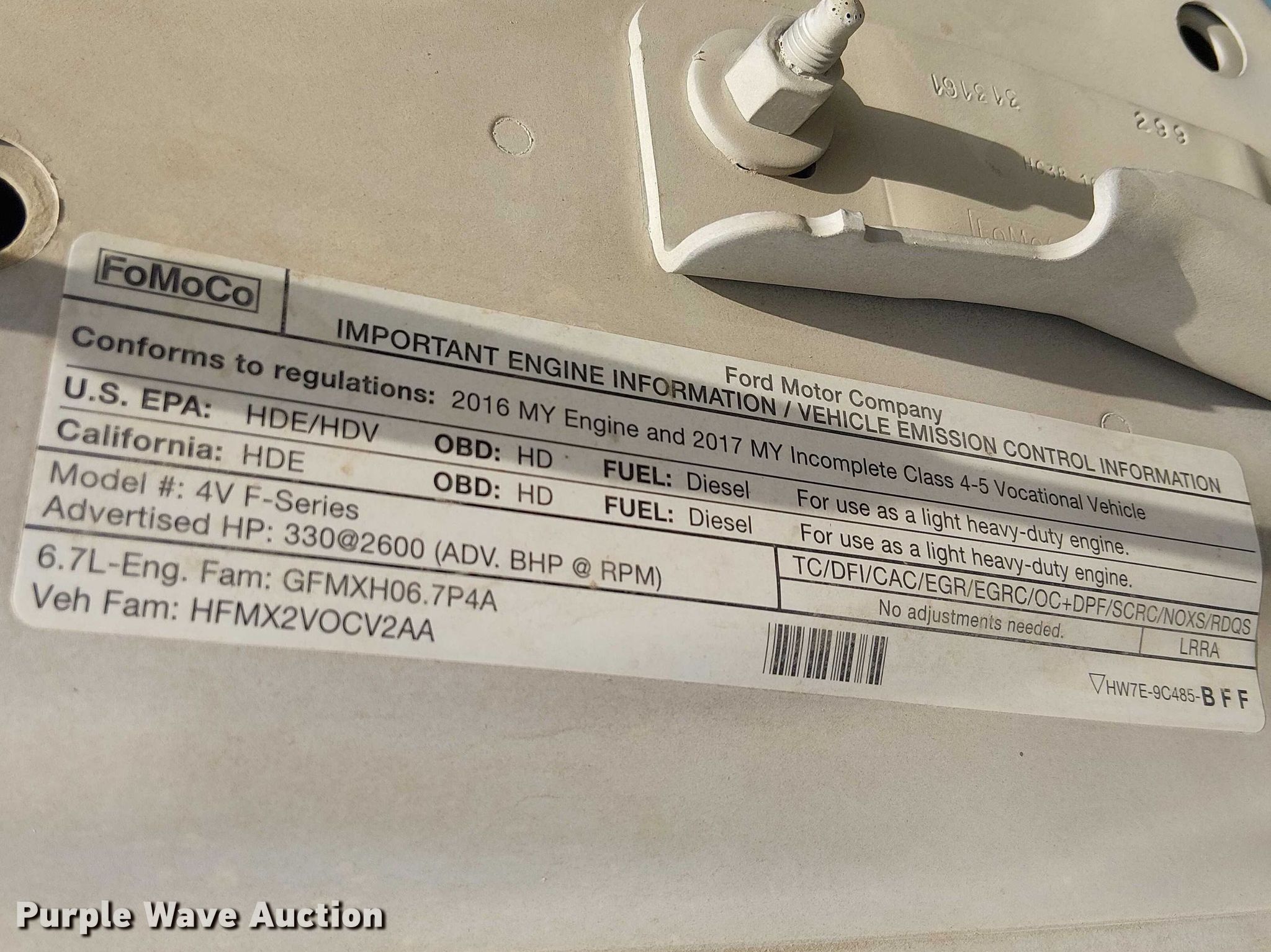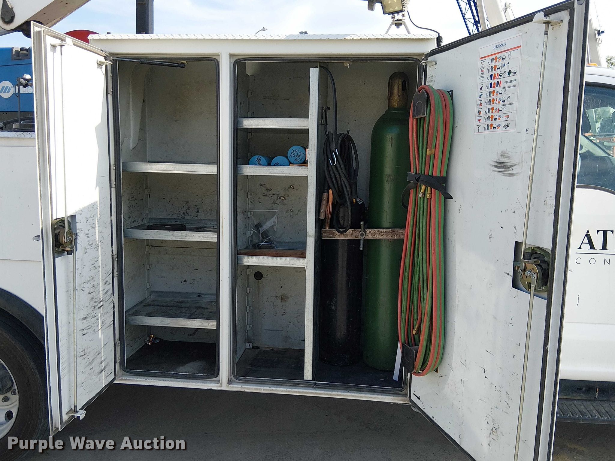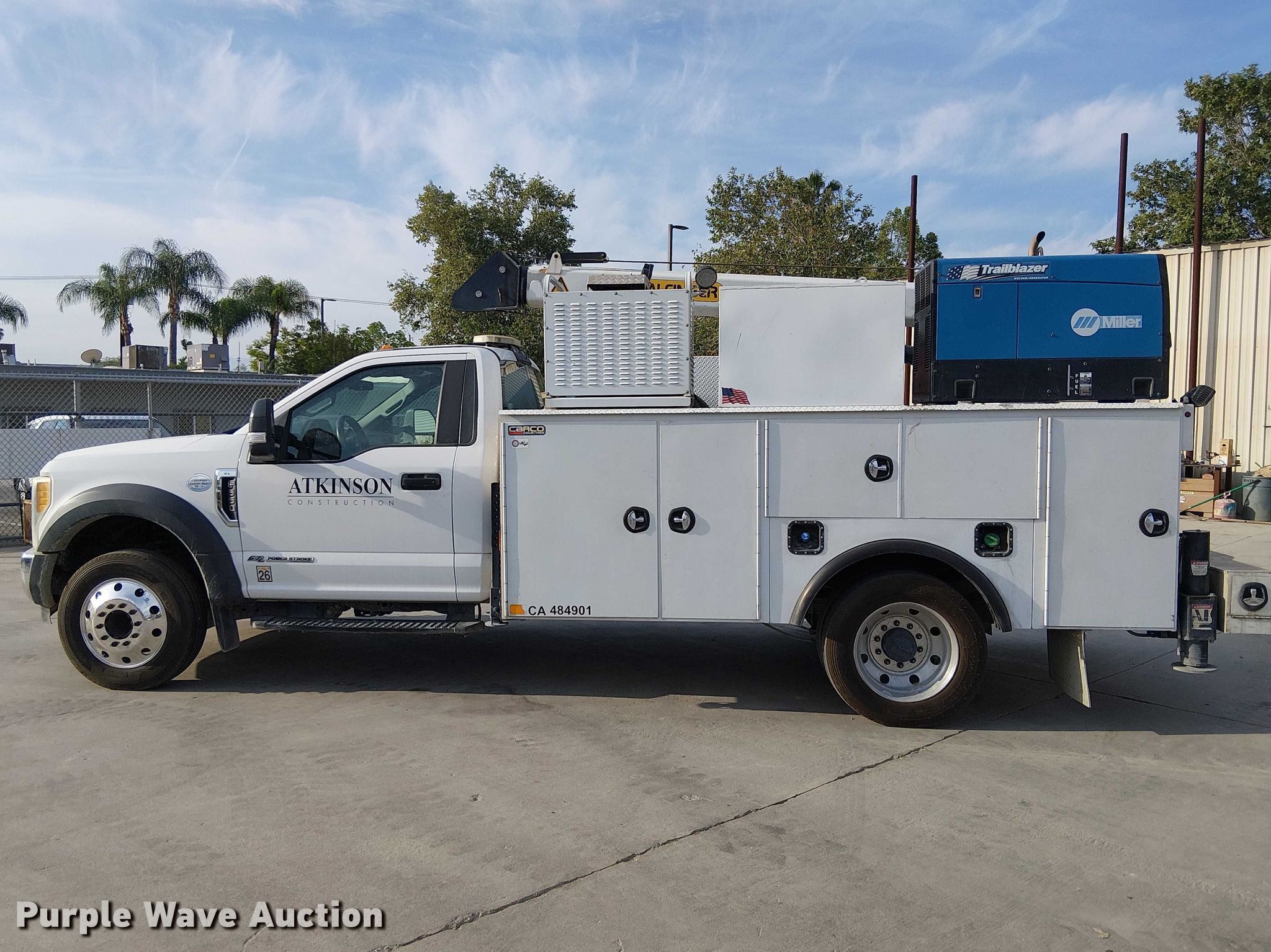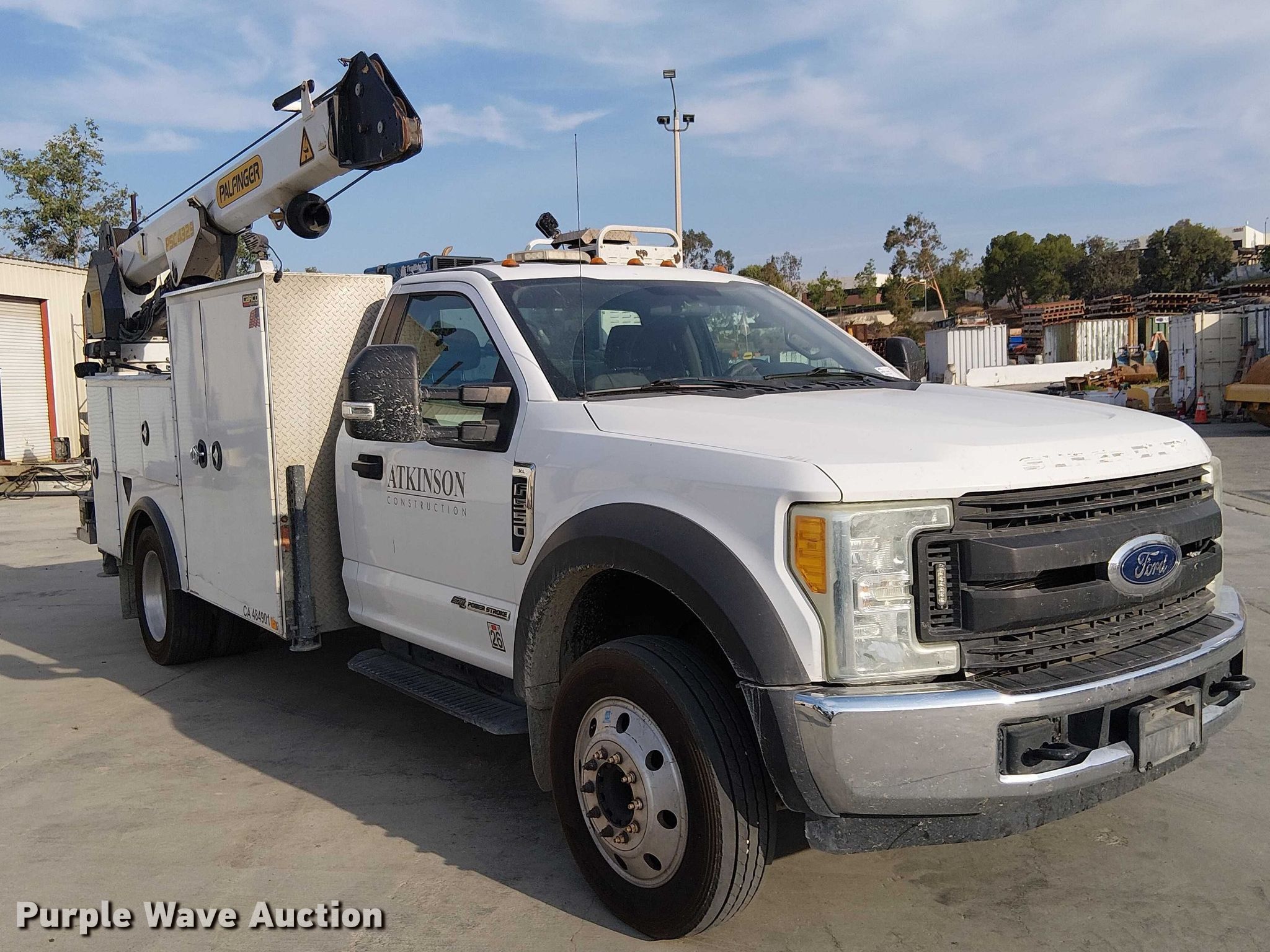 2017 Ford F550 utility / service truck. Miles: 222,261 on odometer, VIN: 1FDUF5GT3HEC09689. Engine Displacement: 6.7L, Cylinders: 8, Fuel type: Diesel. Transmission Automatic. Chassis Axles: Single, Suspension: Spring, Brakes: Hydraulic, GVWR: 19,500 lbs. Interior AC, Heat, Heated mirrors, Power windows, Power locks, Cruise control, Auxiliary controls, Brake controller. Features Bed Utility bed, Palfinger PCB 43, Serial: CB00064, Length: 11', Width: 94", Torch bottle rack Tanks not included, Welder Miller Trailblazer 302, Fuel type: Diesel, Welder type: Tig, Wire, Volts: 120/240, Air compressor, Oil/lube system Hose reels, Reservoirs Grease, (2) fuel tanks Nozzles, Pump, Crane Palfinger PSC 4329, Maximum boom length: 33' Maximum lift capacity: 4,370 lbs, (2) jack stands. Tires Size: 225/70R19.5, Brand: Hankook. California title. Title distribution may be delayed up to 30 days from verification of funds. Guy F. Atkinson ,LLC. Corona, CA 92879