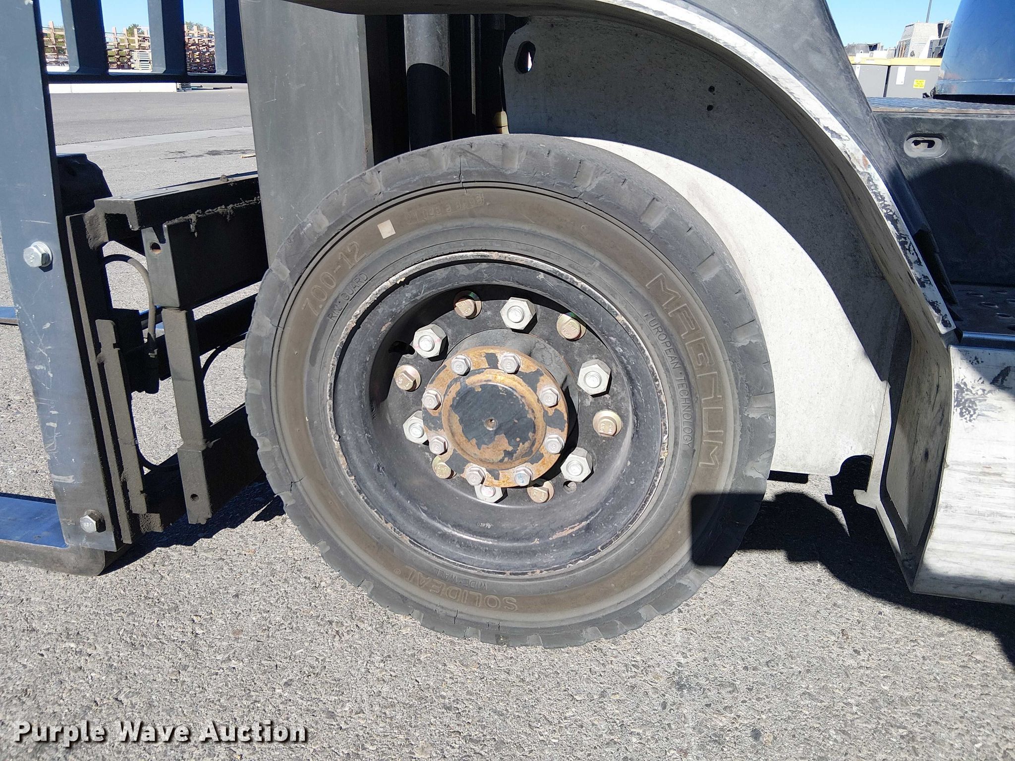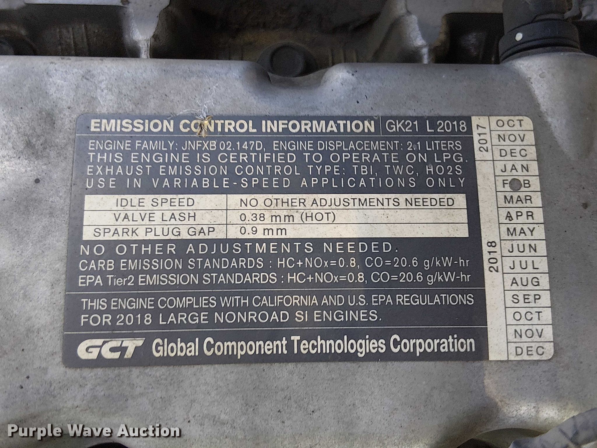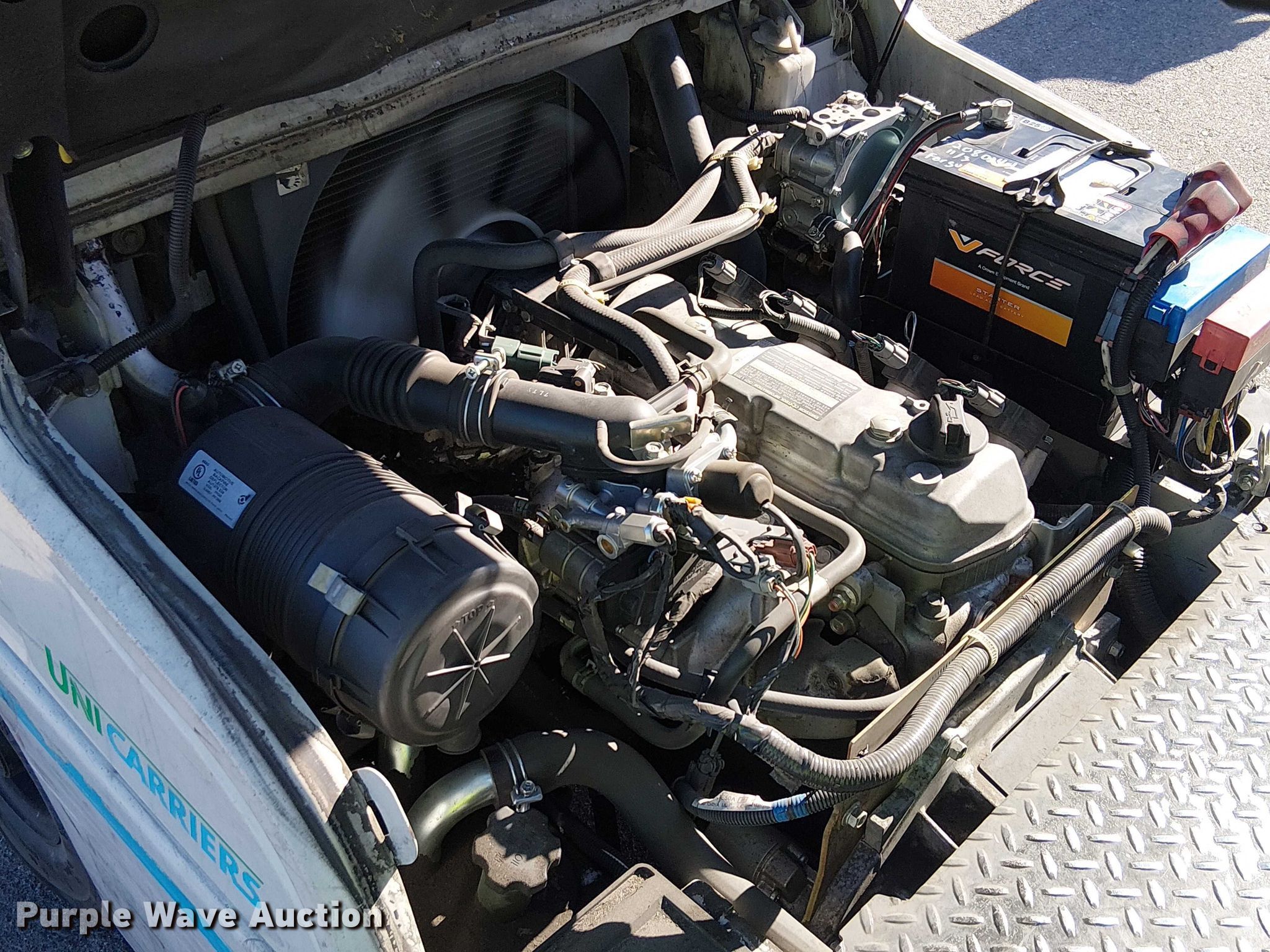 2018 UniCarriers PF50 forklift. Hours: 10,169 on meter, Miles or hours may vary, unit still in use, Serial: P1F2-9H23671, Unit #: SFS3129. Engine GCT K21L, Displacement: 2.1L, Cylinders: 4, Fuel type: LPG LP bottle: Not included. Transmission Powershift. Operators station OROPS, Canopy. Features Maximum lift capacity: 3,325 lbs, Maximum lift height: 203", Collapsed mast height: 88", Mast stages: 3, Side shift, Mast tilt, Fork positioner, Fork length: 48". Tires Front: 7.00-12, Rear: 6.00-9, Solid. Notes Warning indicator: Master warning. Ferguson. Henderson, NV 89011