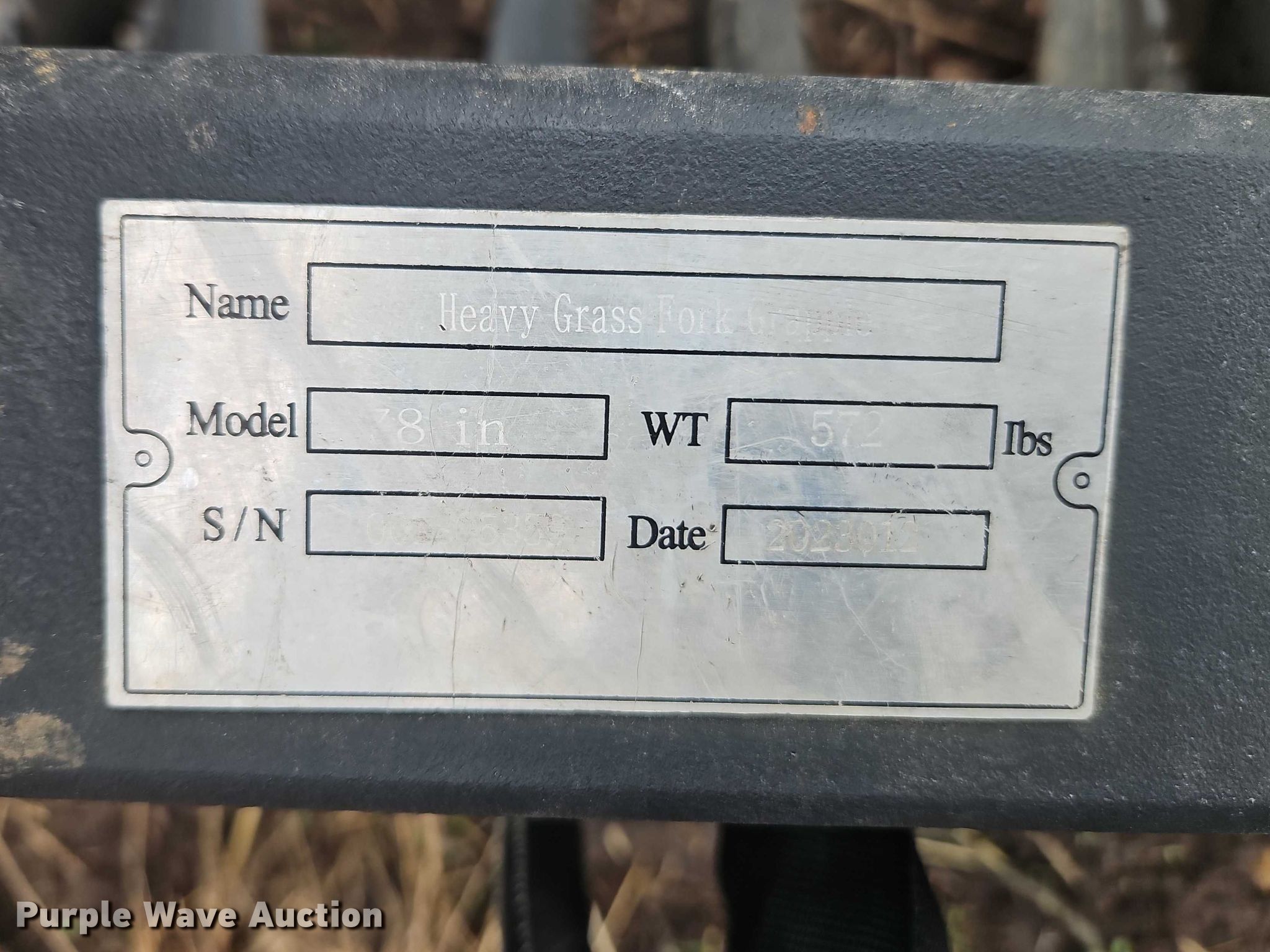Purple Wave is selling a used Skid Steer Attach. in Missouri. This item is a Heavy Grass Fork Grapple 78 in skid steer grapple bucket with the following: Serial: 001805359, Width: 78"