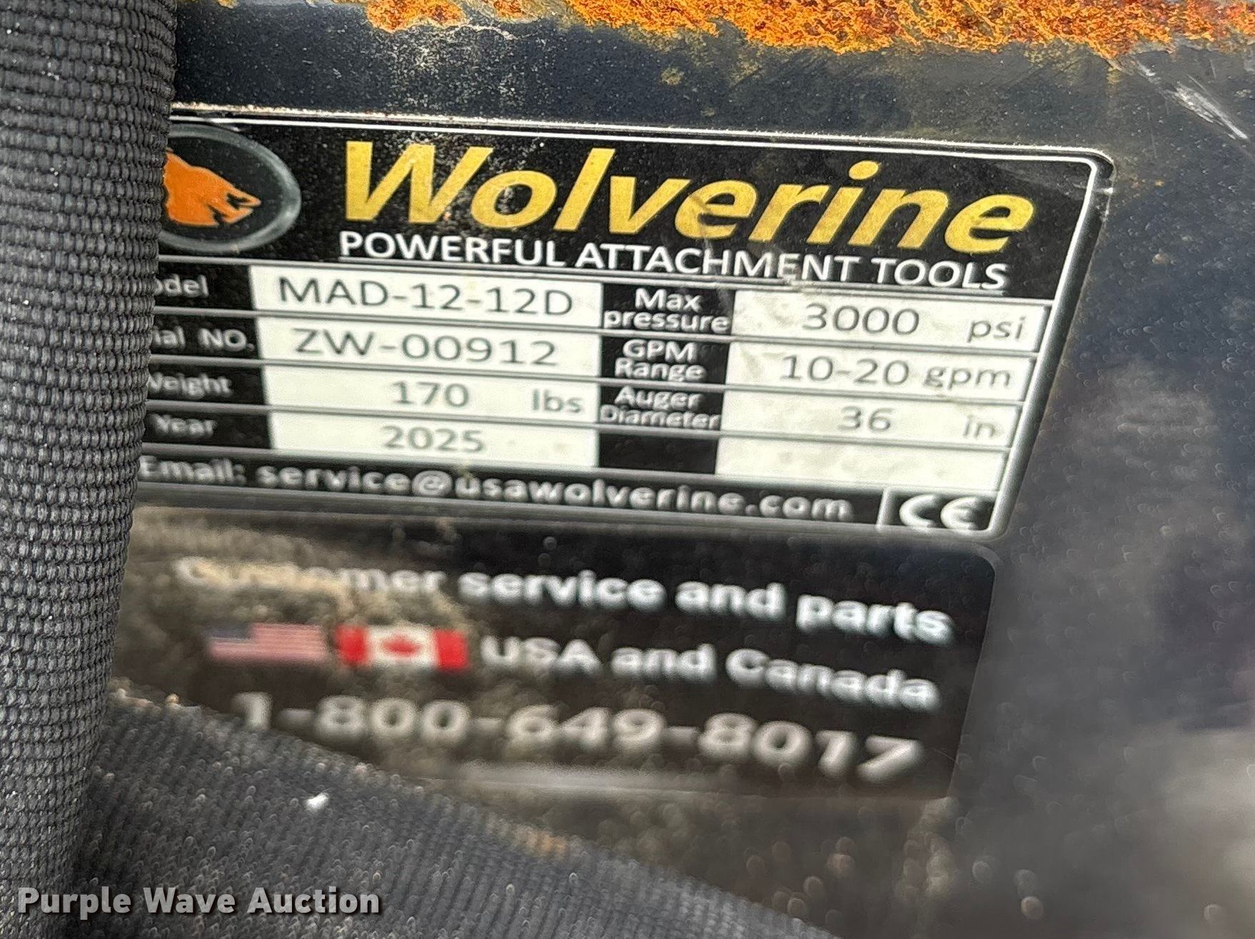 Purple Wave is selling a used Skid Steer Attach. in Texas. This item is a 2025 Wolverine MAD-12-12D compact utility loader auger with the following: Serial: ZW-00912