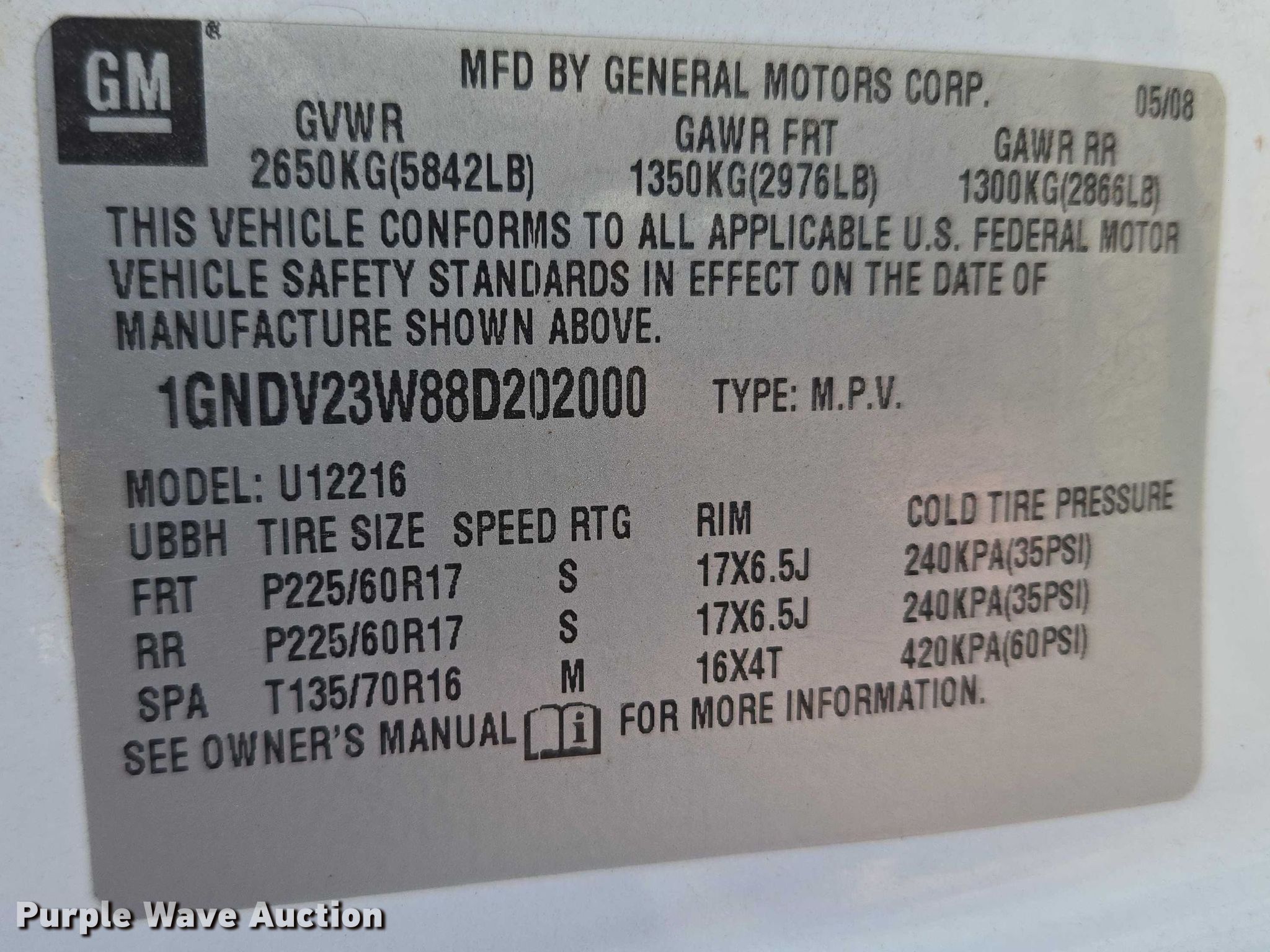 Purple Wave is selling a used Passenger Vehicle in Oklahoma. This item is a 2008 Chevrolet Uplander van with the following: Miles: 326,597 on odometer, VIN: 1GNDV23W88D202000
