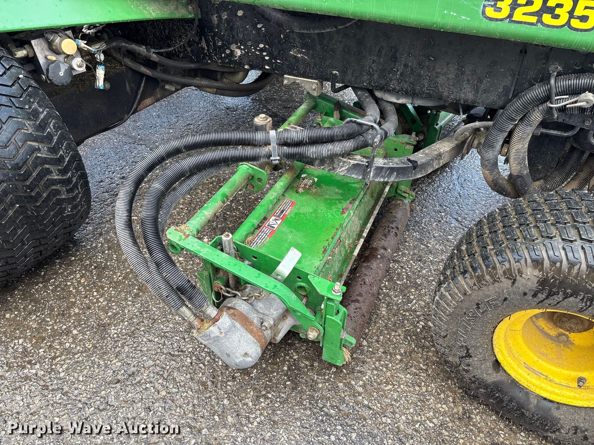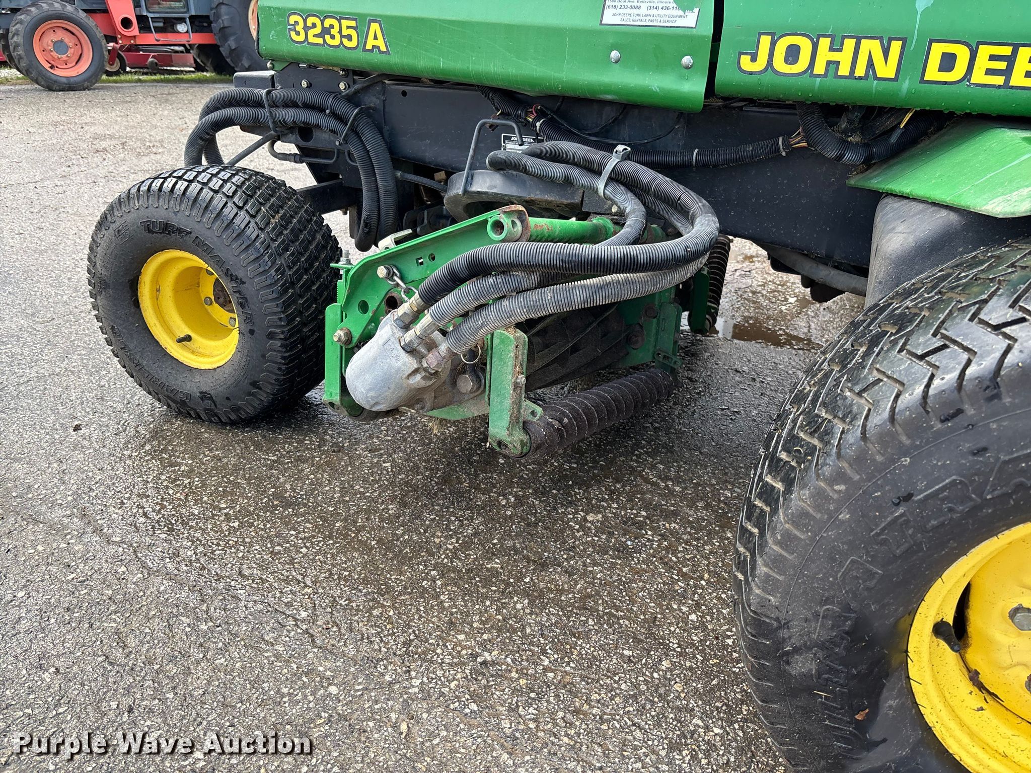 John Deere 3235 reel mower. Hours: 2,053 on meter, Cutting width: 108", Serial: M03235A030374. Engine John Deere 3015D002, Serial: CH3015D002318, Cylinders: 3, Fuel type: Diesel. Transmission Hydrostatic. Features Hydraulic front deck lift. Tires Front: 20x10.00-10, Rear: 20x10.00-8. Farm Power Lawn & Leisure, Inc.. Columbia, MO 65201