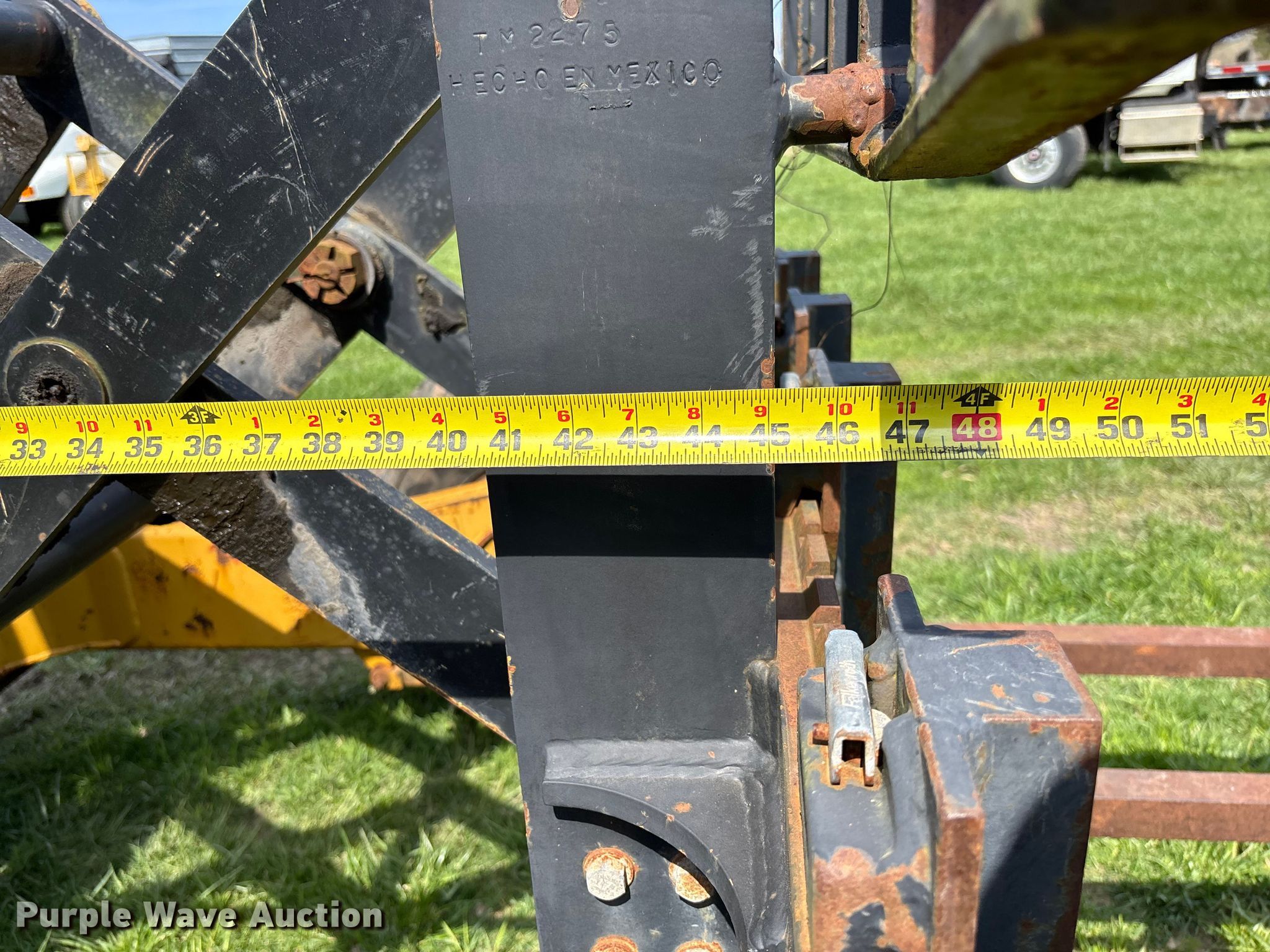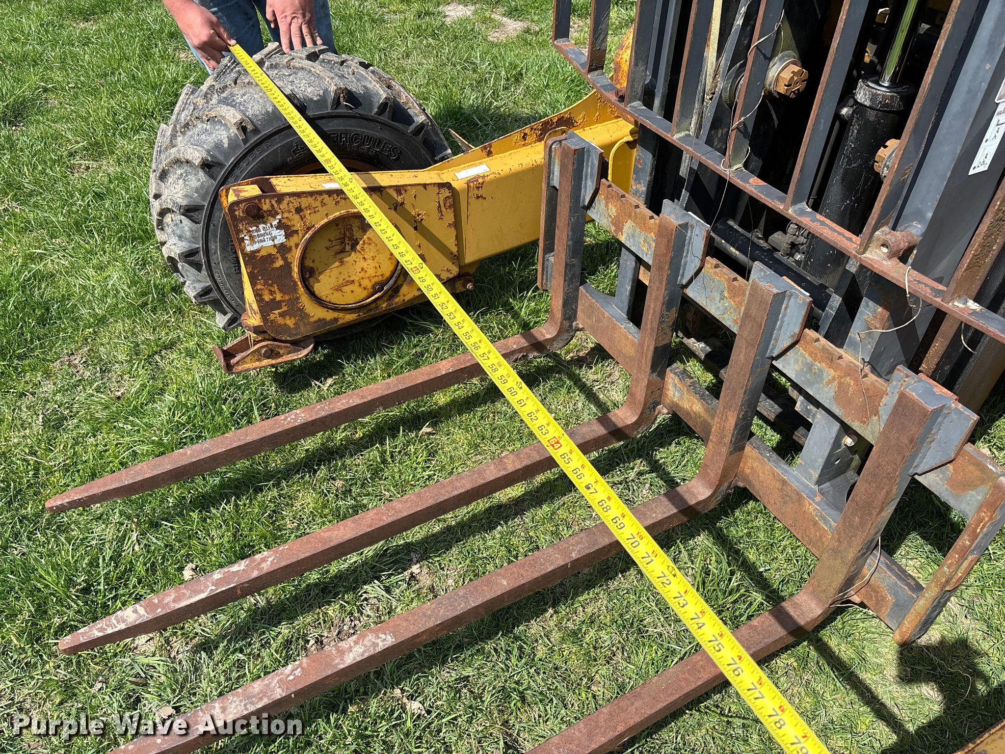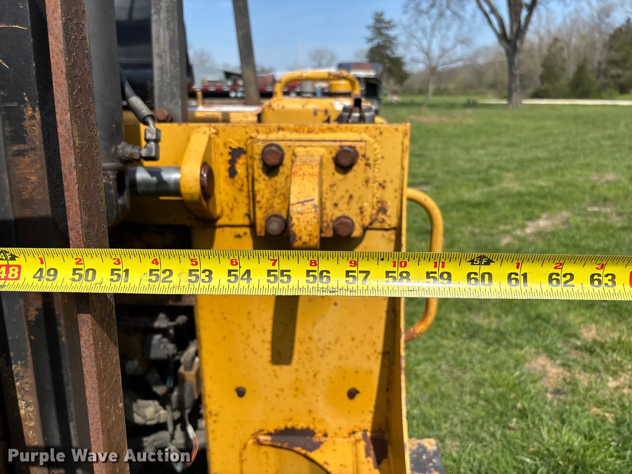 2005 Noble TM50 forklift. Hours: 415 on meter, Serial: 5TMB1607. Engine Cylinders: 4, Fuel type: Diesel. Transmission Hydrostatic. Features Maximum lift capacity: 5,000 lbs, Collapsed mast height: 92", Mast stages: 2, Side shift, Mast tilt, Reach / retract, Fork length: 48". Tires Front: 31X15.50-15. Notes Lift cylinder issues, leak. Wibberg. Jefferson City, MO 65101