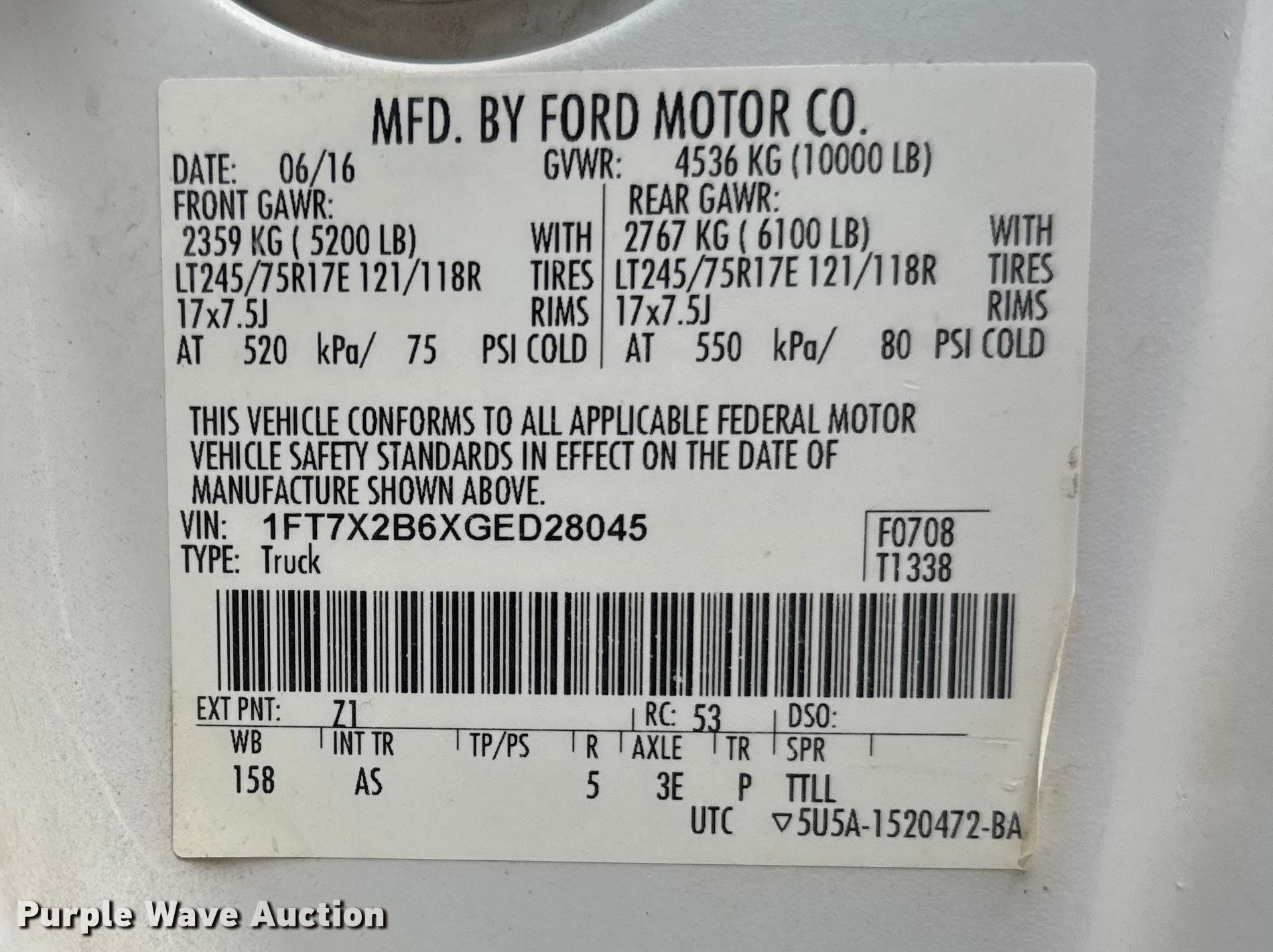 2016 Ford F250 Super Duty Ext. Cab pickup truck. Miles: 209,124 on odometer, VIN: 1FT7X2B6XGED28045, Unit #: 16207. Engine Displacement: 6.2L, Cylinders: 8, Fuel type: Gas, HP: 385. Transmission Automatic, Four wheel drive. Interior AC, Heat, Heated mirrors, Power windows, Power locks, Cruise control, Brake controller. Tires Size: 245/75R17. Notes Dash warning indicator: TPMS, ABS, Brake, Traction control, Hail damage. Titles will be distributed after confirmation of payment and removal.. Colorado title. Title distribution may be delayed up to 30 days from verification of funds. Seaboard Foods. Holyoke, CO 80734