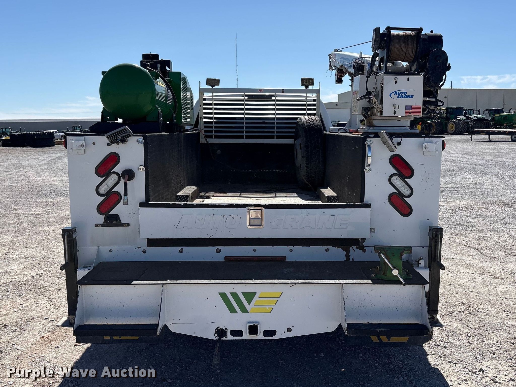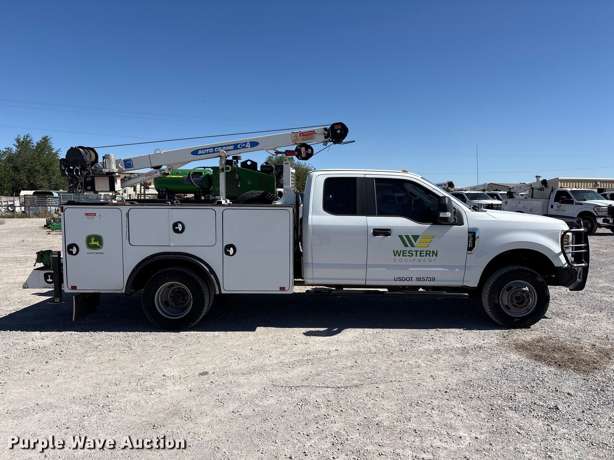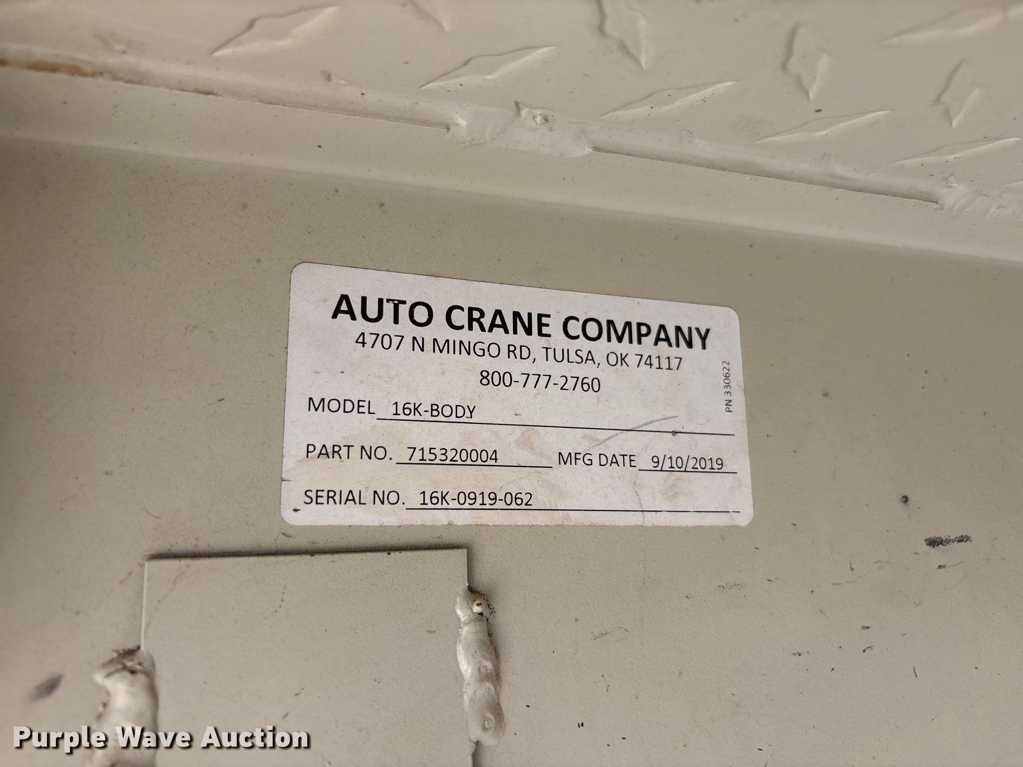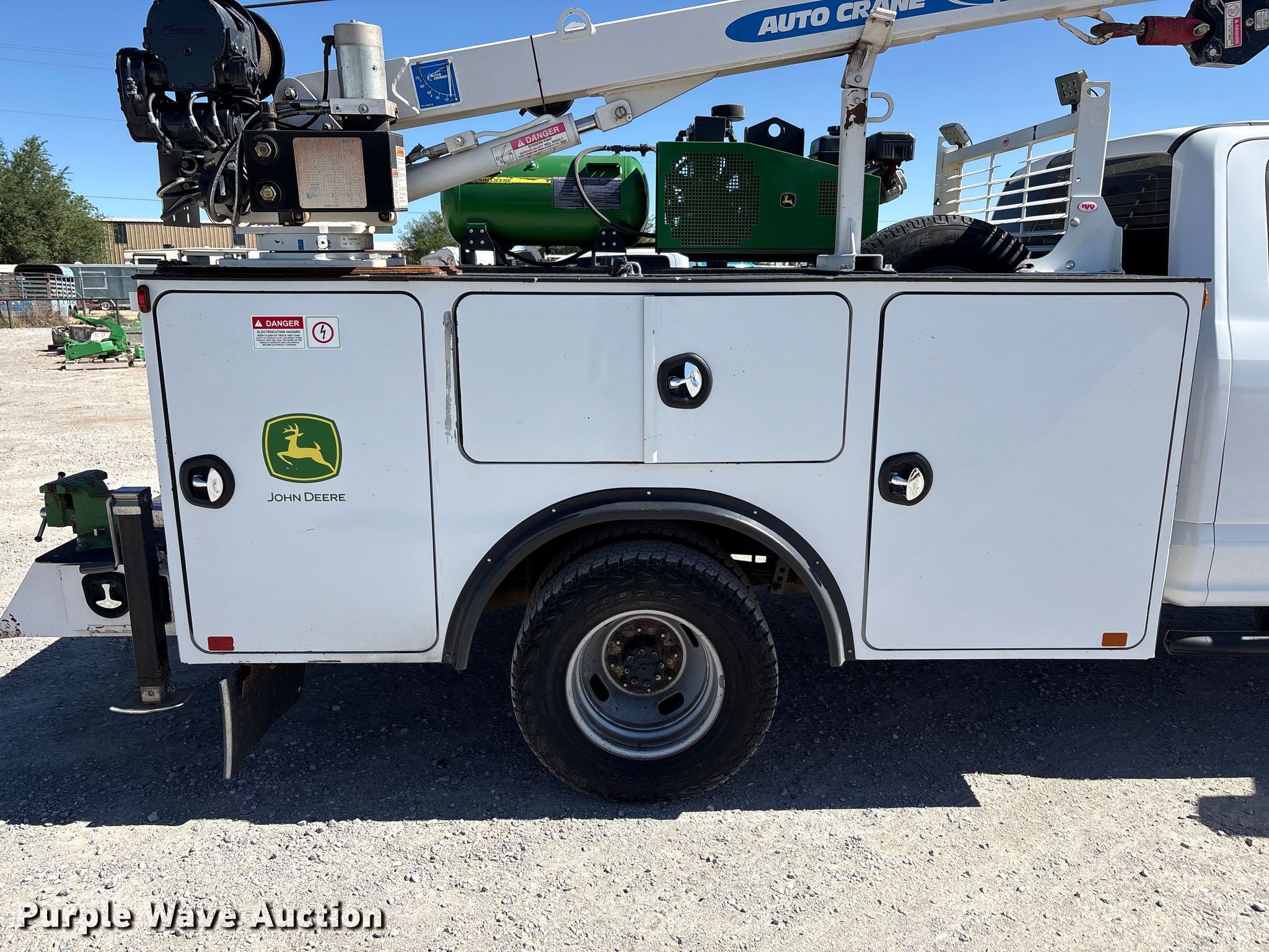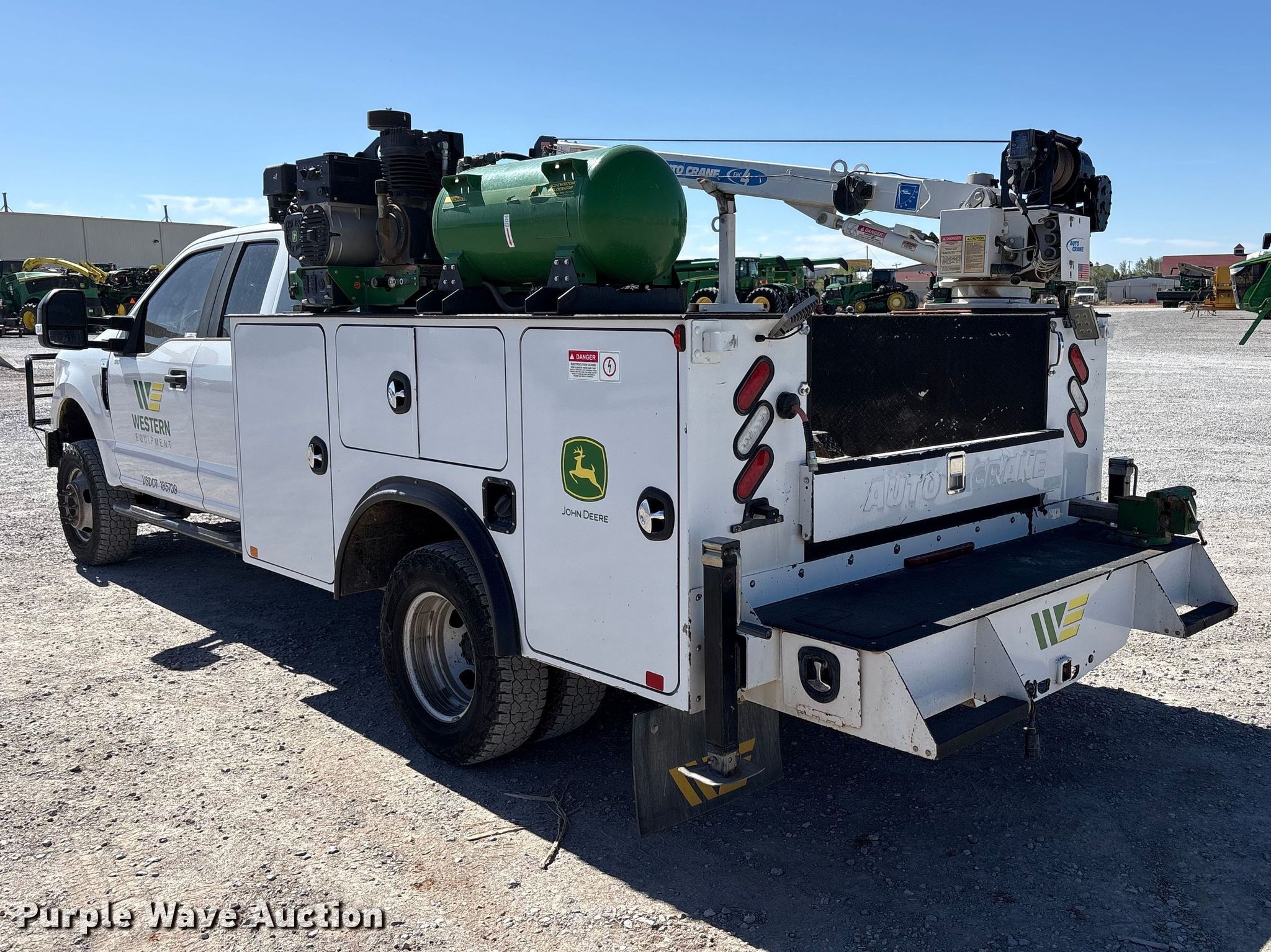 2019 Ford F350 Super Duty XL Ext. Cab utility bed pickup truck. Miles: 154,120 on odometer, VIN: 1FD8X3H6XKEF61798, Unit #: 1863. Engine Ford, Displacement: 6.2L, Cylinders: 8, Fuel type: Gas. Transmission Automatic. Chassis Four wheel drive, Axles: Single, Suspension: Spring, Brakes: Hydraulic, GVWR: 14,000 lbs. Interior AC, Heat, Heated mirrors, Power windows, Power locks, Cruise control, Auxiliary controls, Brake controller. Features Bed Utility bed, Autocrane 16K-Body, Serial: 16K-0919-062, Length: 11' 3", Width: 8', Welder/generator John Deere AC2-CW5170M, Fuel type: Gas, 240V outlets: 1, 120V outlets: 4, Welder type: Stick (AC/DC), Air compressor, Crane Autocrane EHC4, Maximum boom length: 20' Maximum lift capacity: 4,000 lbs.. Tires Size: LT245/75R17. Notes Dash warning indicator: Check engine, TPMS, Airbag, Jump start required during on-site data collection, Non-operational AC. Oklahoma title. Title distribution may be delayed up to 14 days from verification of funds. Western Lease LLC. Amarillo, TX 79119
