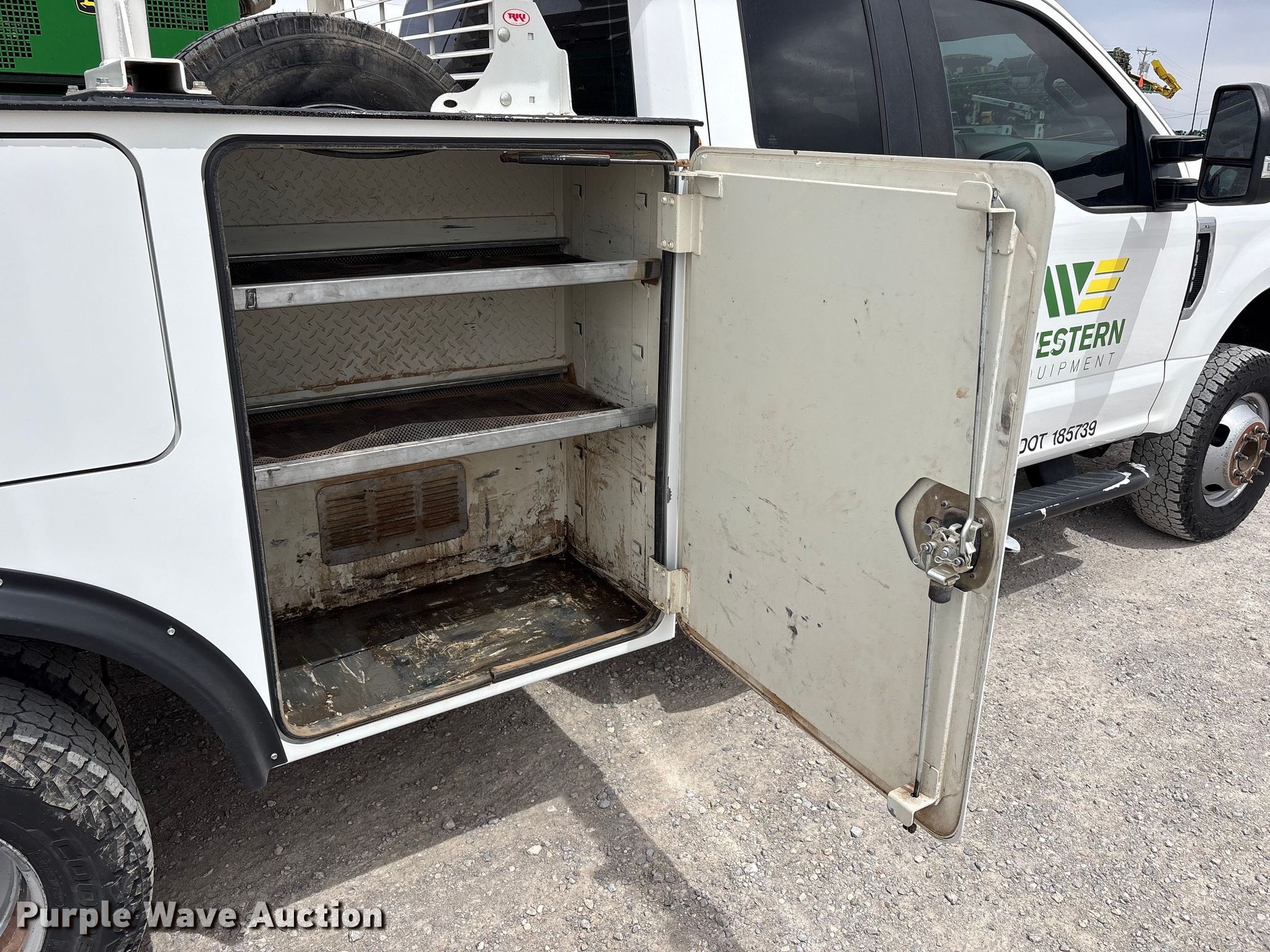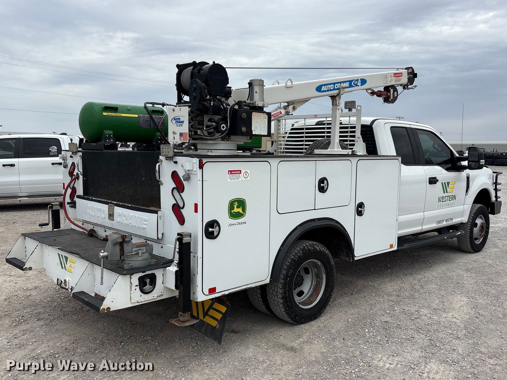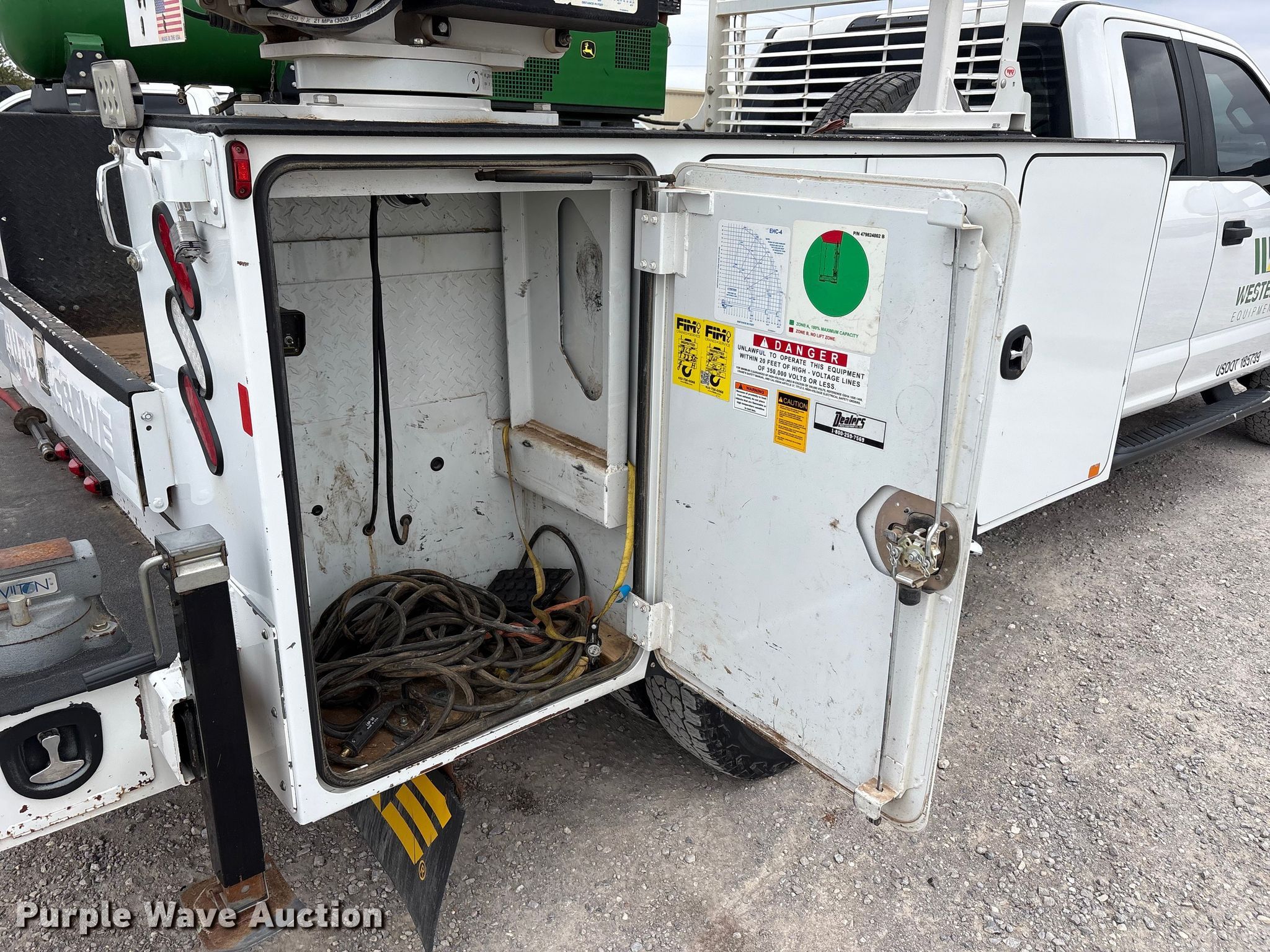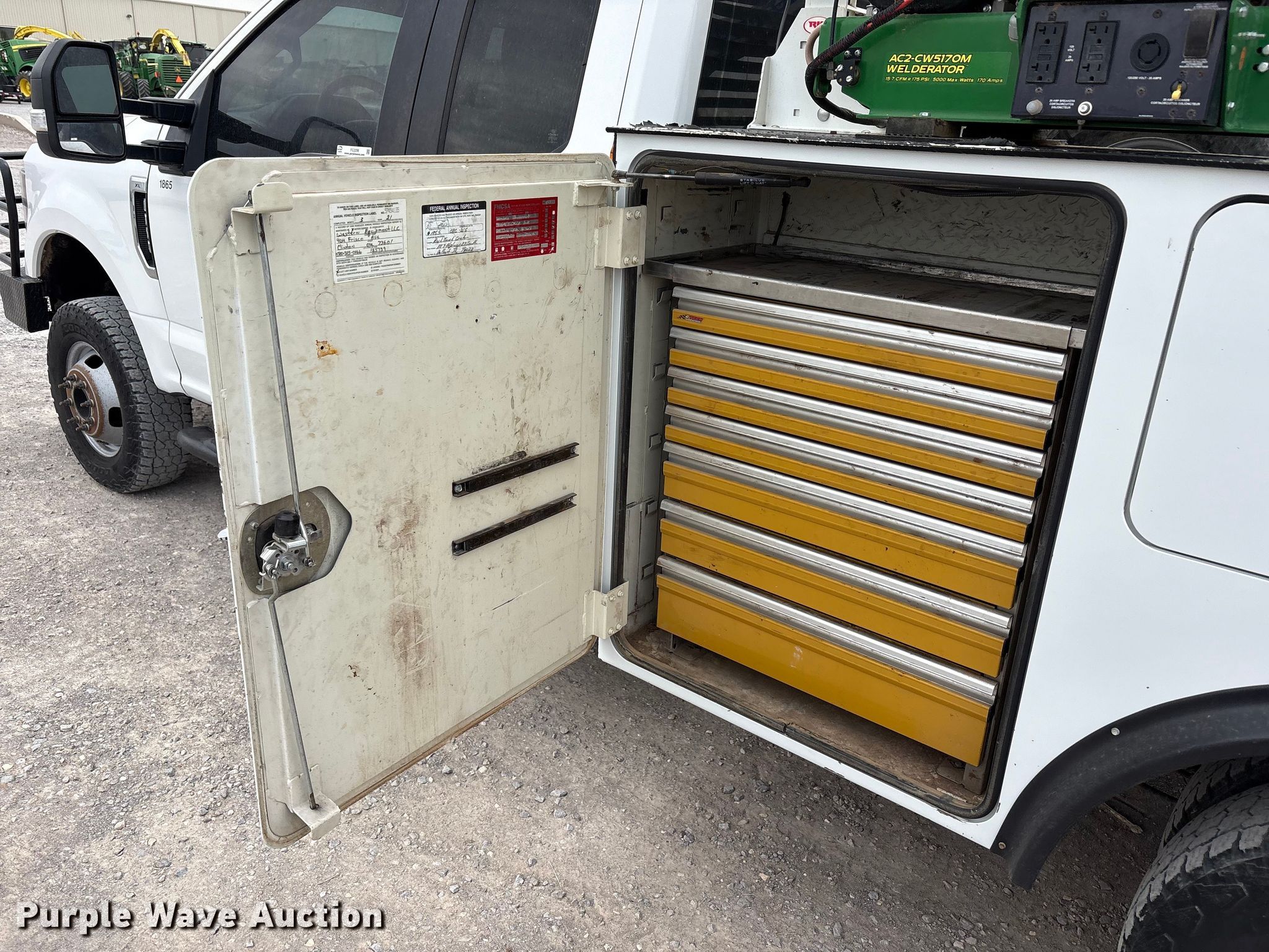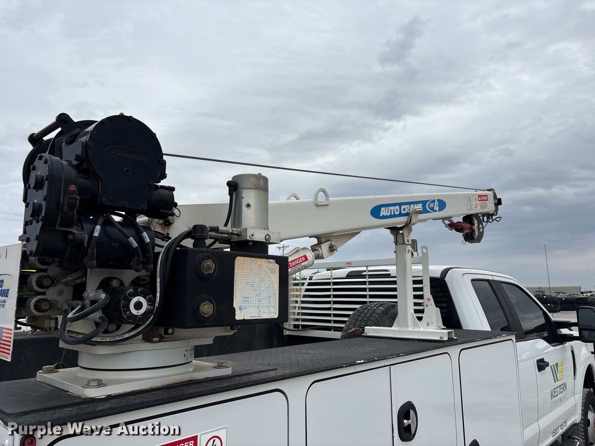 2019 Ford F350 Super Duty XL Ext. Cab utility bed pickup truck. Miles: 104,214 on odometer, VIN: 1FD8X3H63KEF85621, Unit #: 1865. Engine Ford, Displacement: 6.2L, Cylinders: 8, Fuel type: Gas. Transmission Automatic. Chassis Four wheel drive, Axles: Single, Suspension: Spring, Brakes: Hydraulic. Interior AC, Heat, Heated mirrors, Power windows, Power locks, Cruise control, Auxiliary controls, Brake controller. Features Bed Utility bed, Autocrane, Length: 11' 4", Width: 8', Welder/generator John Deere AC2-CW5170M Welderator, Fuel type: Gas, 240V outlets: 1, 120V outlets: 4, Welder type: Stick (AC/DC), Air compressor John Deere AC2-CW5170M, Crane Autocrane EHC4, Maximum boom length: 20' Maximum lift capacity: 4,000 lbs.. Tires Size: LT245/75R17. Notes Dash warning indicator: Check engine, Windshield chipped or cracked. Oklahoma title. Title distribution may be delayed up to 14 days from verification of funds. Western Lease LLC. Amarillo, TX 79119