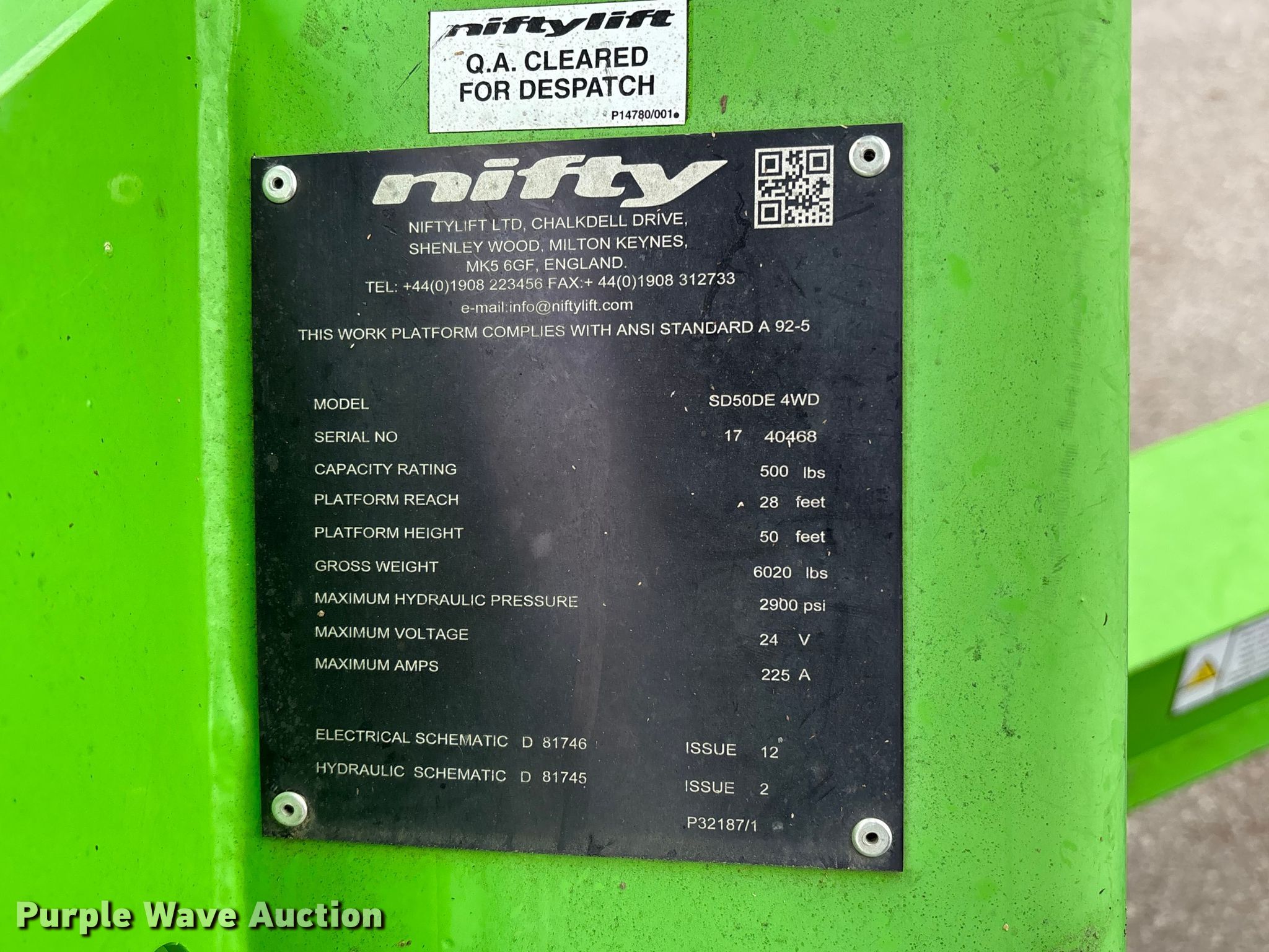 Nifty SD50DE 4WD boom lift. Hours: Unknown, Serial: 17 40468. Engine Kubota D902-EF01, Serial: 4JQ5445, Displacement: 0.898L, Cylinders: 4, Fuel type: Diesel. Chassis Four wheel drive. Features Rough terrain, Boom type: Articulating, Telescopic, Maximum lift capacity: 500 lbs, Maximum reach length: 28', Maximum lift height: 50', Hydraulic outriggers, Controls: Platform, Ground. Tires Tire size: 10-16.5. This is worksite support equipment and will not come with a title. Transfer of ownership documentation will be a bill of sale. Platte Rental & Supply. Parkville, MO 64152