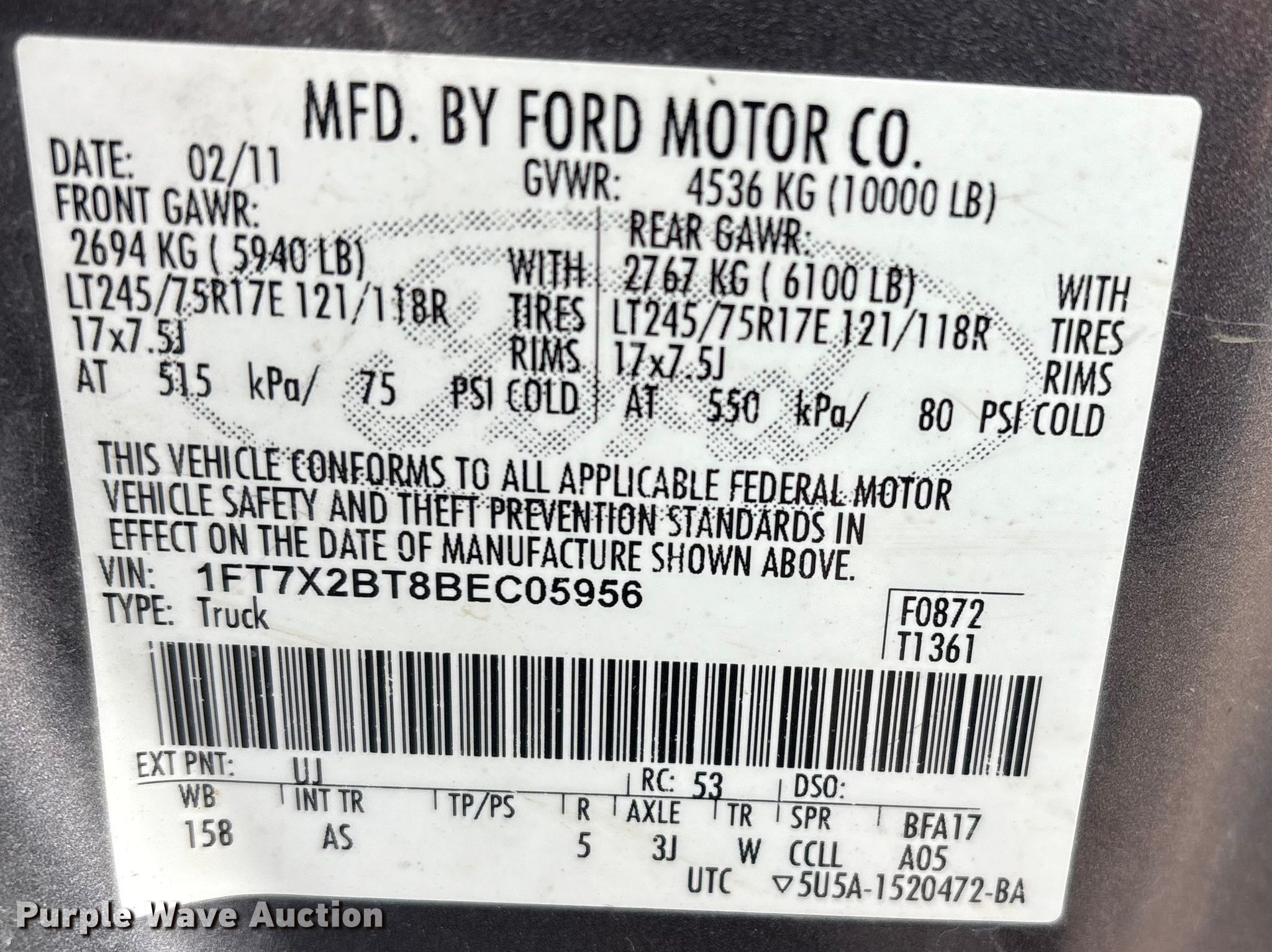 - VIN: 1FT7X2BT8BEC05956