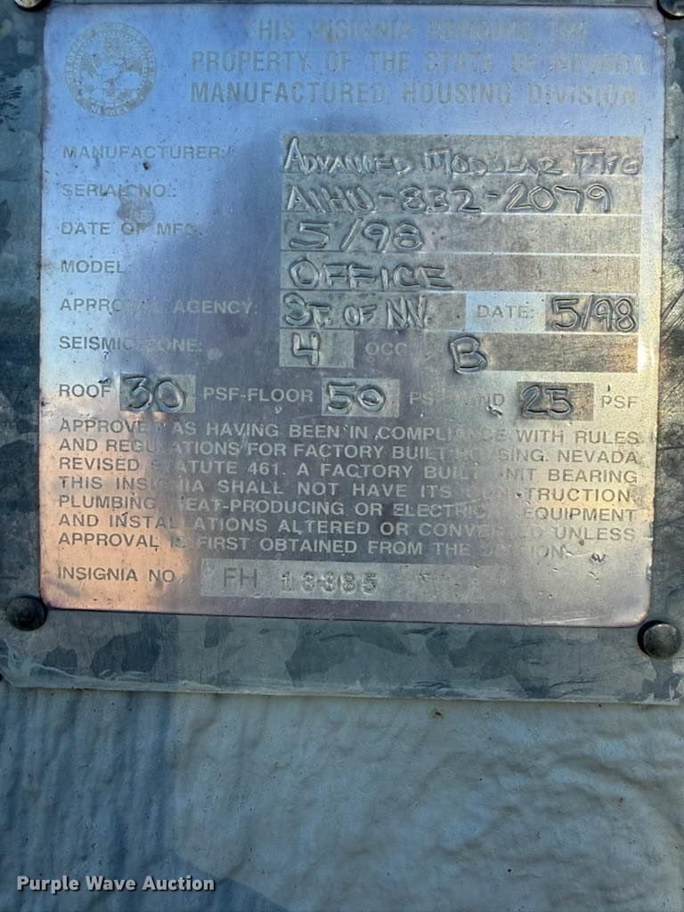 Purple Wave is selling a used Manufactured Home or Office in Utah. This item is a 1998 Advanced Modular MFG mobile office trailer with the following: VIN: AIHU8322079, Unit #: BT-227