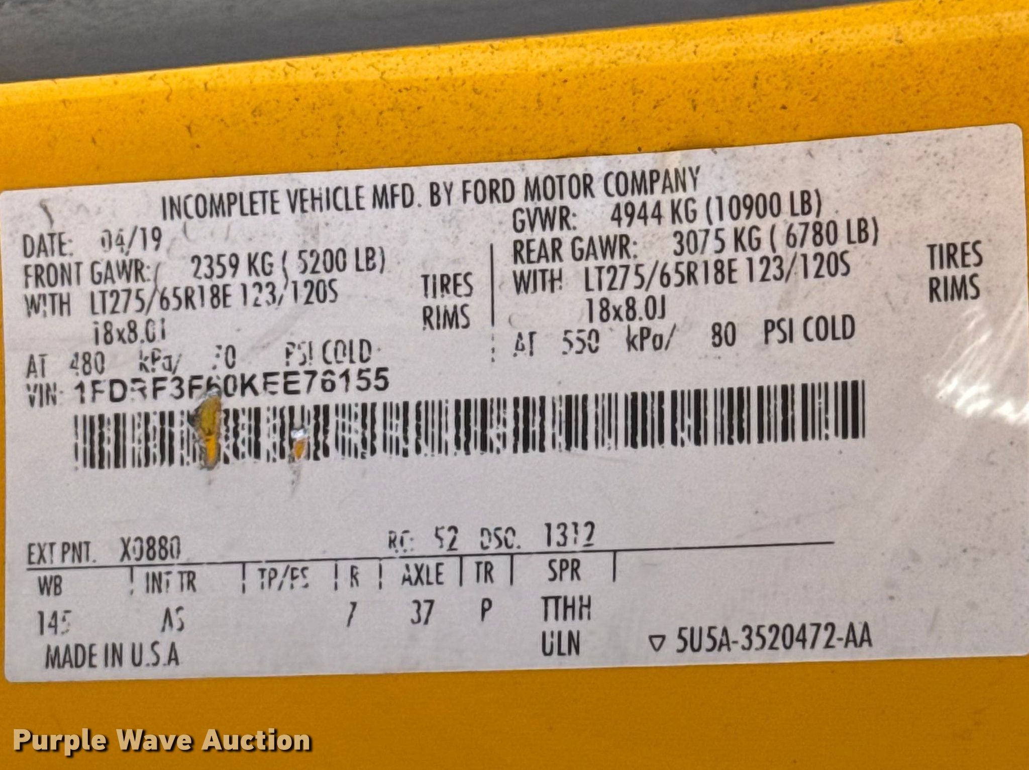 Purple Wave is selling a used 3/4 or 1 Ton Pickup or Van in Oklahoma. This item is a 2019 Ford F350 Super Duty utility bed pickup truck with the following: Miles: 172,914 on odometer, VIN: 1FDRF3F60KEE76155, Unit #: E76155