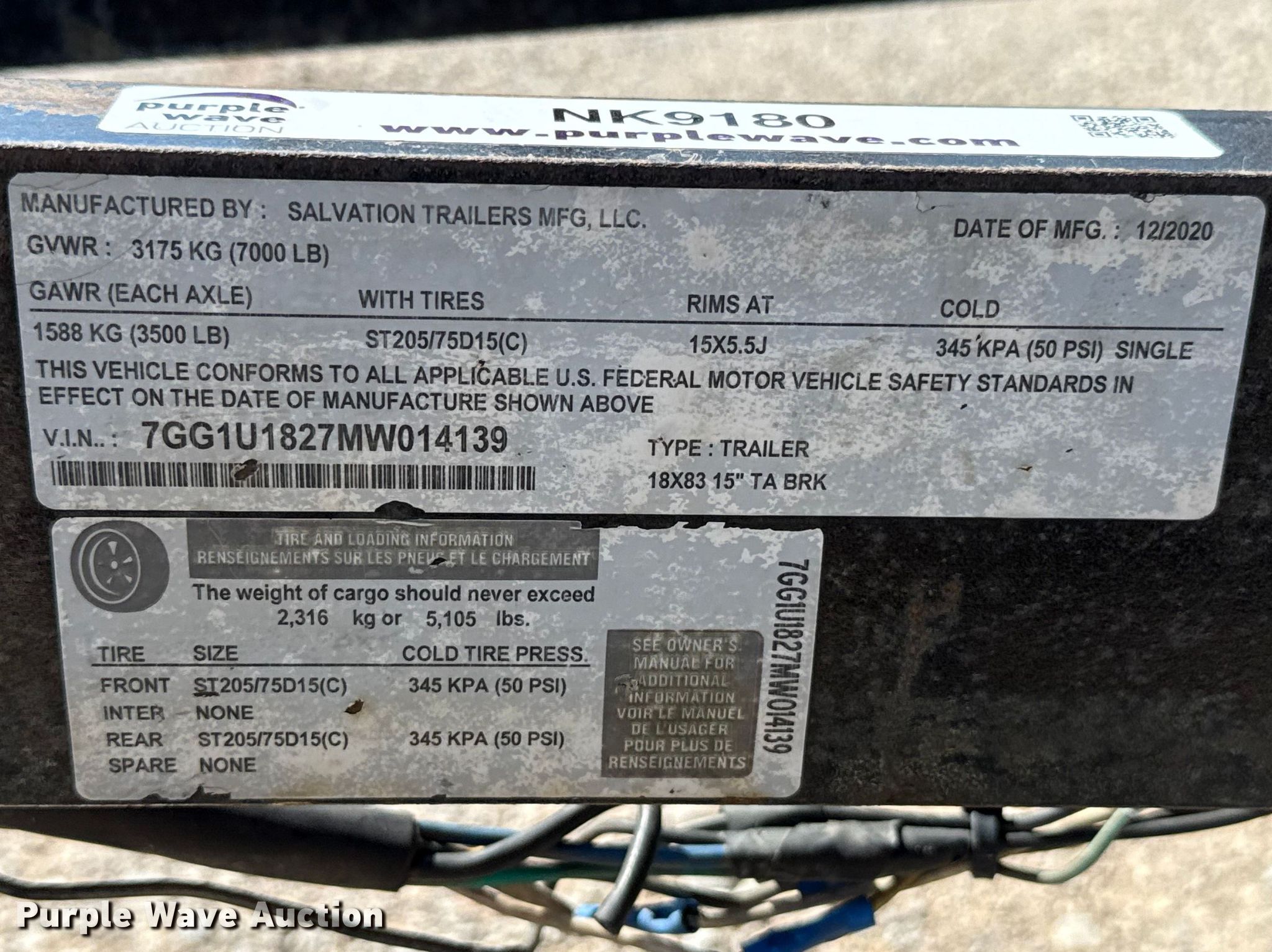 2021 Salvation Trailers Mfg. TA BRK utility trailer. VIN: 7GG1U1827MW014139, Unit #: 014139. Dimensions Overall Length: 22', Width: 102", Deck Length: 18', Width: 82", Side height: 4', Ramps: Manual Length: 51". Features Deck type: Wood. Chassis Ball hitch: 2", Landing gear: Single, Suspension: Spring, Brakes: Electric, Axles: Tandem, GVWR: 7,000 lbs, GAWR: 3,500 lbs. Tires Steel wheels, Size: ST205/75R15. Notes Possible tire issue. Oklahoma title. Title distribution may be delayed up to 30 days from verification of funds. Gemini Motor Transport. Oklahoma City, OK 73127