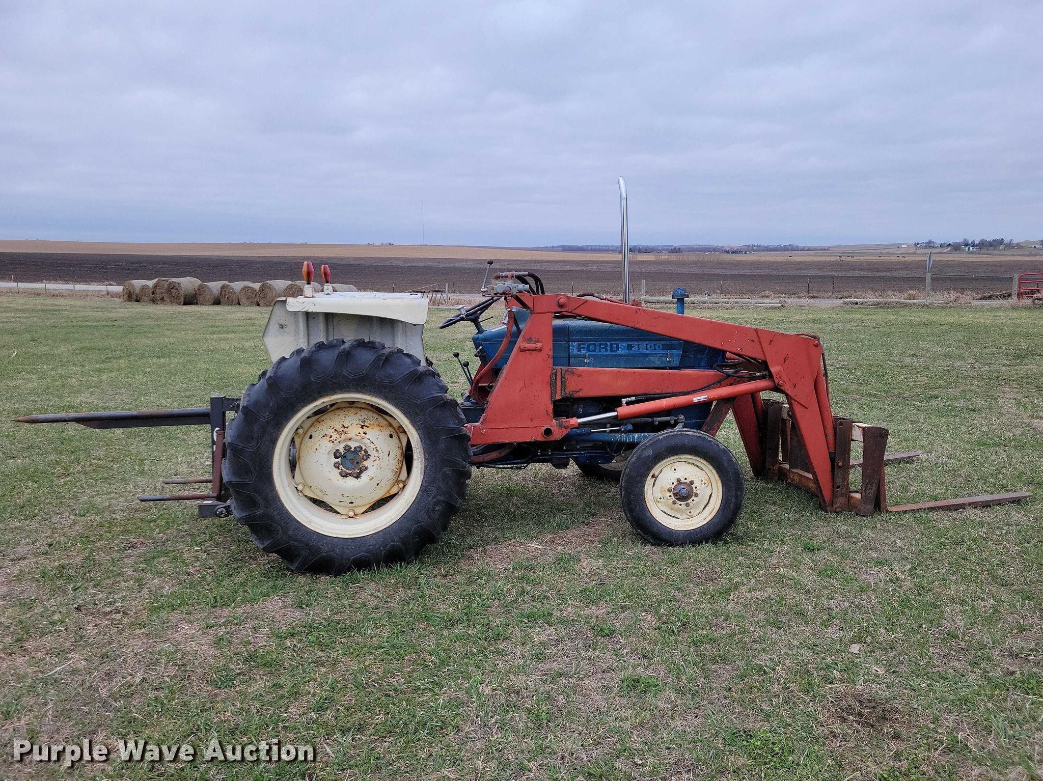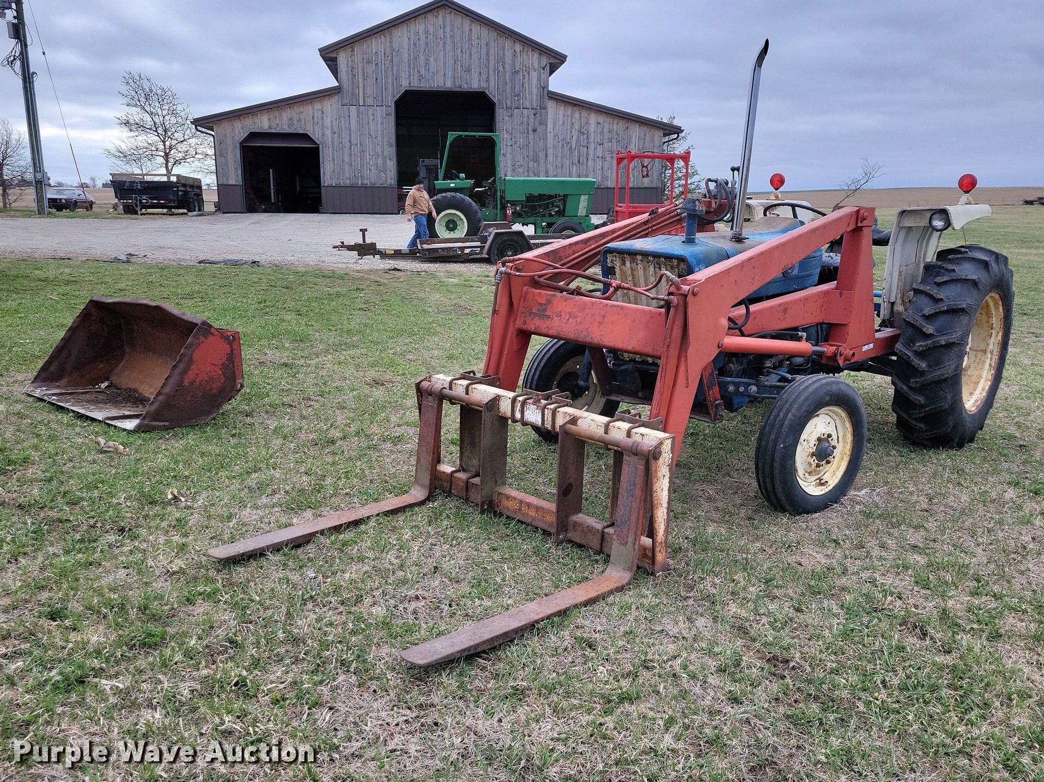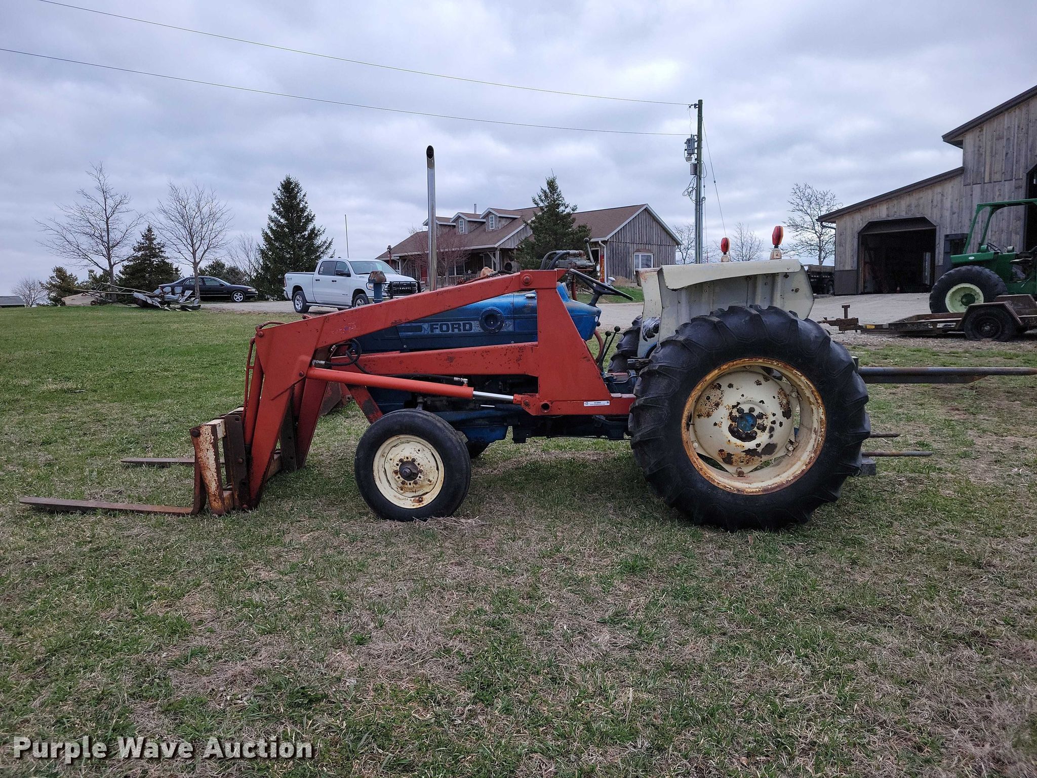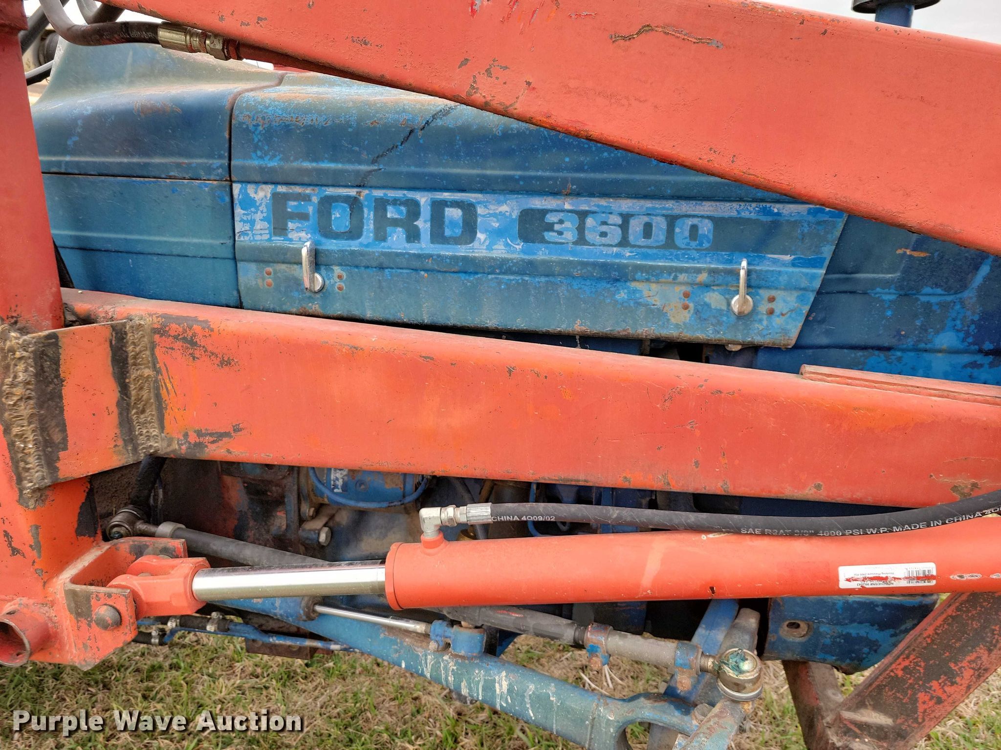 Ford 3600 tractor. Hours: Unknown, Serial: 0490748. Engine Ford, Serial: 5M17C, Cylinders: 3, Fuel type: Gas. Transmission Manual, 8F - 2R, Differential lock. Features PTO: 540, Three point Top link, Hydraulic remote sets Rear: 1, Loader Controls: Two-lever, Bucket Width: 49".. Tires Front: 6-16, Rear: 13.6-28. Vinton, IA 52349