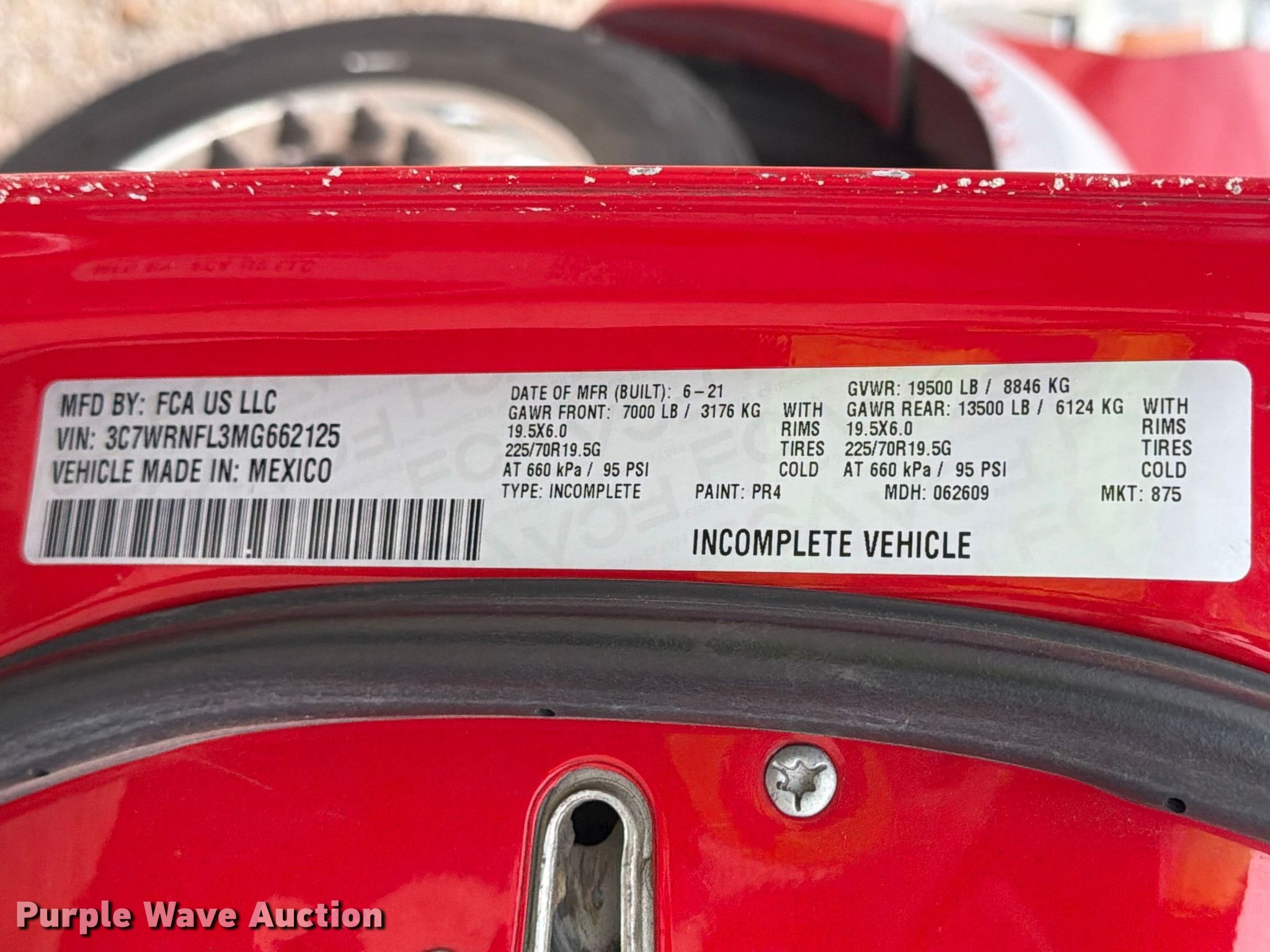 2021 RAM 5500 Crew Cab tow truck. Miles: 154,379 on odometer, Hours: 10,191 on meter, VIN: 3C7WRNFL3MG662125, Unit #: 77125145. Engine Cummins, Displacement: 6.7L, Cylinders: 6, Fuel type: Diesel. Transmission Automatic. Chassis Four wheel drive, Axles: Single, Suspension: Spring, Brakes: Hydraulic, PTO, Wet kit, GVWR: 19,500 lbs. Interior AC, Heat, Heated mirrors, Power windows, Power locks, Cruise control. Features Bed Wrecker bed, Length: 9' 8", Width: 95", Wrecker boom: Hydraulic extendable, Winch Dual, Capacity: 12,000 lbs, Underlift Capacity: 20,000 lbs.. Tires Size: 225/70R19.5. Notes Dash warning indicator: Check engine, Windshield chipped or cracked, Dash partially disassembled, Parts may be missing, Unknown operating condition underlift, Unknown operating condition boom, Unknown operating condition of winches. Repossessed item, stored at a secured facility. Please review REQUIRED REMOVAL INSTRUCTIONS. Titles will be distributed after confirmation of payment and removal. Indiana title. Title distribution may be delayed up to 30 days from verification of funds. Lender Owned. 11130 Applewhite Road. San Antonio, TX 78224