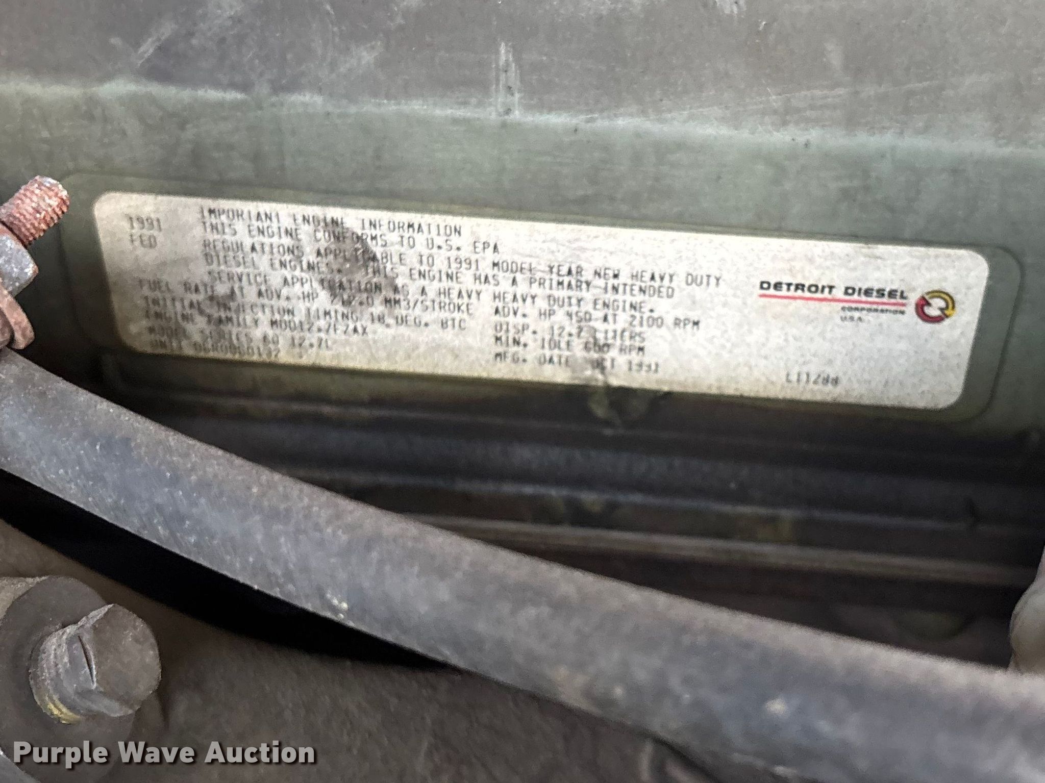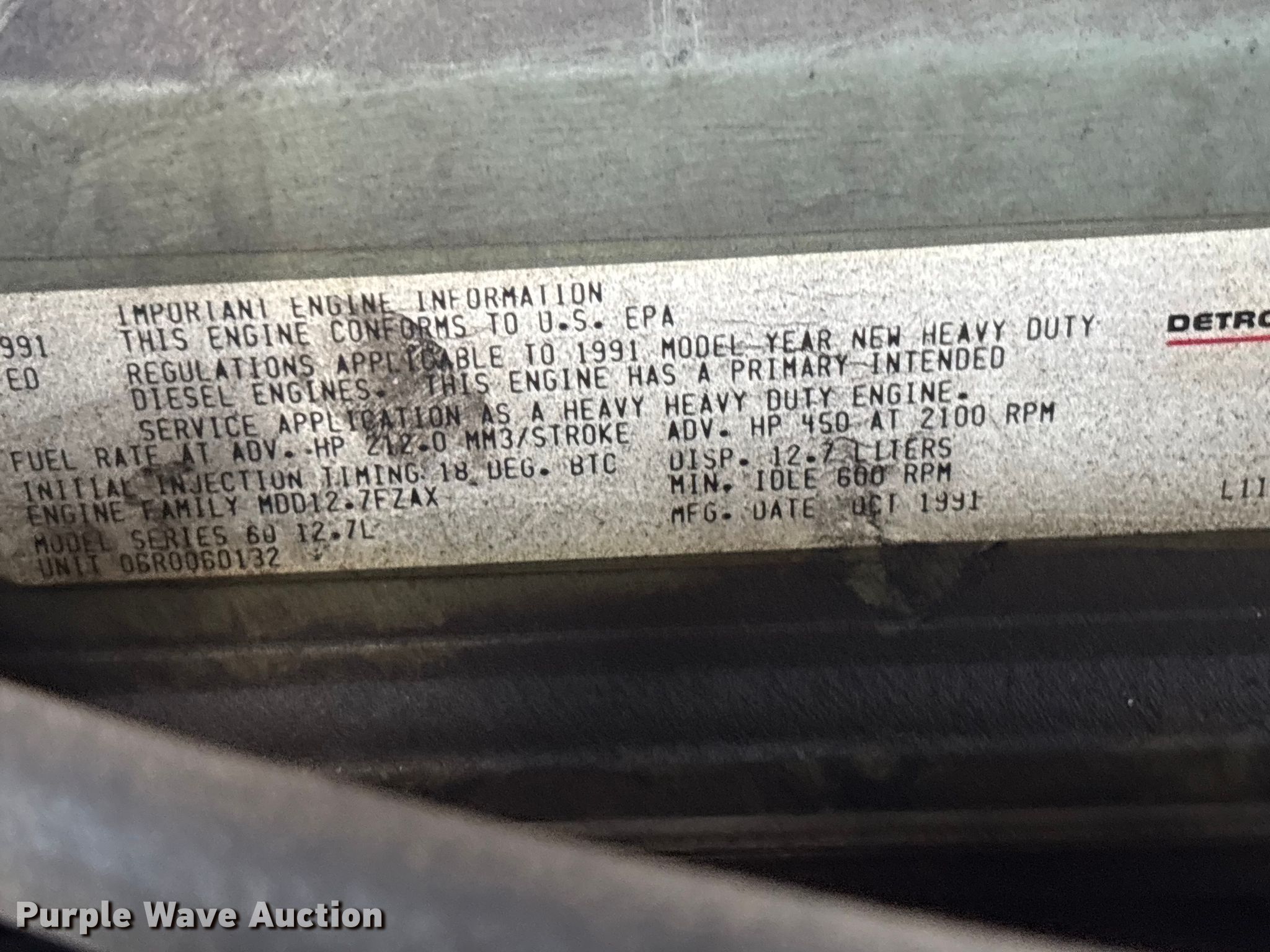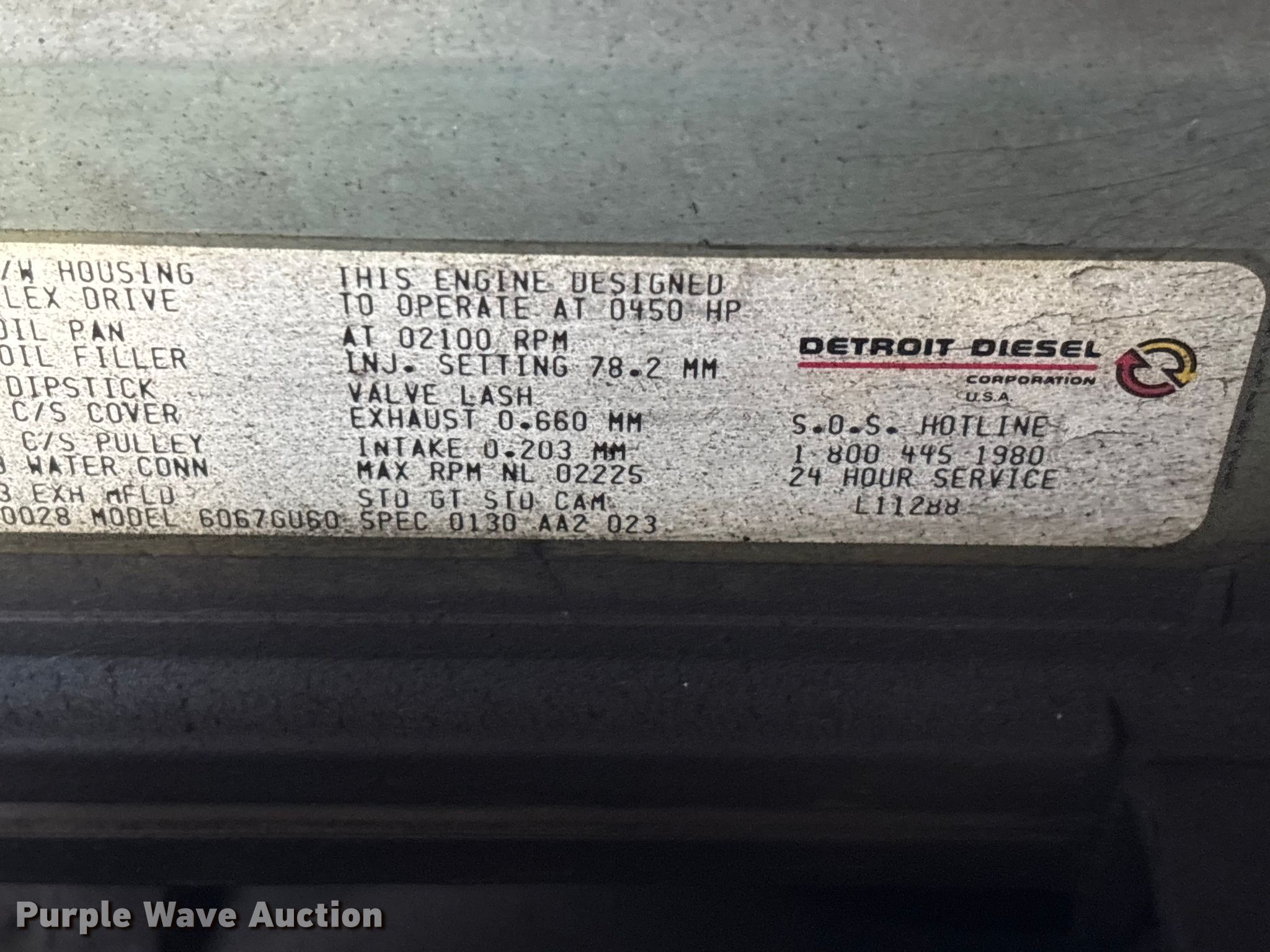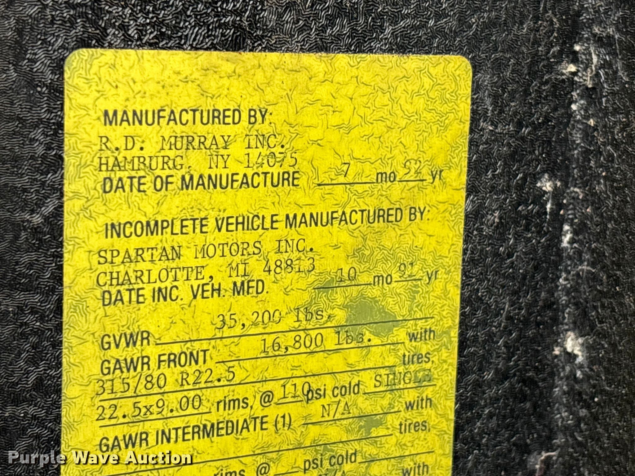 1992 Spartan Gladiator pumper fire truck. Miles: 33,383 on odometer, Hours: 3,445 on meter, VIN: 4S7BT9F03NC005113, Unit #: 77722745. Engine Detroit Diesel Series 60, Displacement: 12.7L, Cylinders: 6, Fuel type: Diesel. Transmission Automatic. Chassis Axles: Single, Suspension: Spring, Brakes: Air, GVWR: 35,200 lbs. Interior Heat, Auxiliary controls. Features Fire truck body Elevated deck gun, Tank, Pump 1,259 gpm, Generator Harrison 10.OMPC-16F, Hours: 250 on meter, Fuel type: Diesel, kW: 10, PA/ siren controls. Tires Front: 315/80R22.5, Rear: 12R22.5. Notes Dash warning indicator: Check engine, Stop engine, Possible pump issue, Roof damage, Driveshaft disconnected for transport and temporarily reattached for video Drivetrain should be inspected prior to service. Buyer responsible for all aspects of loadout and removal. Insurance salvage, stored at a secured facility. Please review REQUIRED REMOVAL INSTRUCTIONS. Titles will be distributed after confirmation of payment and removal. Kentucky salvage title. Title distribution may be delayed up to 30 days from verification of funds. Insurance Salvage. 700 Sandcut Road. Earlington, KY 42410