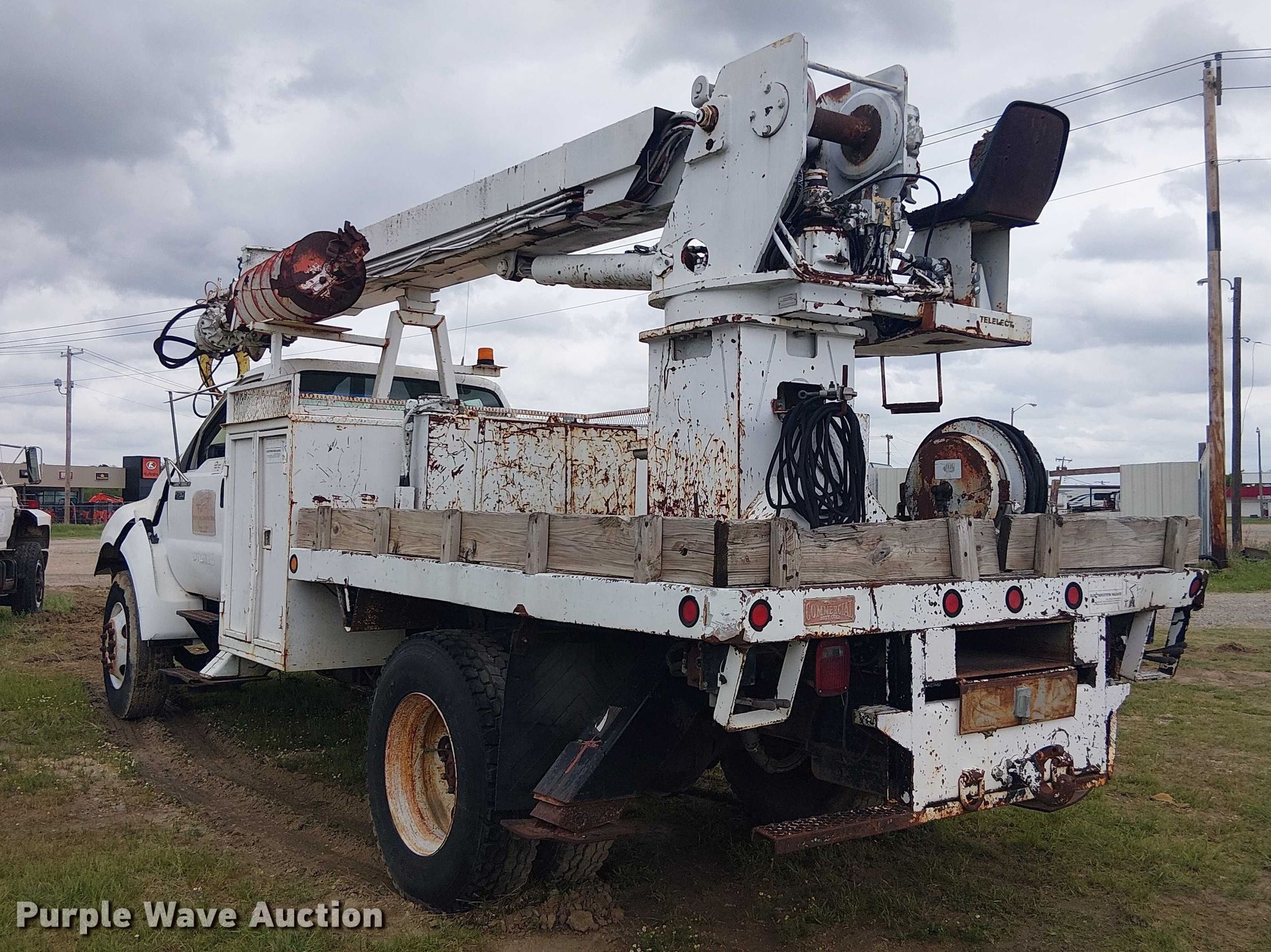 This 2000 Ford F750 digger derrick truck will sell to the highest bidder regardless of price.