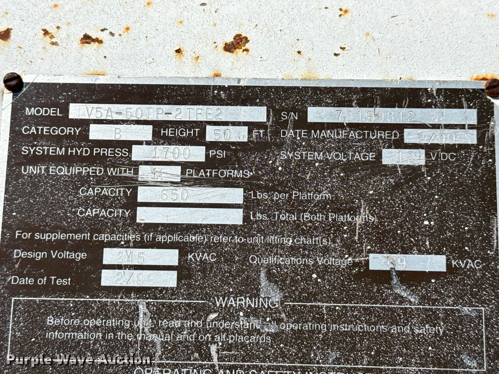 2000 International 4900 bucket truck. Miles: 36,275 on odometer, VIN: 1HTSDAAN5YH694410. Engine International DT466, Displacement: 7.6L, Cylinders: 6, Fuel type: Diesel. Transmission Automatic. Chassis Axles: Single, Suspension: Spring, Brakes: Air. Interior AC, Heat, Cruise control. Features Bed Utility bed, Length: 13', Width: 92", Boom 1999 Teco V5A-50IP-2TFE2, Serial: 75199812, Maximum lift capacity: 650 lbs, Maximum lift height: 50', Boom type: Articulating, Insulated, Man basket, Boom controls Lower, Basket.. Tires Size: 11R22.5. Oklahoma classic title. Title distribution may be delayed up to 14 days from verification of funds. Woodward, OK 73801