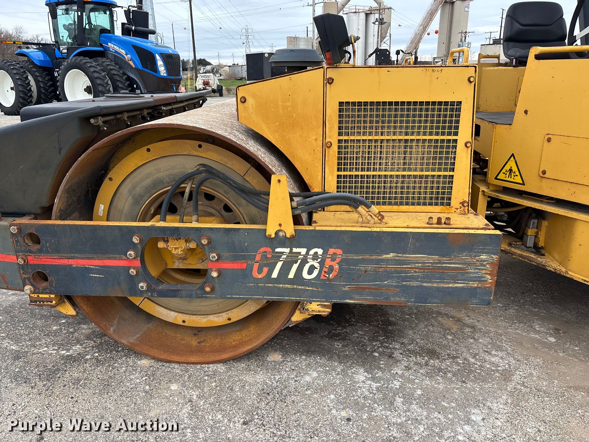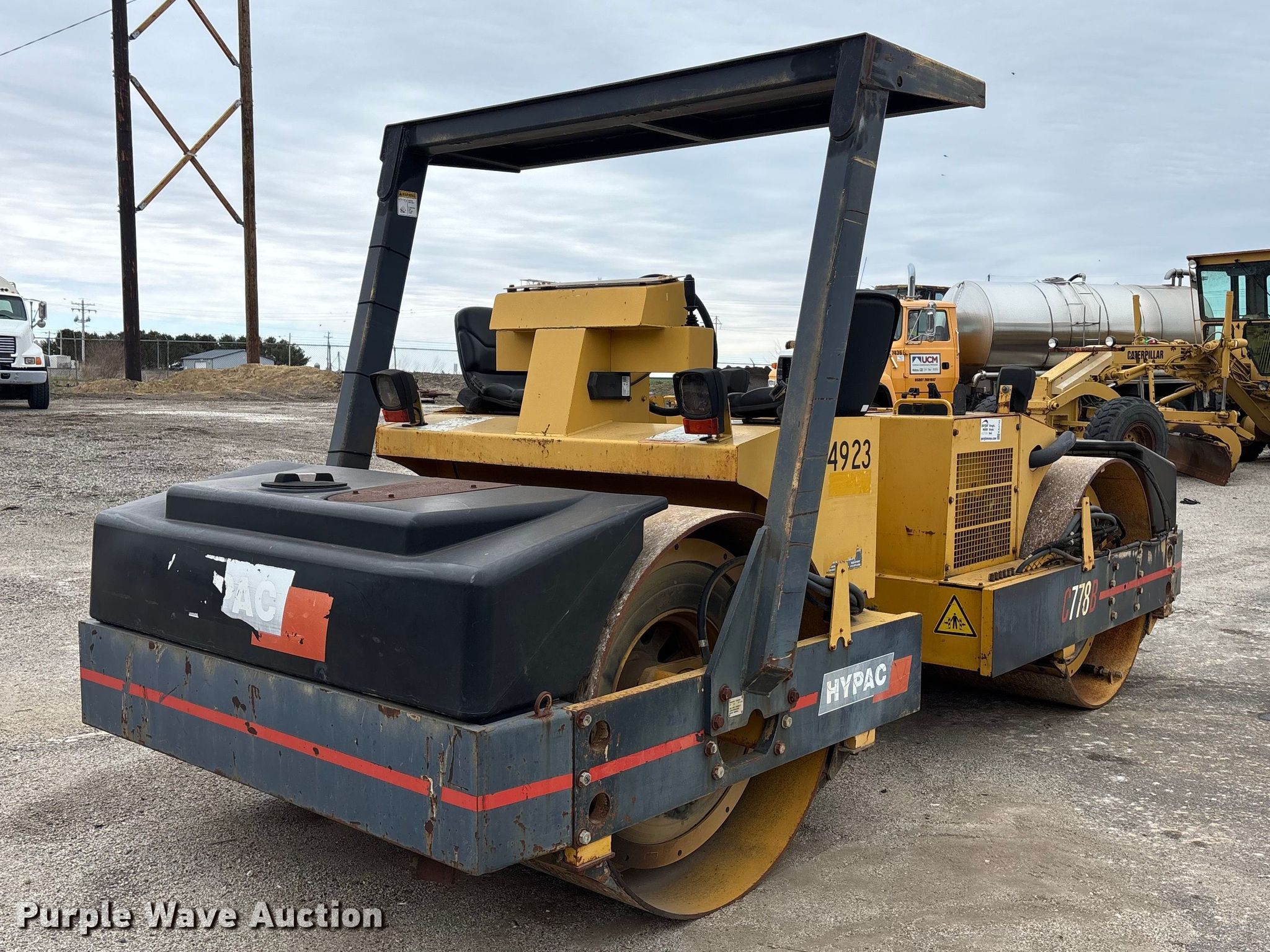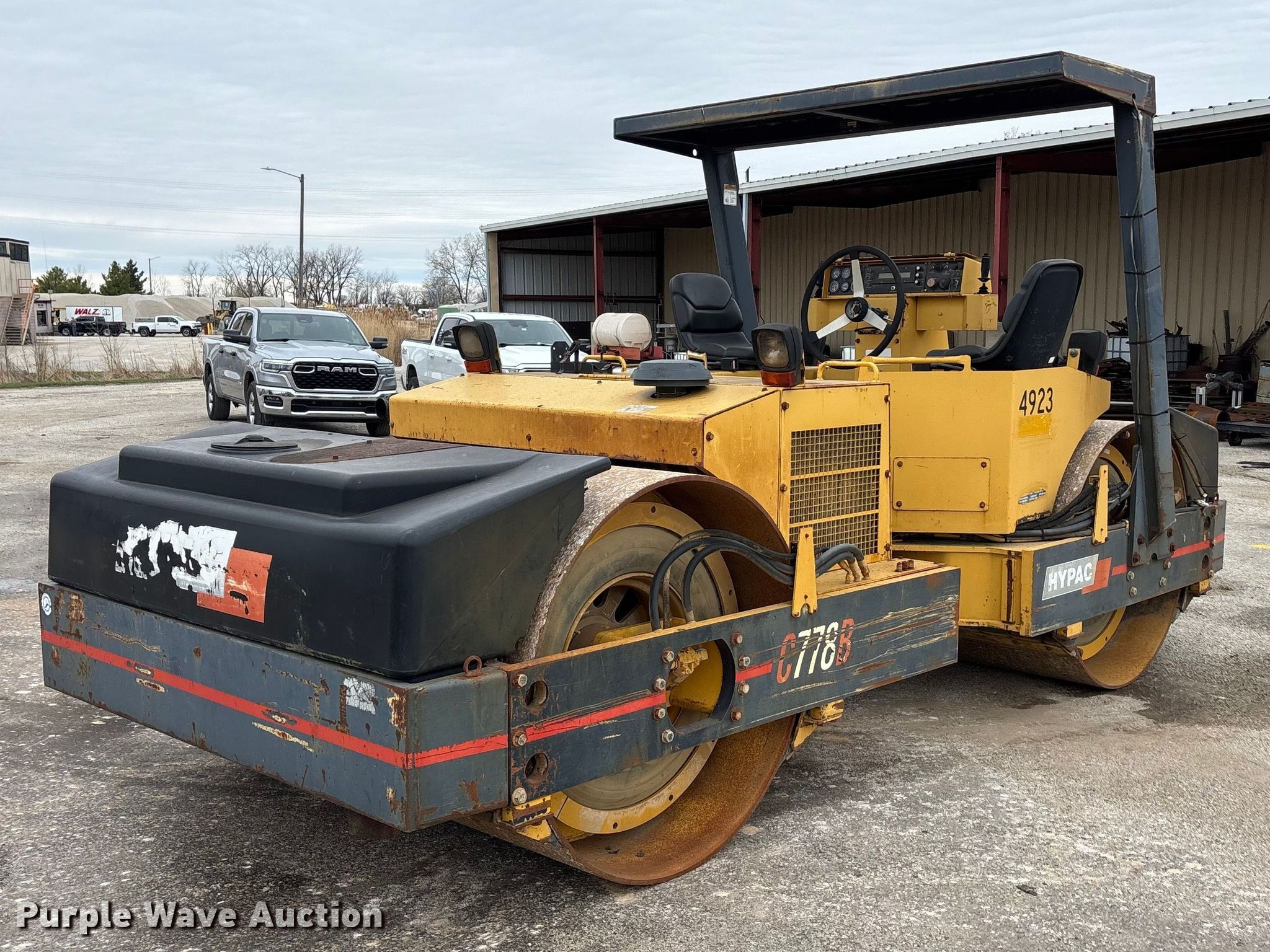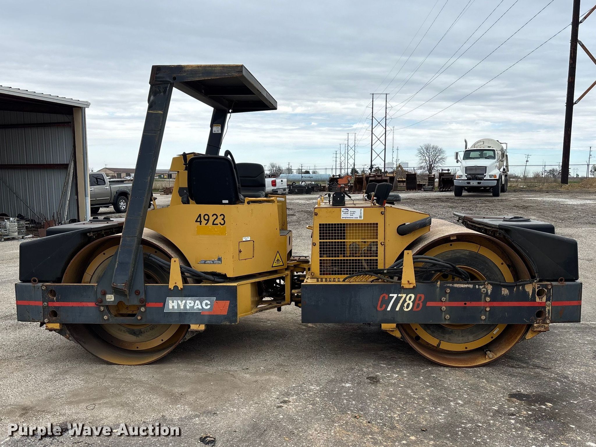2002 Hypac C778B double drum vibratory roller. Hours: 4,348 on meter, Serial: 109B21501863. Engine Cummins, Cylinders: 4, Fuel type: Diesel. Transmission Hydrostatic. Operators station OROPS. Features Drum type: Smooth, Vibratory system: Double, Independent drum controls, Two speed, Front drum Width: 78", Diameter: 48", Rear drum Width: 78", Diameter: 48", Drum scrapers: Front, Rear, Water spray applicator: Front, Rear. Tires Size: 245/75R22.5. UCM. Galesburg, IL 61401