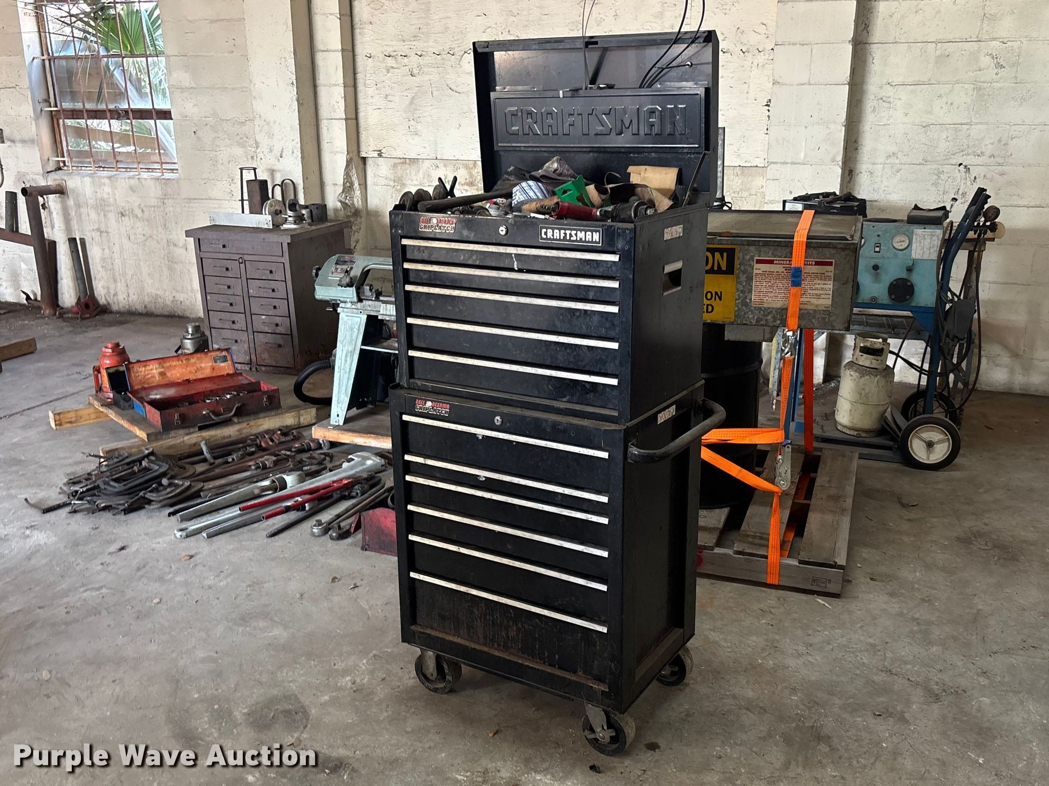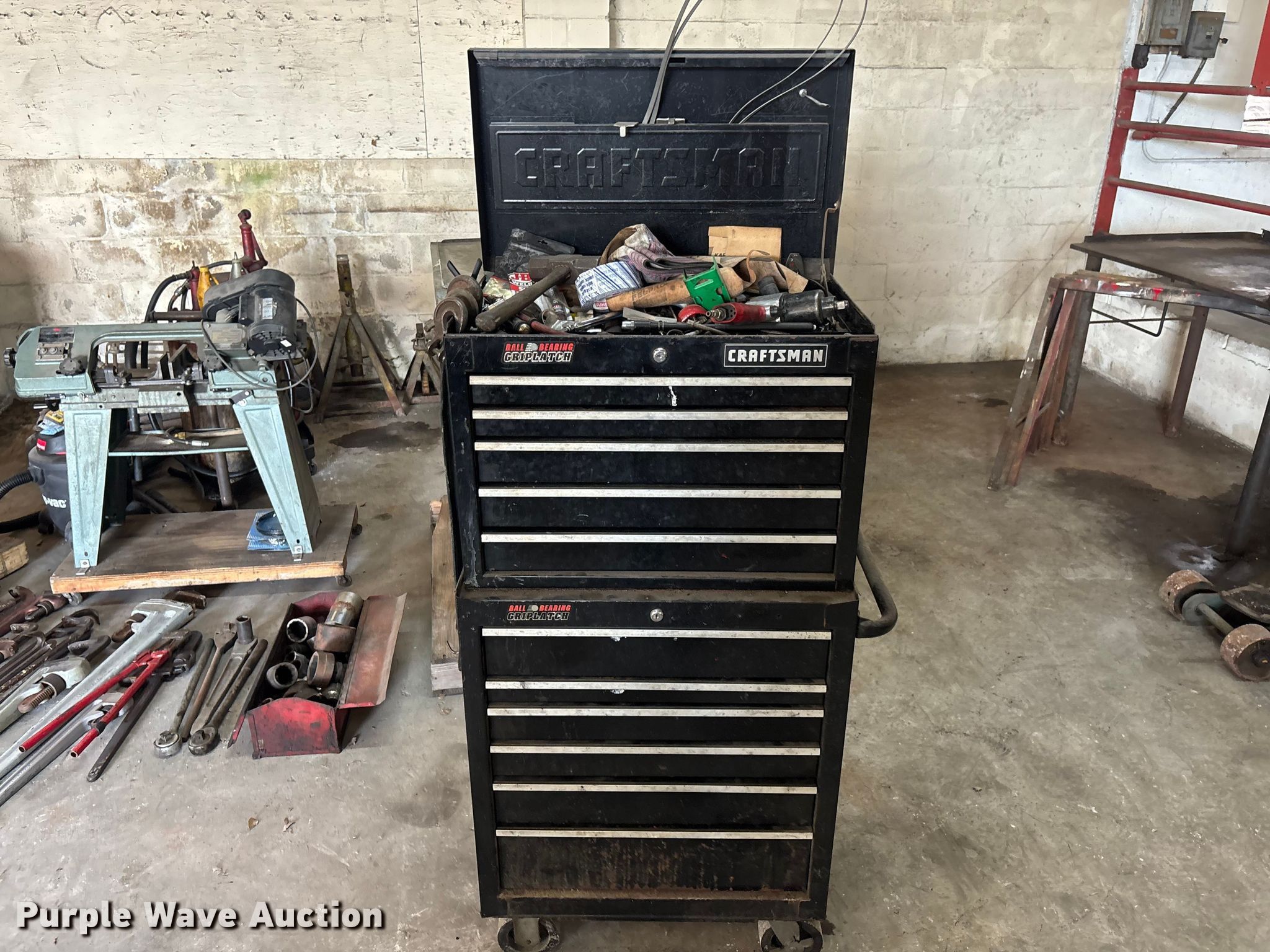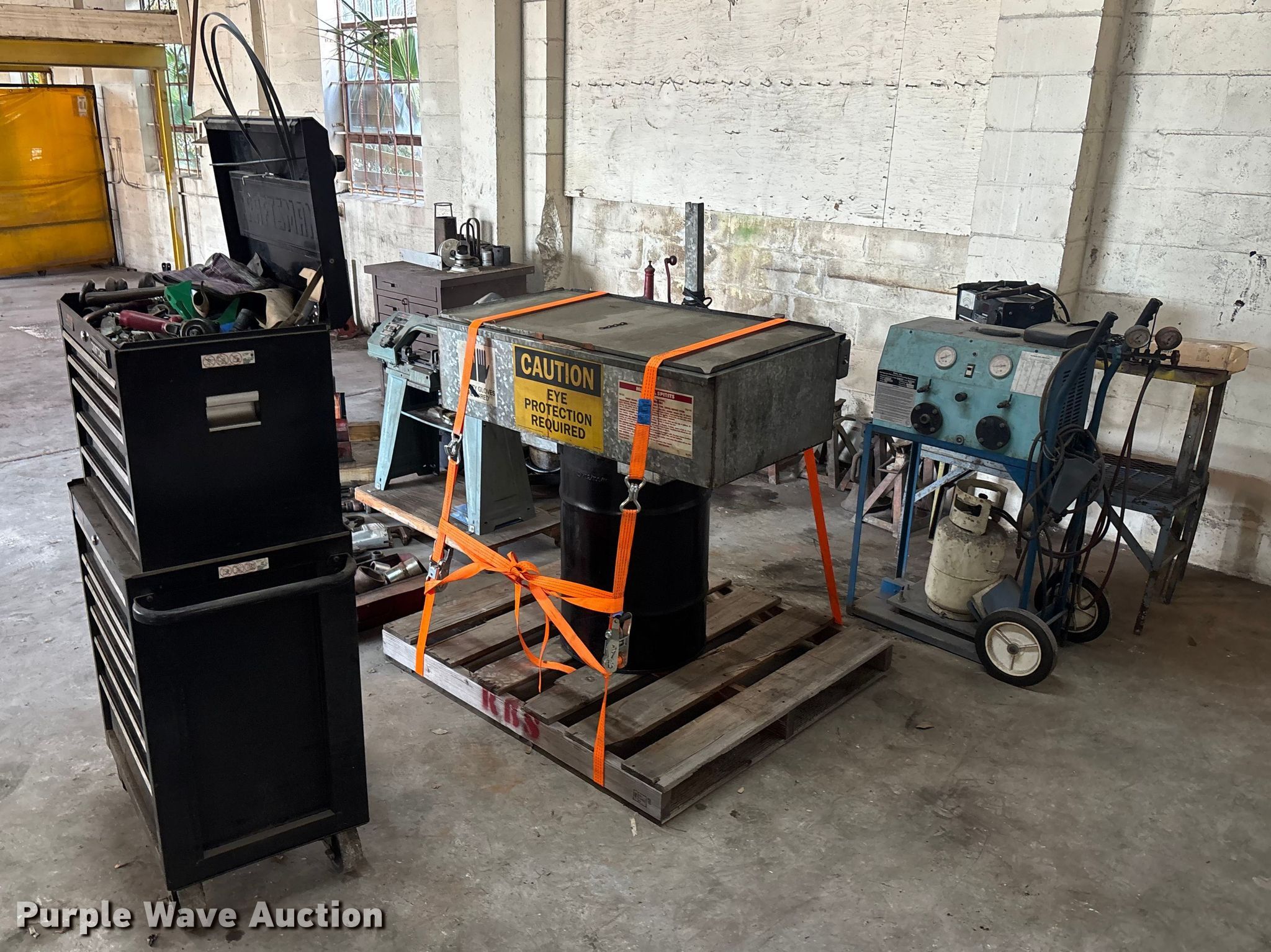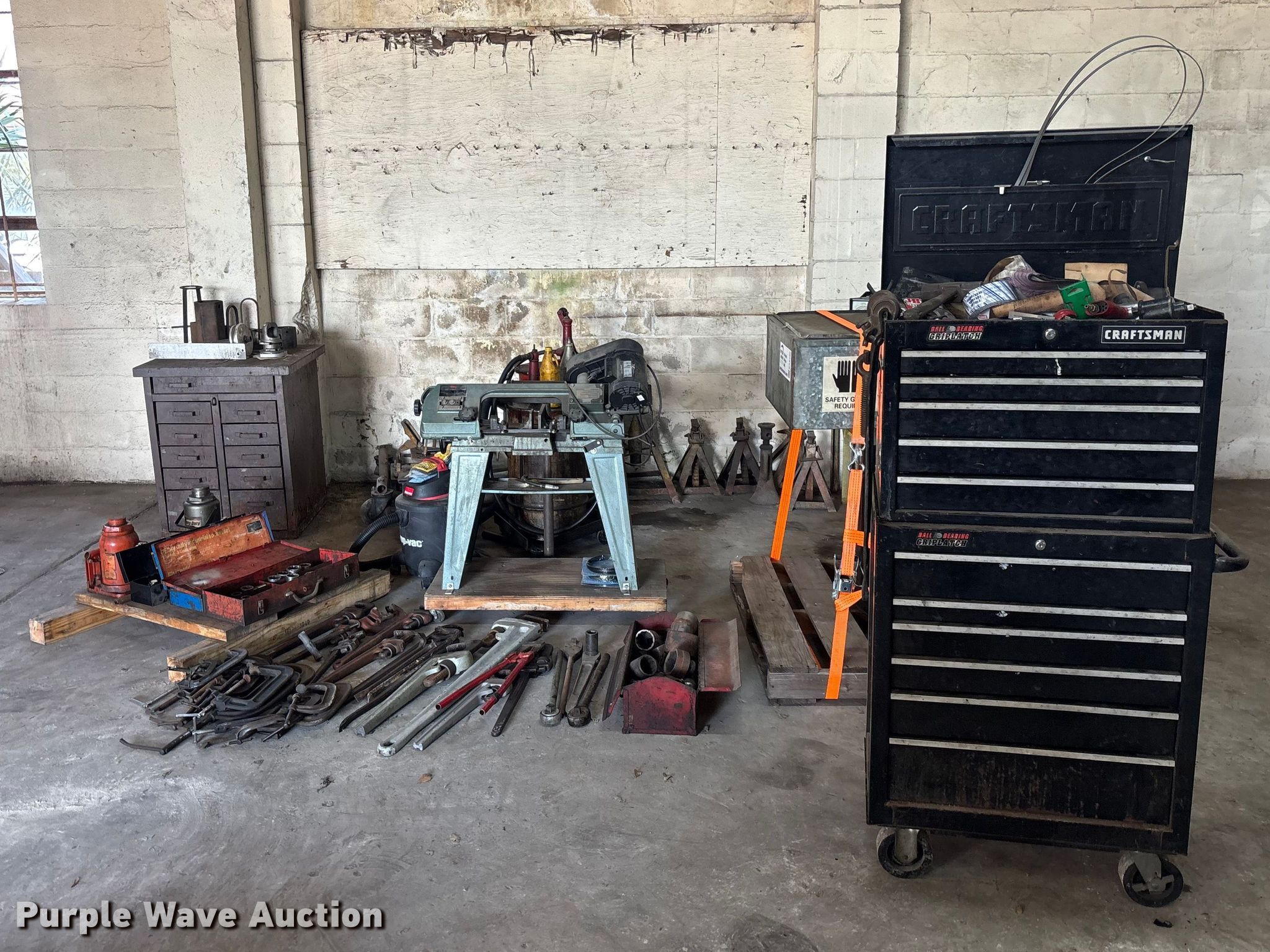 Purple Wave is selling a used Tools in Florida. This item is a Shop tools with the following: Craftsman tool box, C clamps and wrenches, Sockets and jacks, Jack stands, Shop shelf, Shop vacuum, Gear oil reservoirs, Band saw, Refrigerant recovery and recycling equipment, Battery tester