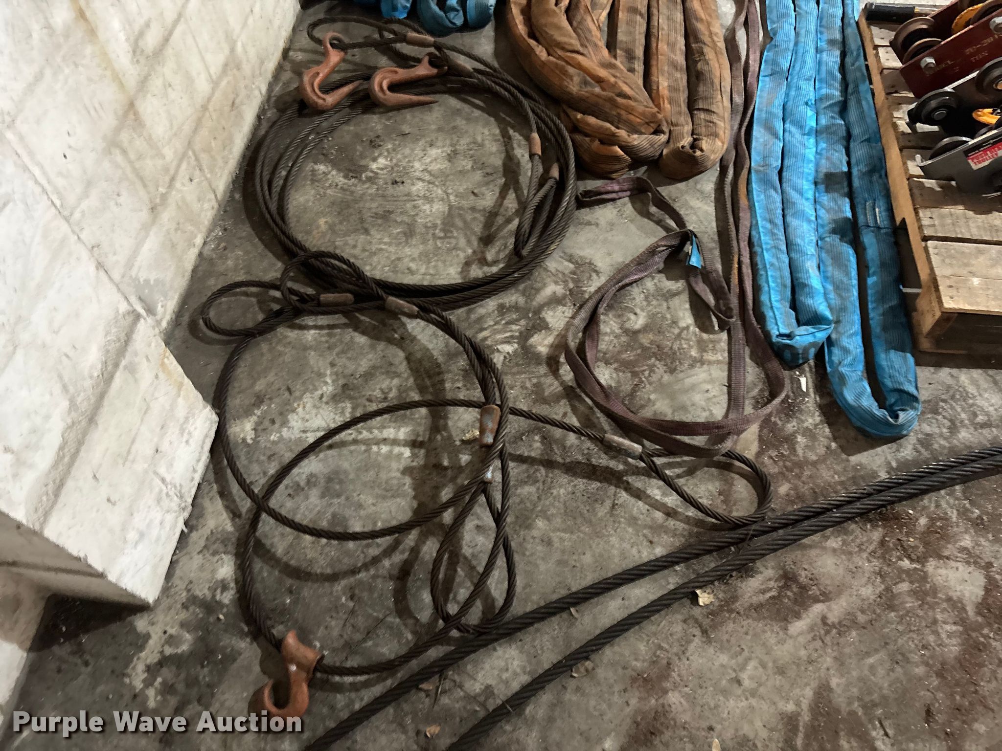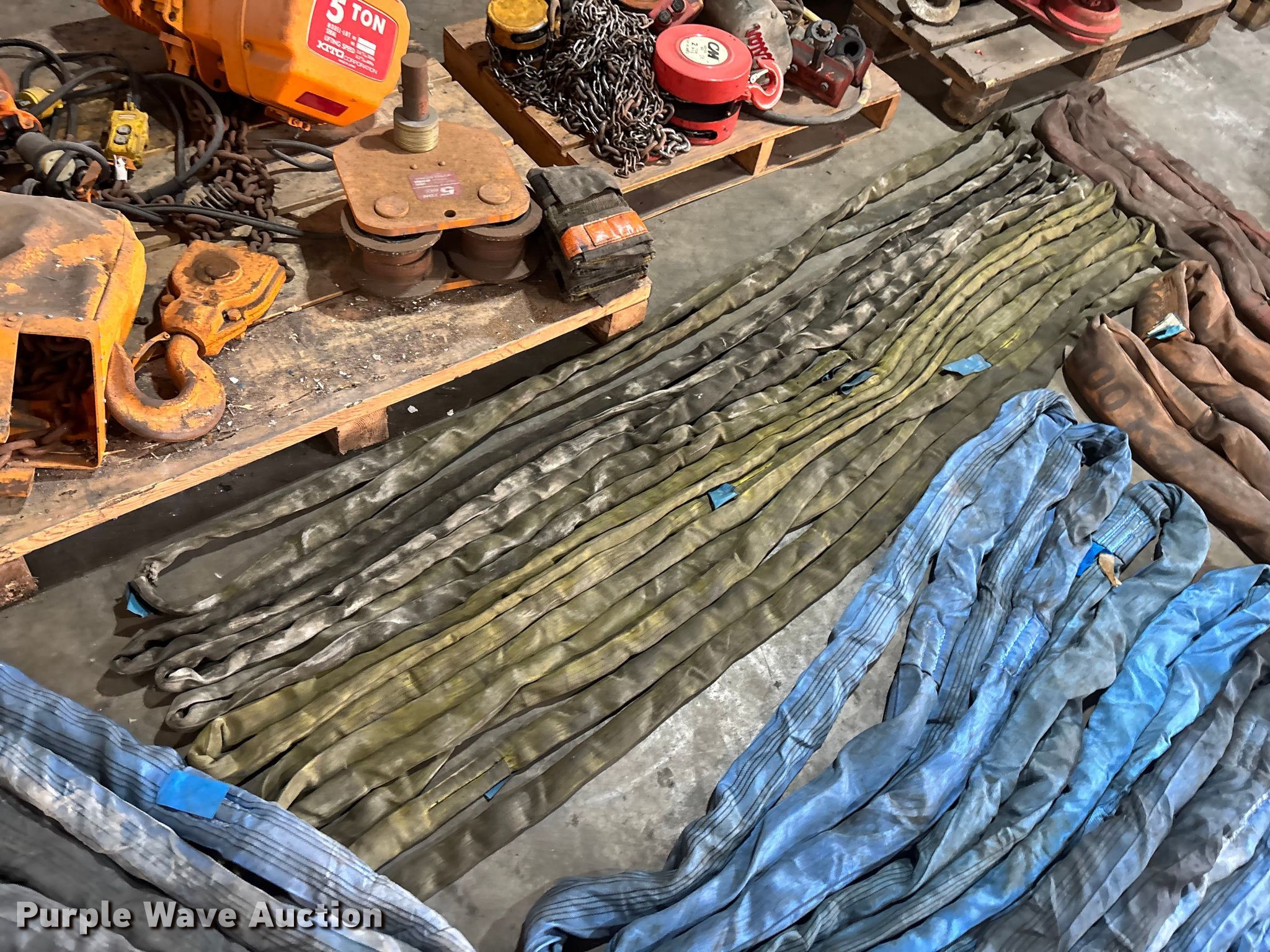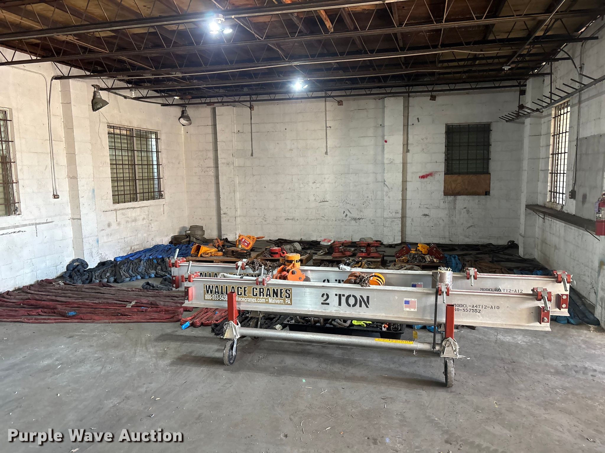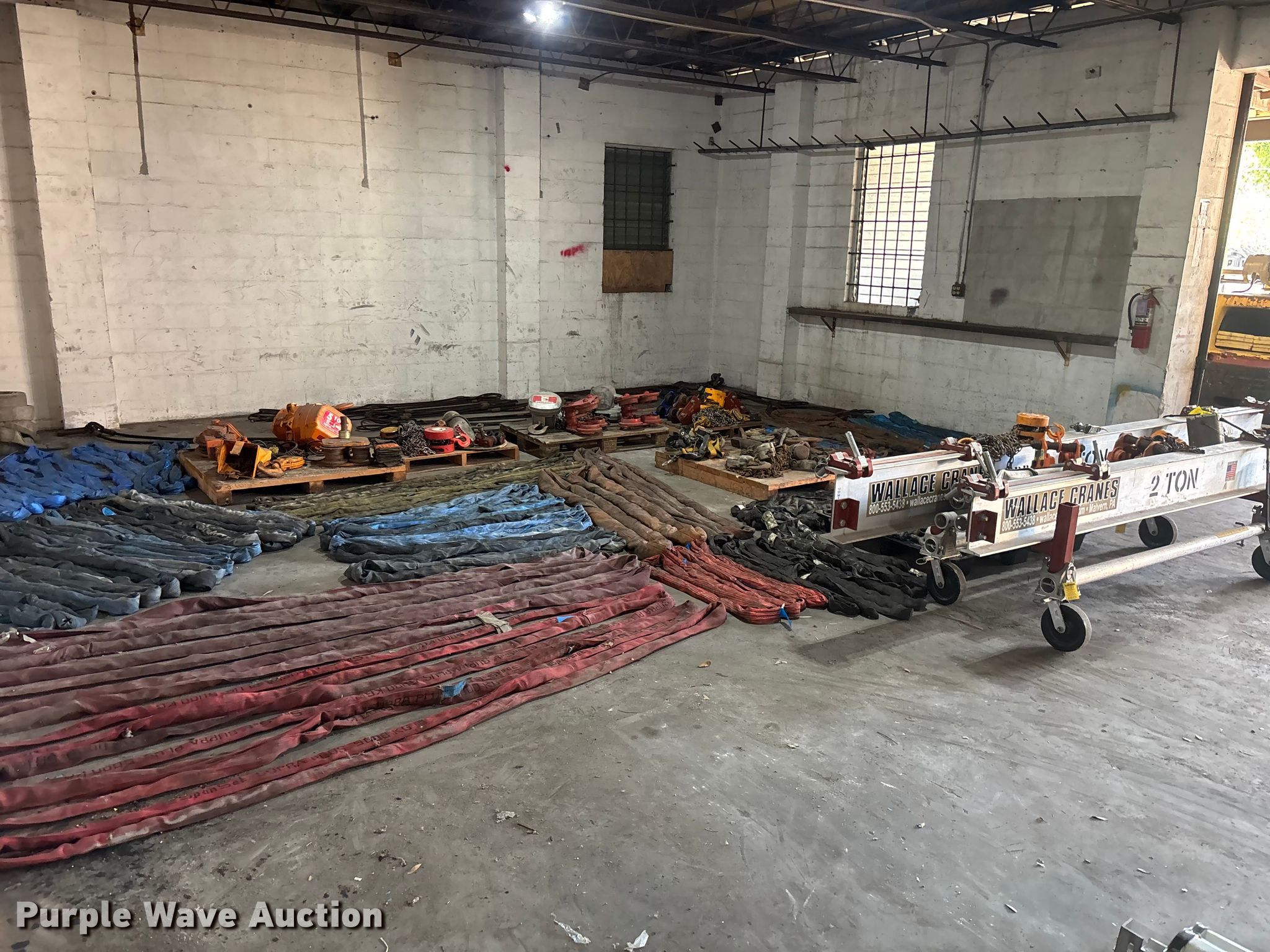 Purple Wave is selling a used Lifting and Rigging in Florida. This item is a Crane attachments and rigging equipment with the following: Wallace gantry crane, Capacity: 2 tons, Slings, Shackles, Capacity: 25 tons, Chain hoists, Cable slings