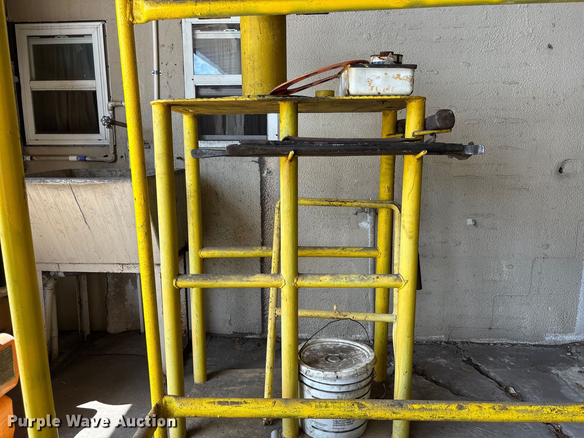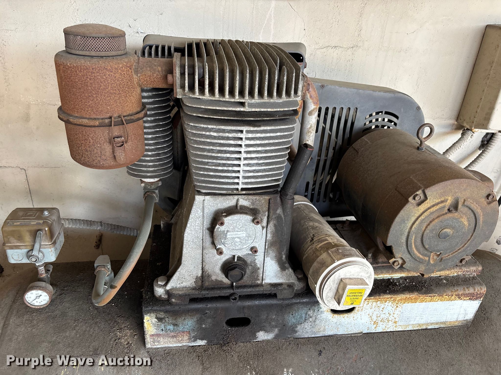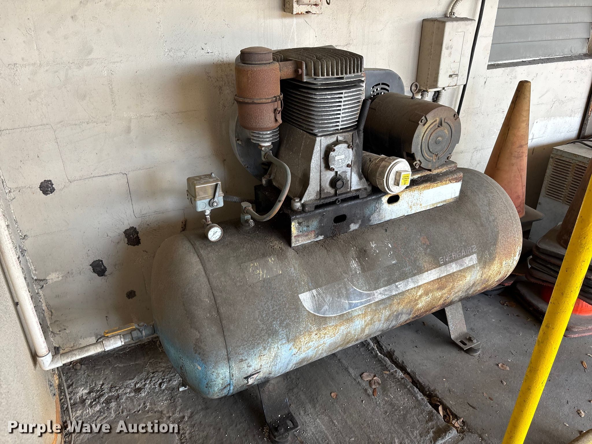 Purple Wave is selling a used Tools in Florida. This item is a Tire equipment and air compressor with the following: Tire gauge, Tire rack, Tire irons, Marathon air compressor, Phase: 3