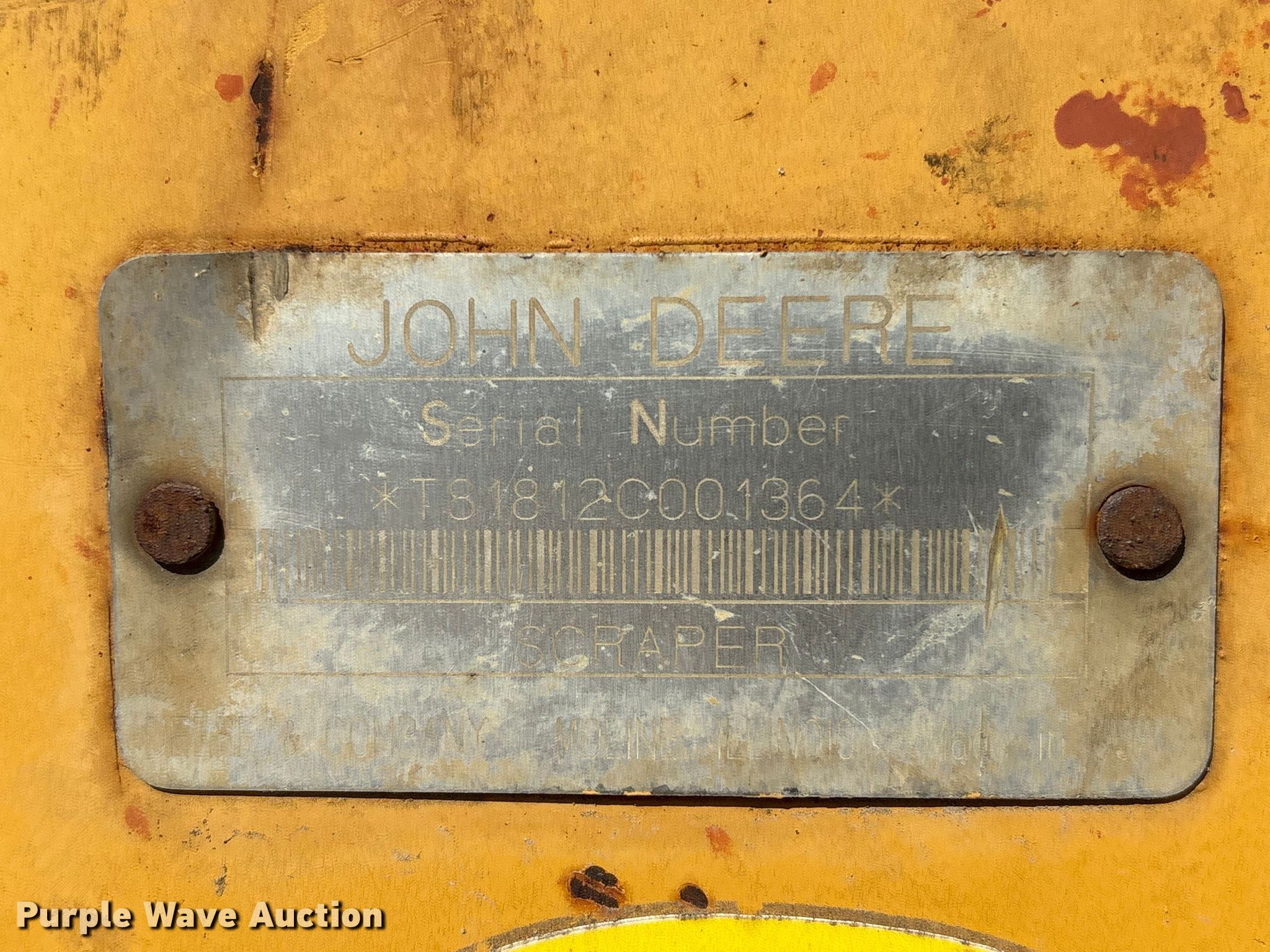 Purple Wave is selling a used Pull Type Scraper in Texas. This item is a 2001 John Deere 1812C scraper with the following: Serial: T818120001364