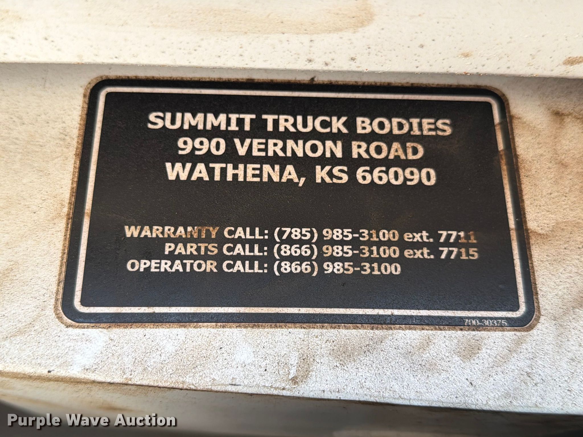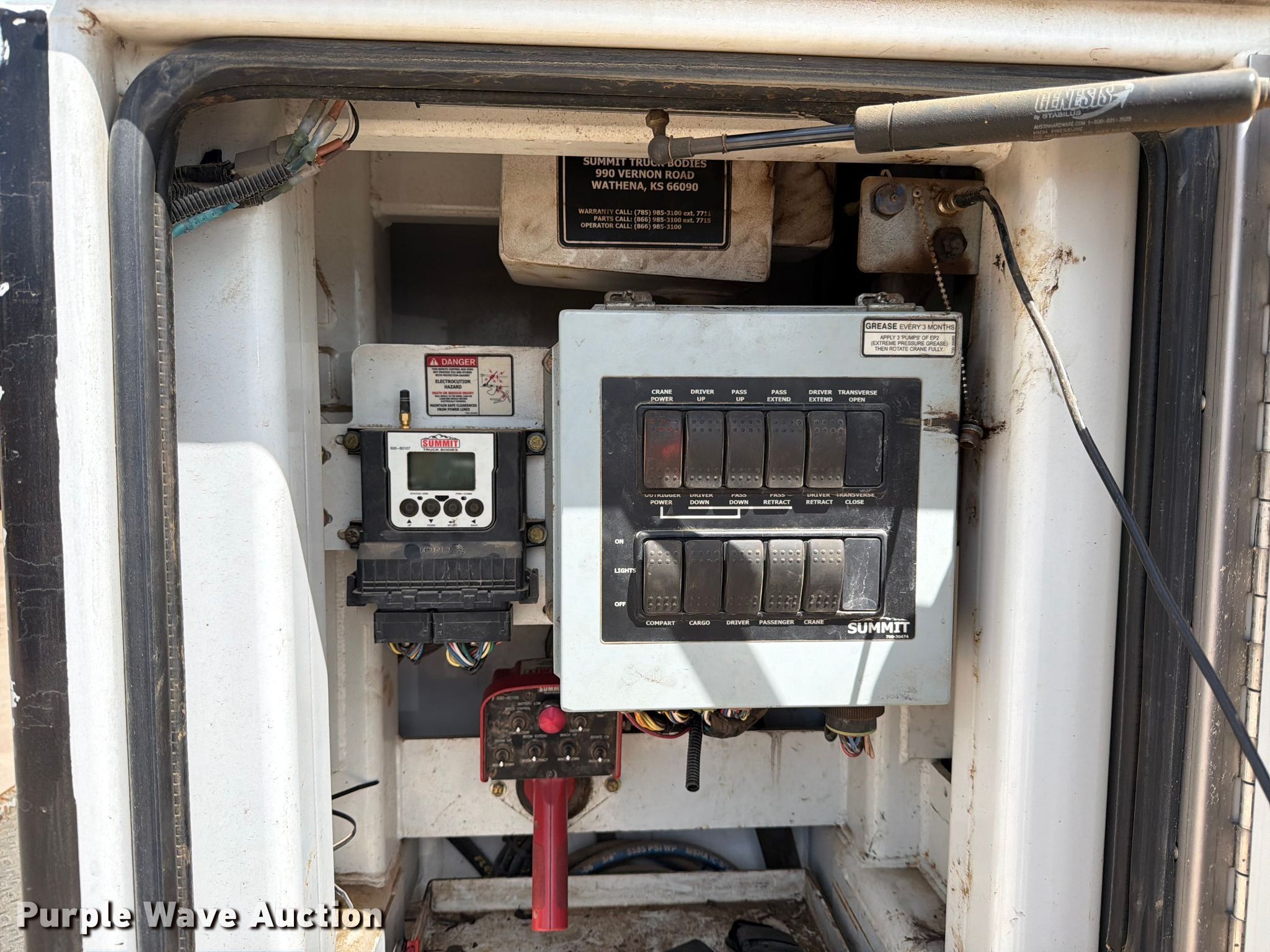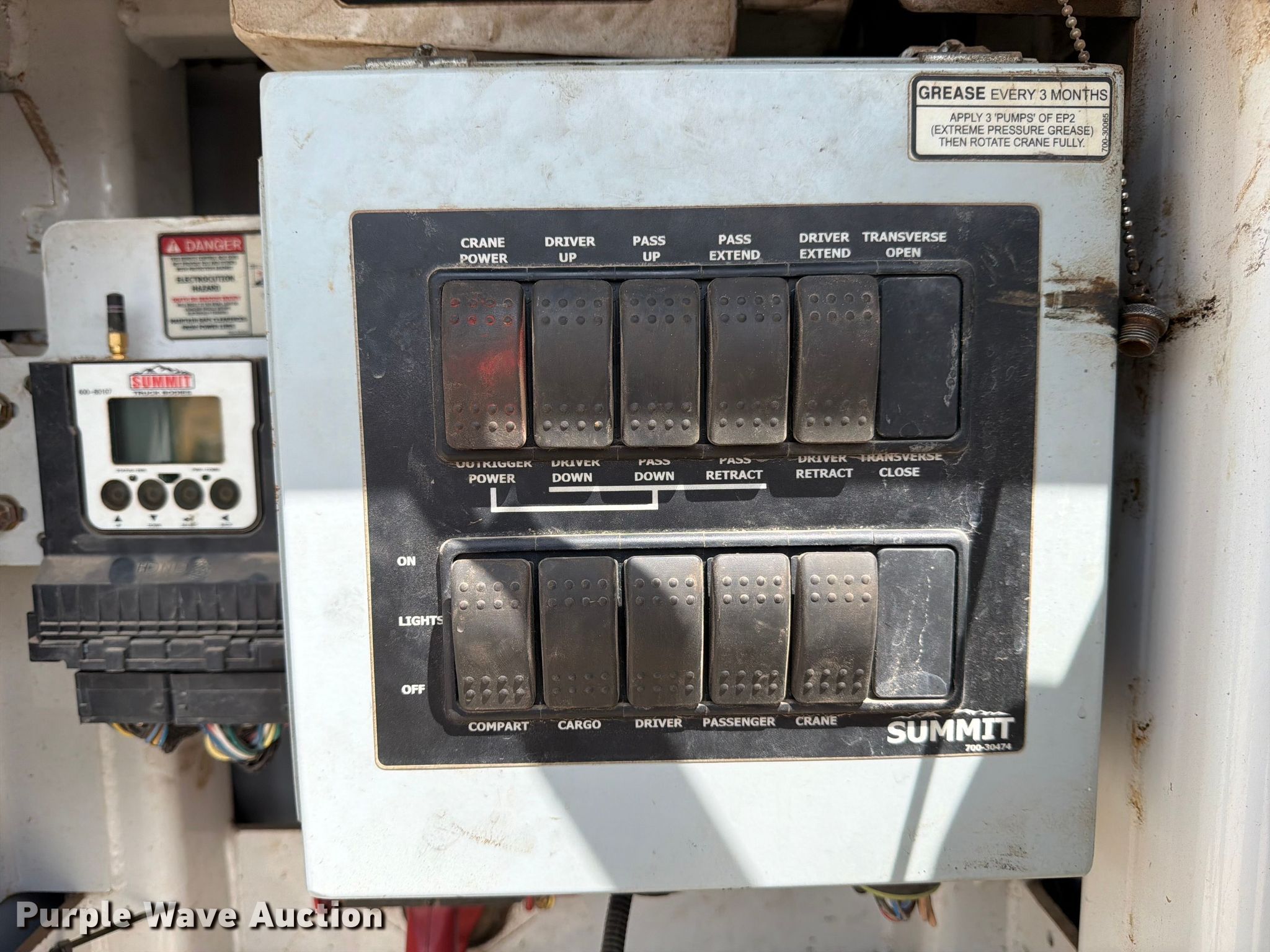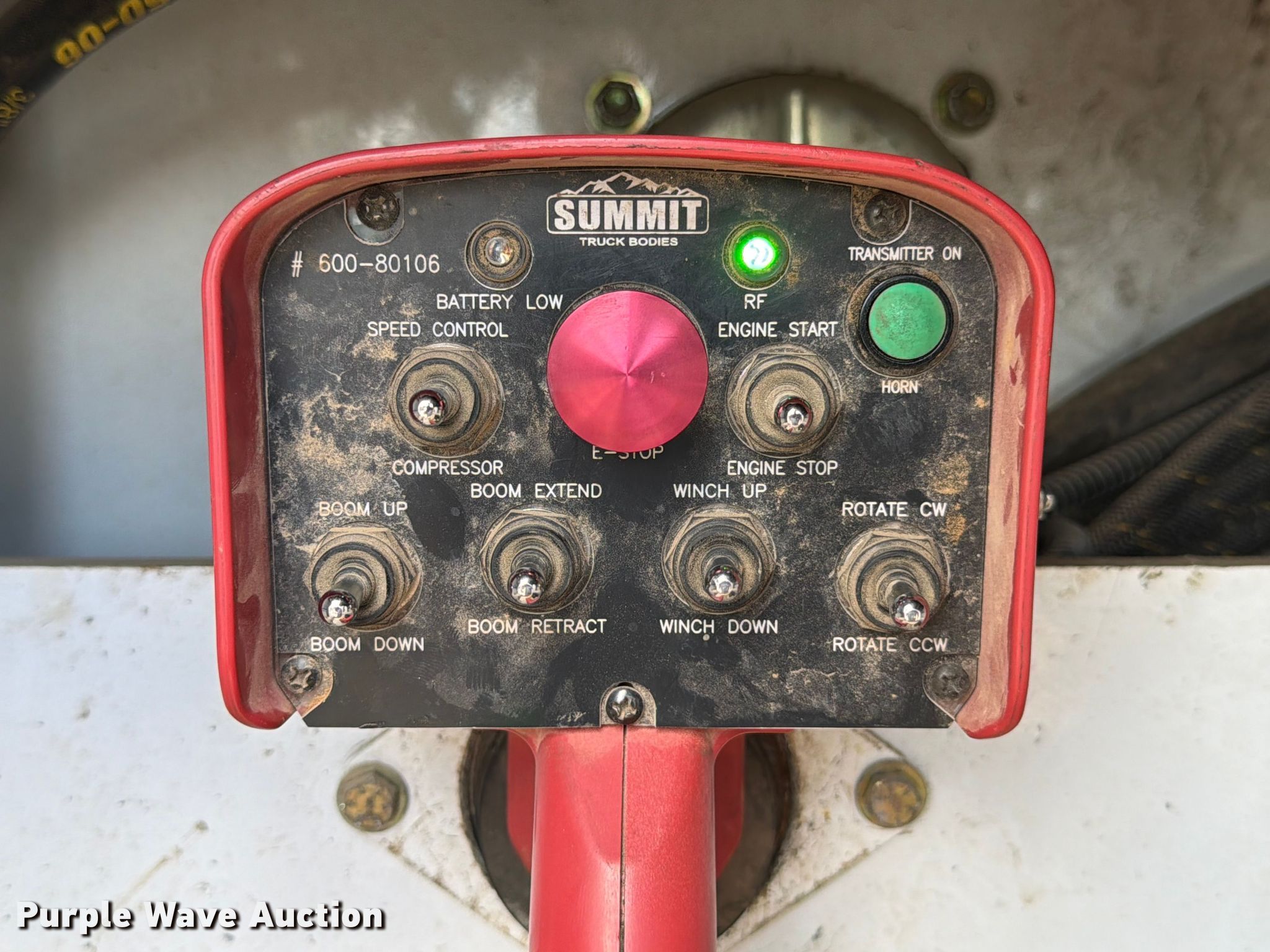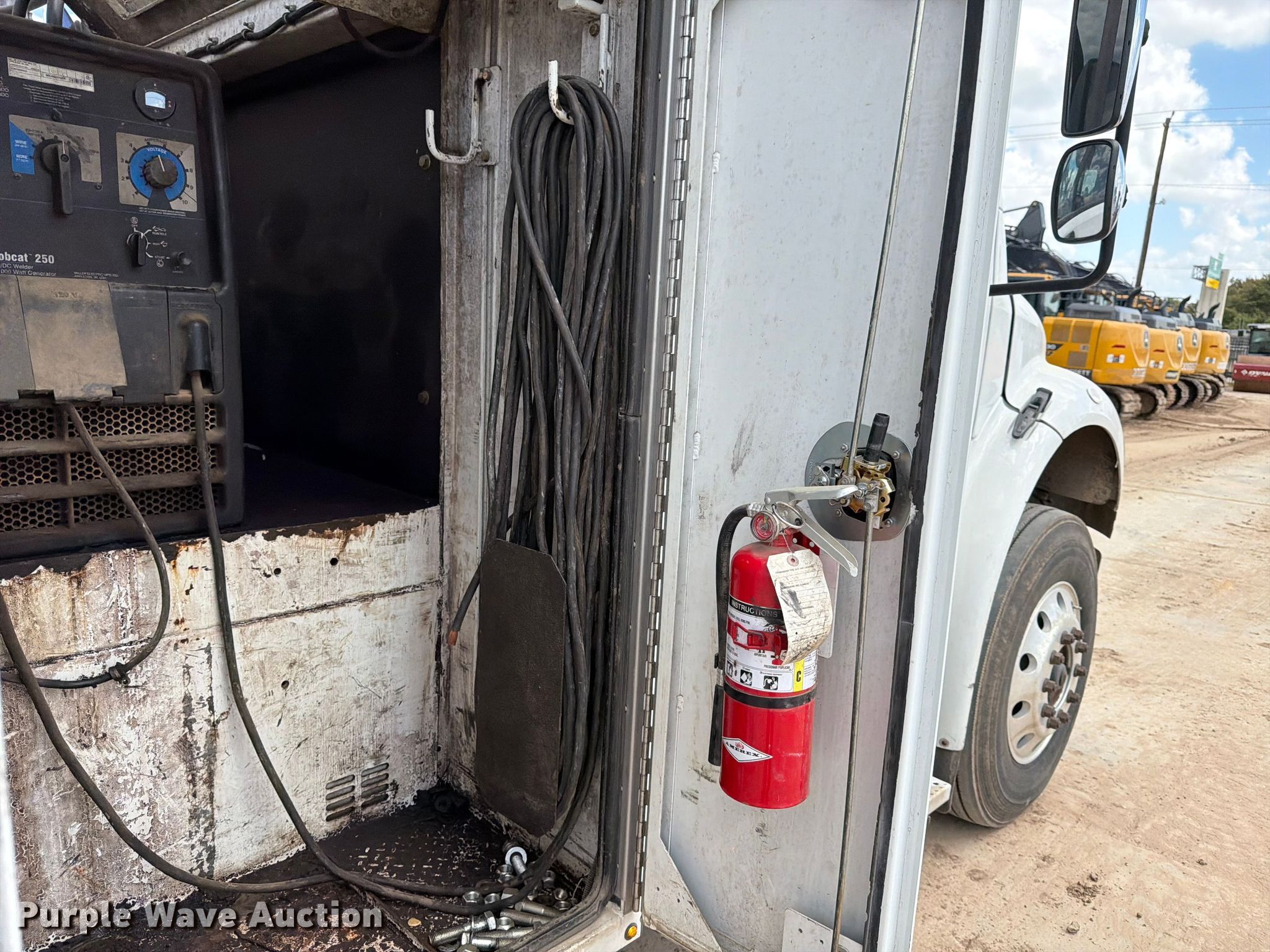 2014 Freightliner Business Class M2 utility / service truck. Miles: 363,595 on odometer, VIN: 3ALACXCY8EDFY5874. Engine Cummins ISL9 350, Serial: 73602255, Displacement: 8.9L, Cylinders: 6, Fuel type: Diesel, HP: 350. Transmission Eaton Fuller, Manual, Speed: 10. Chassis Axles: Single, Suspension: Air, Brakes: Air, PTO, Wet kit, GVWR: 33,000 lbs. Interior AC, Heat, Heated mirrors, Power windows, Power locks, Cruise control, Auxiliary controls. Features Bed Utility bed, Summit Truck Bodies, Length: 14', Width: 98", Welder/generator Miller Bobcat 250, Hours: 186 on meter, Fuel type: Gas, 240V outlets: 1, 120V outlets: 5, Watts: 11,000, Welder type: Stick (AC/DC), Air compressor Vanair RC 40, Oil/lube system Hose reels, Pump, Crane Summit. Tires Size: 11R22.5. Notes Dash warning indicator: ABS. Texas title. Title distribution may be delayed up to 30 days from verification of funds. Dealer Inventory Reduction. Houston, TX 77037