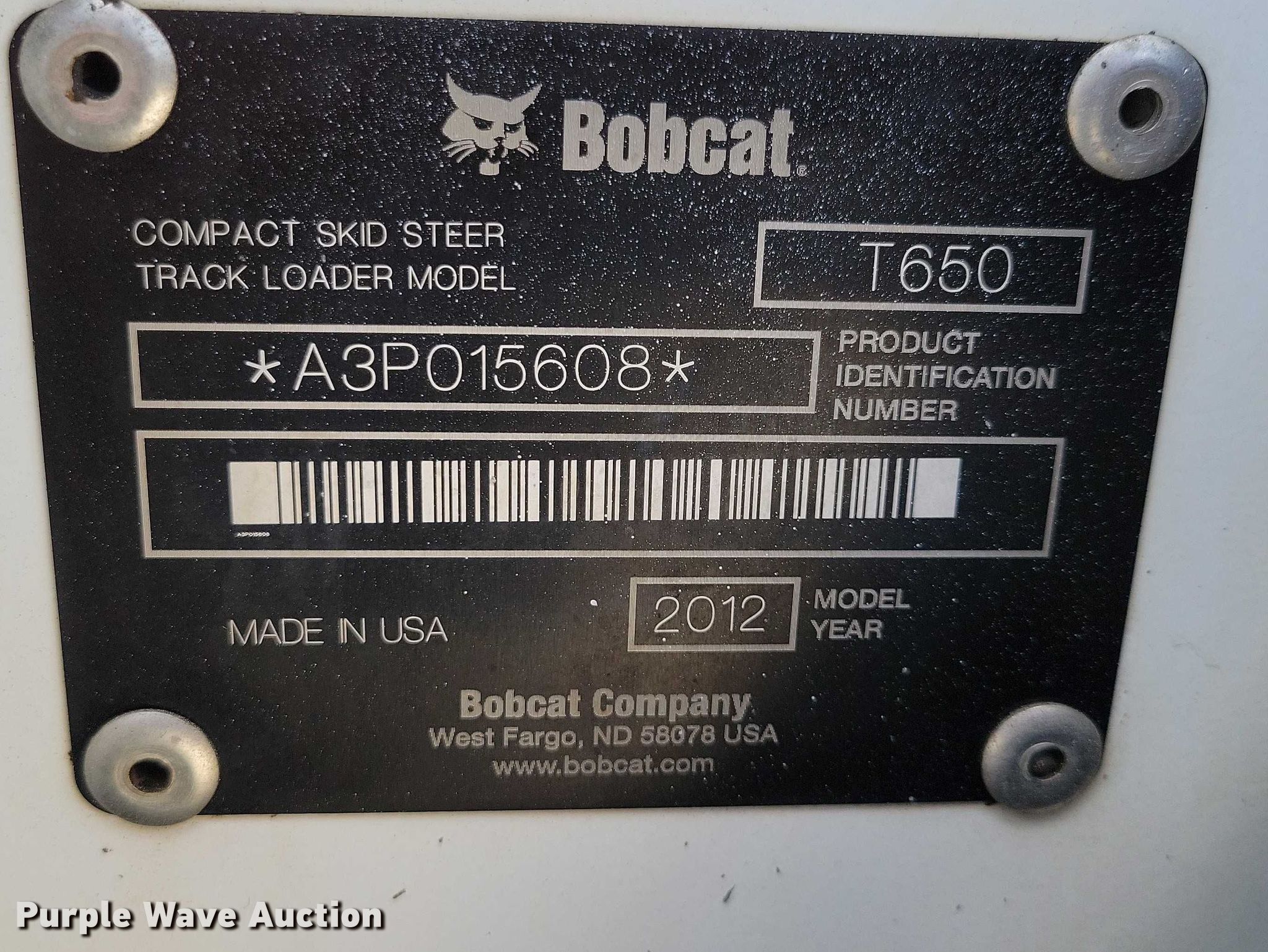 Purple Wave is selling a used Tracked Skid Steer Loader in Iowa. This item is a 2012 Bobcat T650 tracked skid steer loader with the following: Hours: 2,149 on meter, Serial: A3P015608