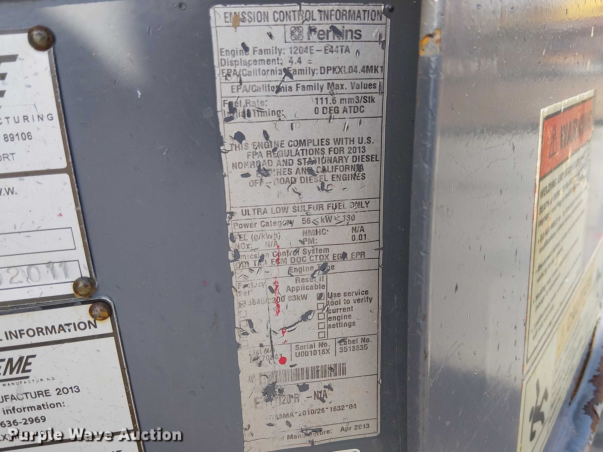 2013 Xtreme XR1245 telehandler. Serial: XR1245071392011, Unit #: 92011. Engine Perkins, Serial: U001018X, Displacement: 4.4, Cylinders: 4, Fuel type: Diesel, kW: 130. Transmission Powershift, 3F - 3R, Four wheel drive. Operators station OROPS, Steering: Crab, Four wheel. Features Maximum lift capacity: 12,000 lbs, Maximum lift height: 45', Boom stages: 4, Fork length: 72", Tilt carriage, Hydraulic outriggers. Tires Size: 15.5-25, Foam filled. Guy F. Atkinson ,LLC. Corona, CA 92879