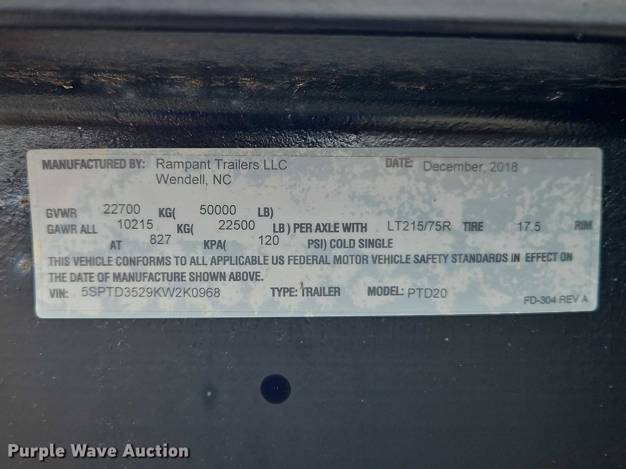 2019 Rampart PTD20 equipment trailer. VIN: 5SPTD3529KW2K0968. Dimensions Overall Length: 48', Width: 101", Deck Length: 30', Width: 101", Deck height: 34", Tail length: 5', Ramps: Manual Length: 5' 9". Features Deck type: Wood. Chassis Hitch: Pintle, Landing gear: Dual, Suspension: Spring, Brakes: Air, Axles: Spread, GVWR: 50,000 lbs, GAWR: 22,500 lbs. Tires Steel wheels, Size: 215/75R17.5. Kansas title. Title distribution may be delayed up to 14 days from verification of funds. Spring Hill, KS 66083