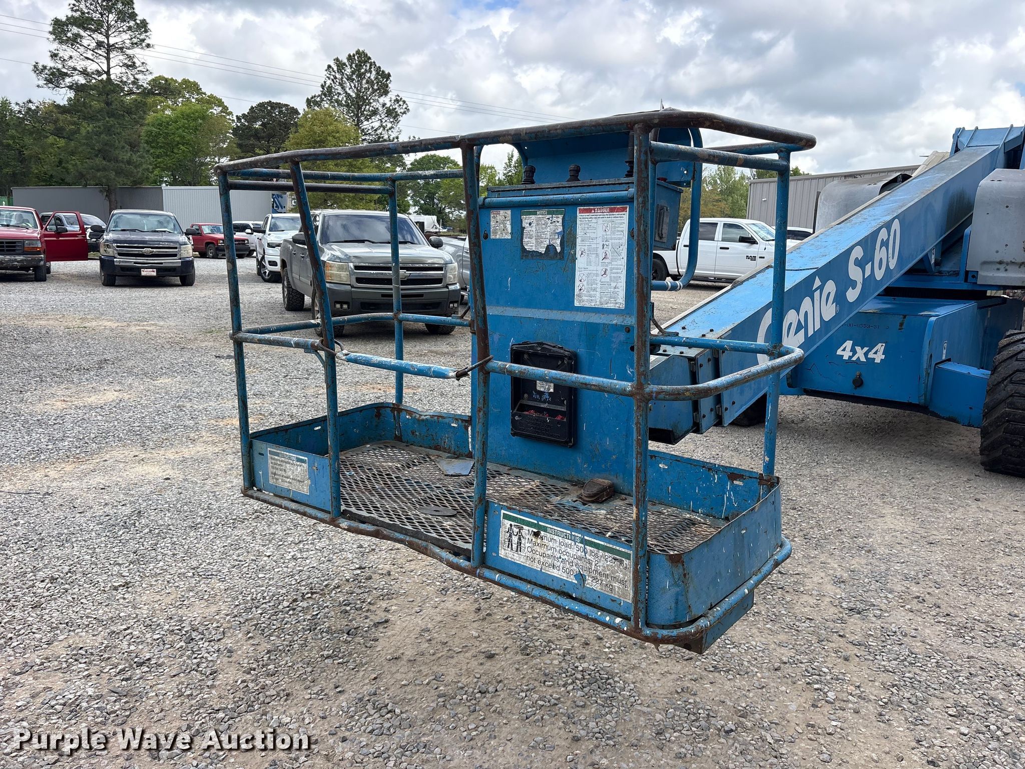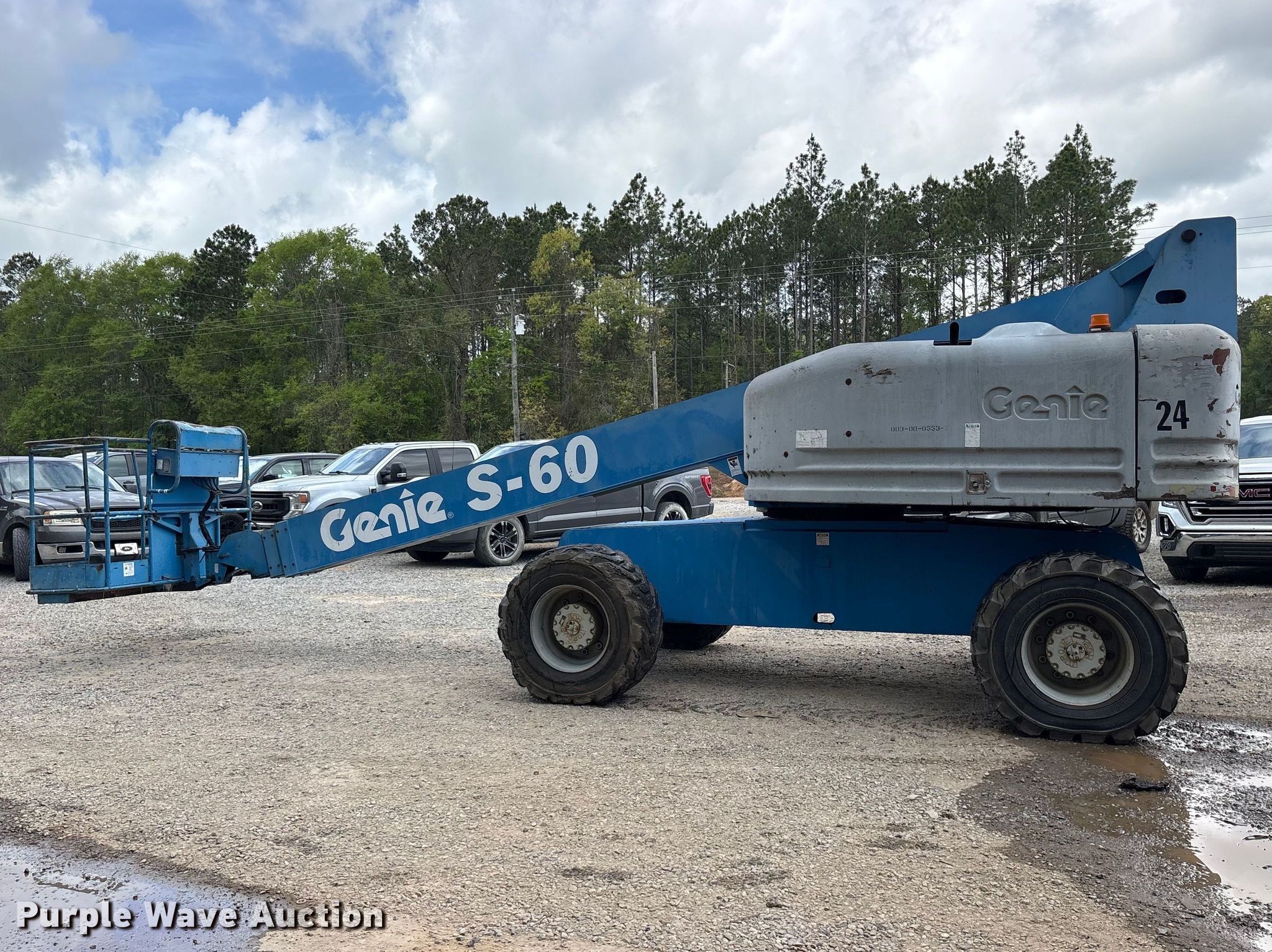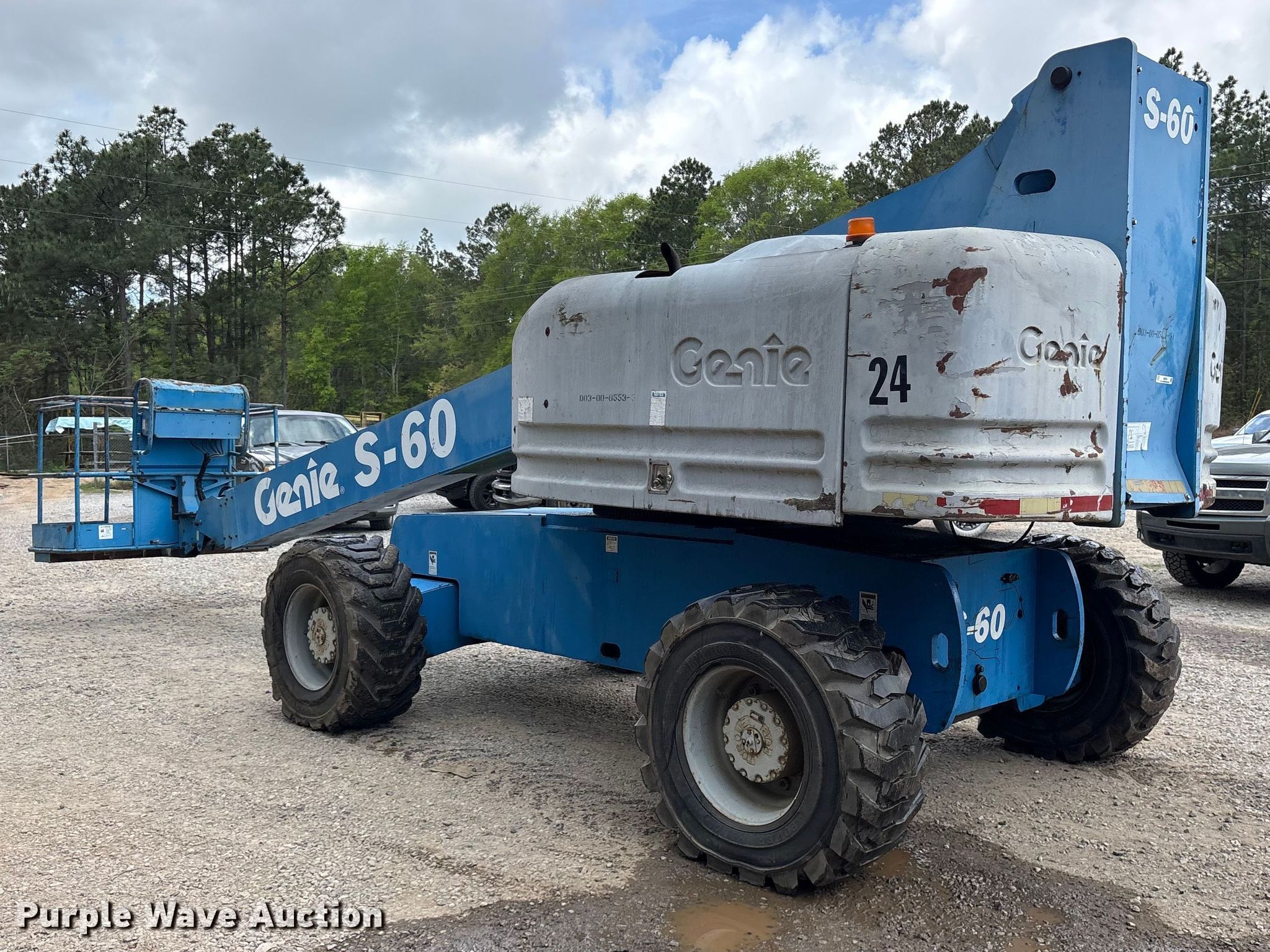 2000 Genie S-60 boom lift. Hours: 5,848 on meter, Serial: S60-6786. Engine Deutz F3L 1011, Displacement: 2.05L, Cylinders: 3, Fuel type: Diesel. Chassis Four wheel drive. Features Rough terrain, Boom type: Telescopic, Maximum lift capacity: 600 lbs, Maximum reach length: 60', Maximum lift height: 60', Platform: 69" L x 29" W, AC power outlet, Controls: Platform, Ground, Platform rotation: Hydraulic. Tires Front: 385/65D19.5, Rear: 15-19.5. Deep South Machine Works. Richton, MS 39476