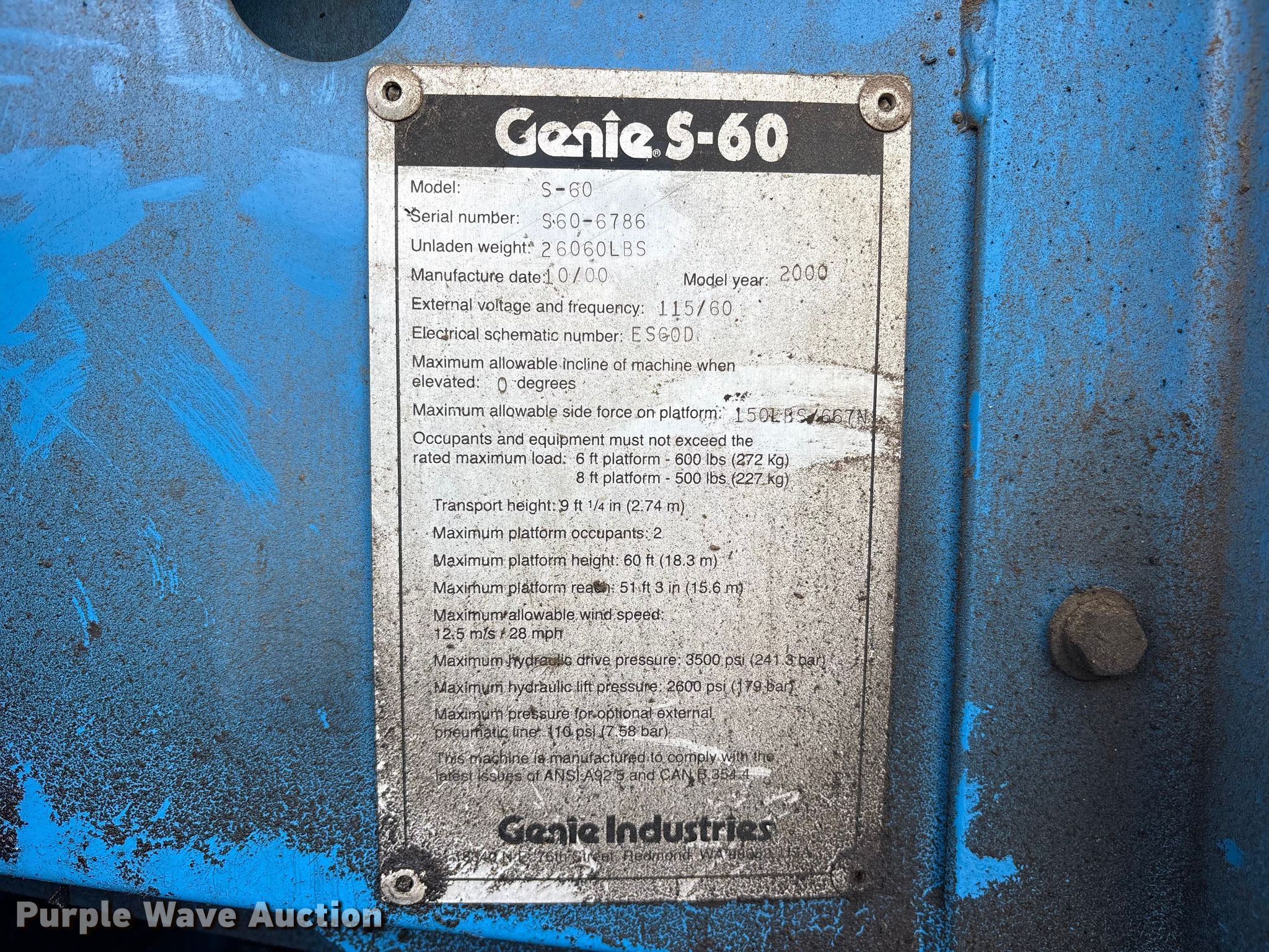 Purple Wave is selling a used Boom Lift in Mississippi. This item is a 2000 Genie S-60 boom lift with the following: Hours: 5,848 on meter, Serial: S60-6786