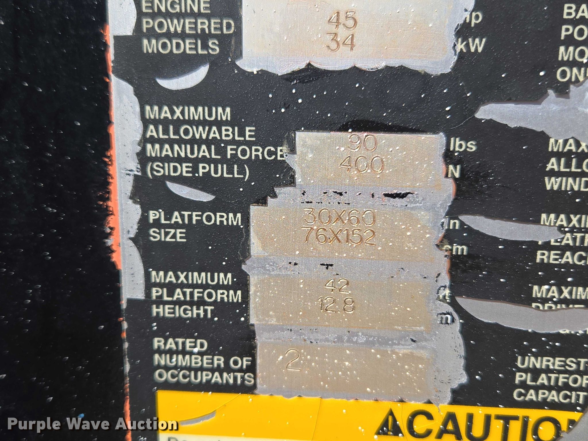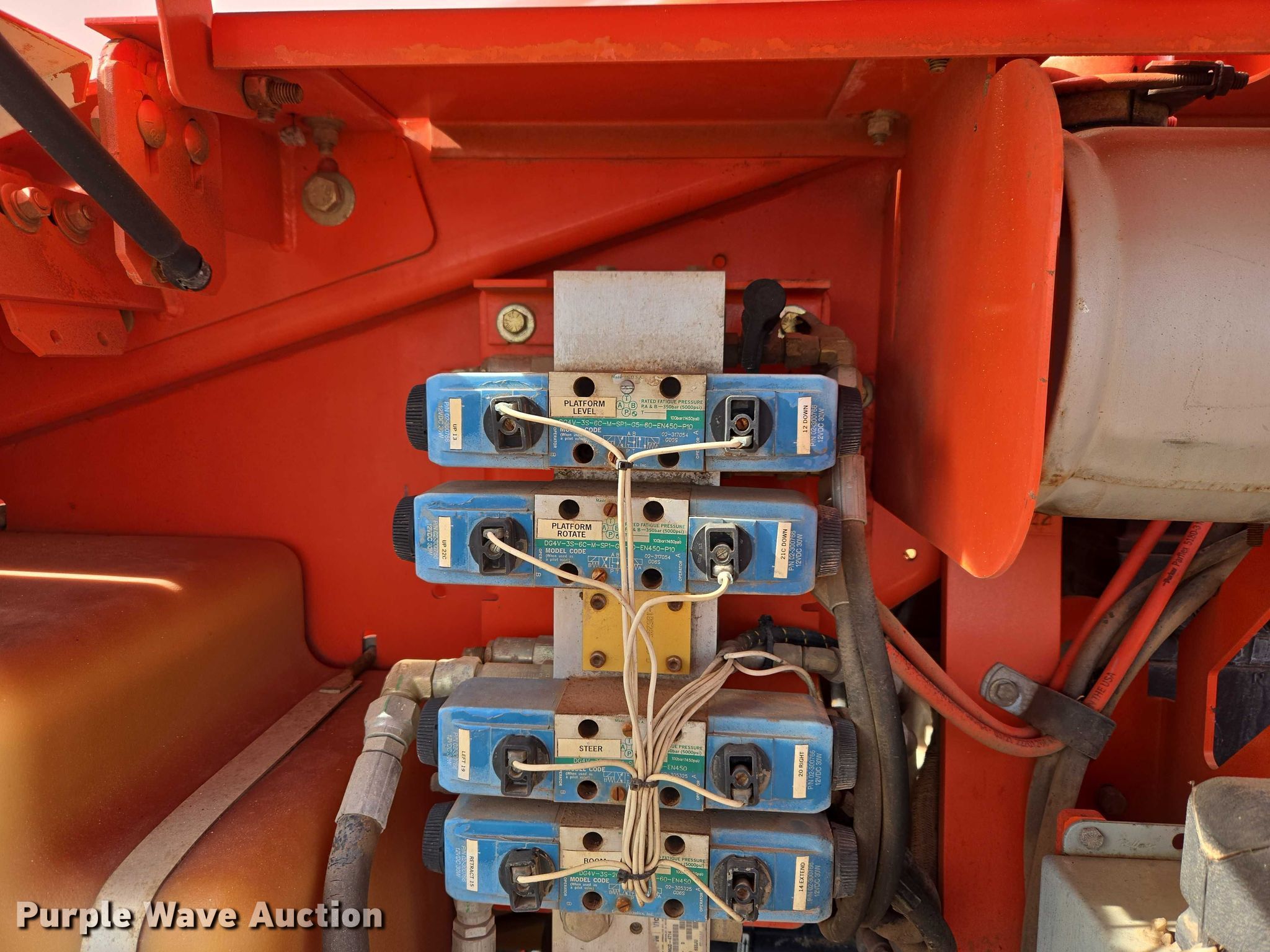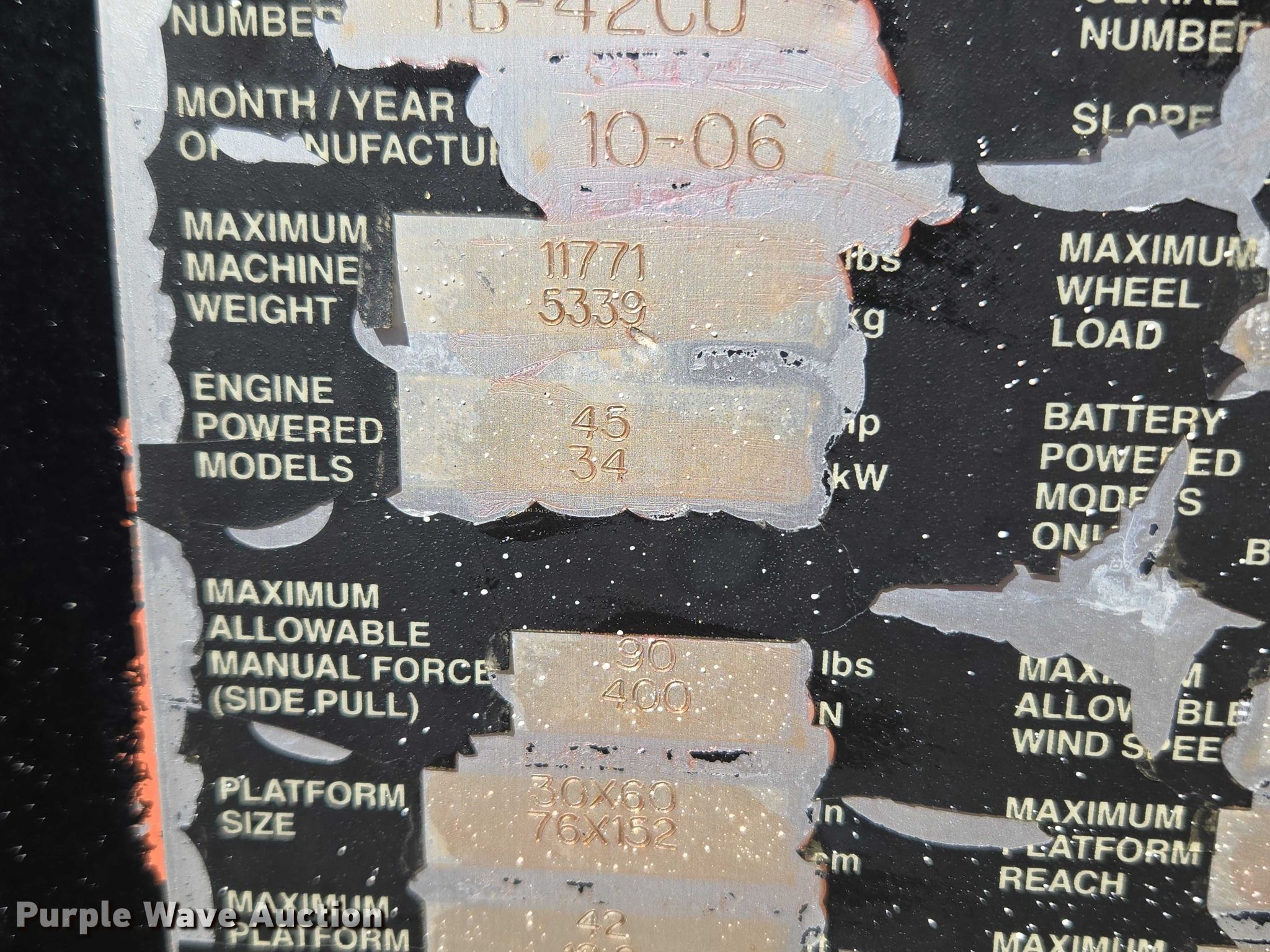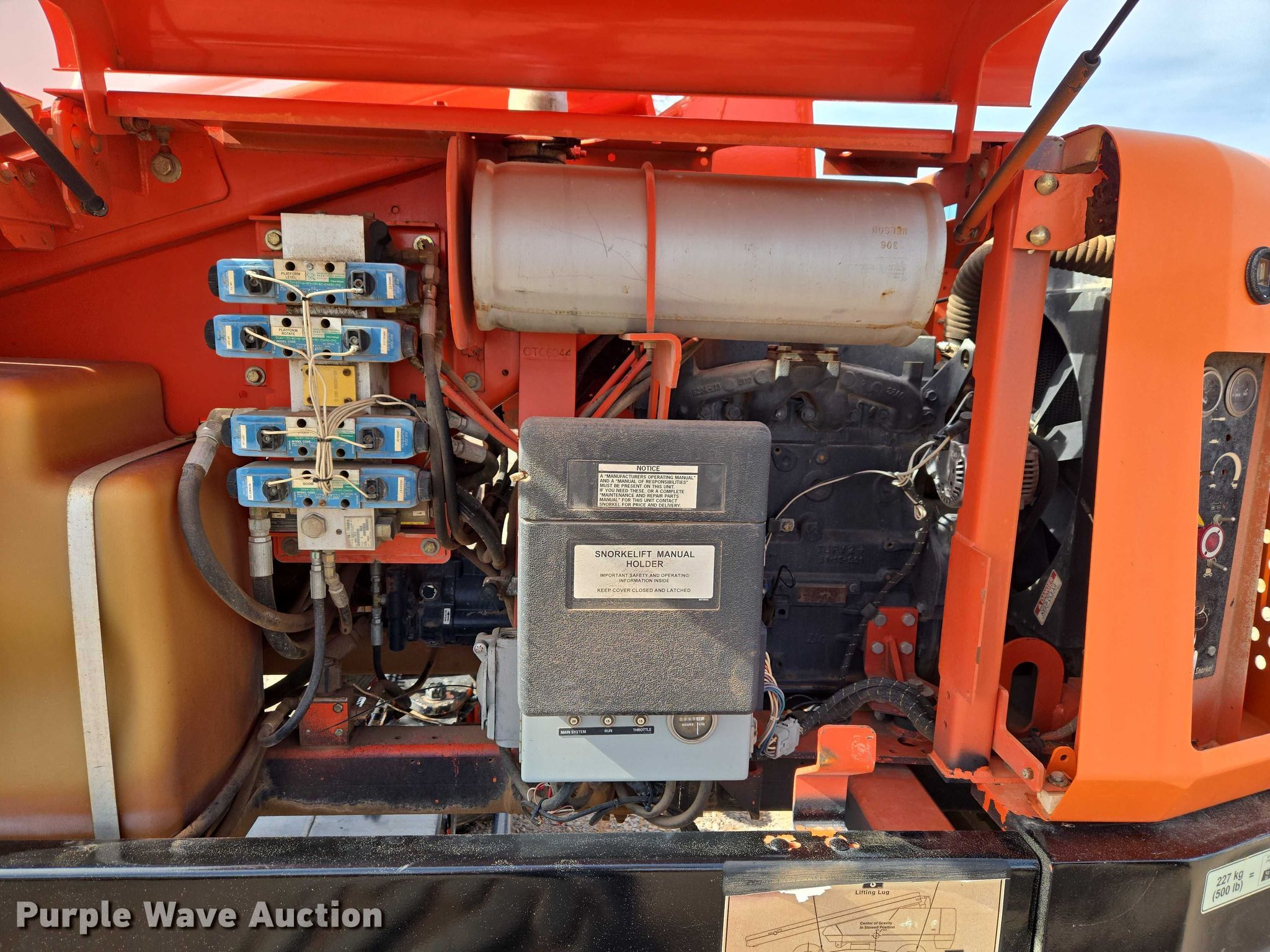 2007 Snorkel TB-42CU boom lift. Hours: 2,068 on meter, Serial: 0706044. Engine Cummins B3.3, Displacement: 3.261L, Cylinders: 4, Fuel type: Diesel. Chassis Four wheel drive. Features Rough terrain, Boom type: Telescopic, Maximum reach length: 33', Maximum lift height: 42', Platform: 30" L x 60" W, AC power outlet, Controls: Platform, Ground, Platform rotation: Hydraulic, Safety alarm. Tires Tire size: 12-16.5. DJ's Rentals & Sales, Inc.. 911 South Main Street. Elk City, OK 73644