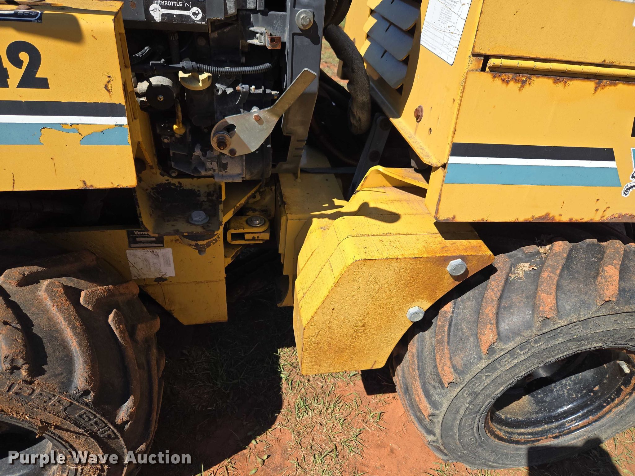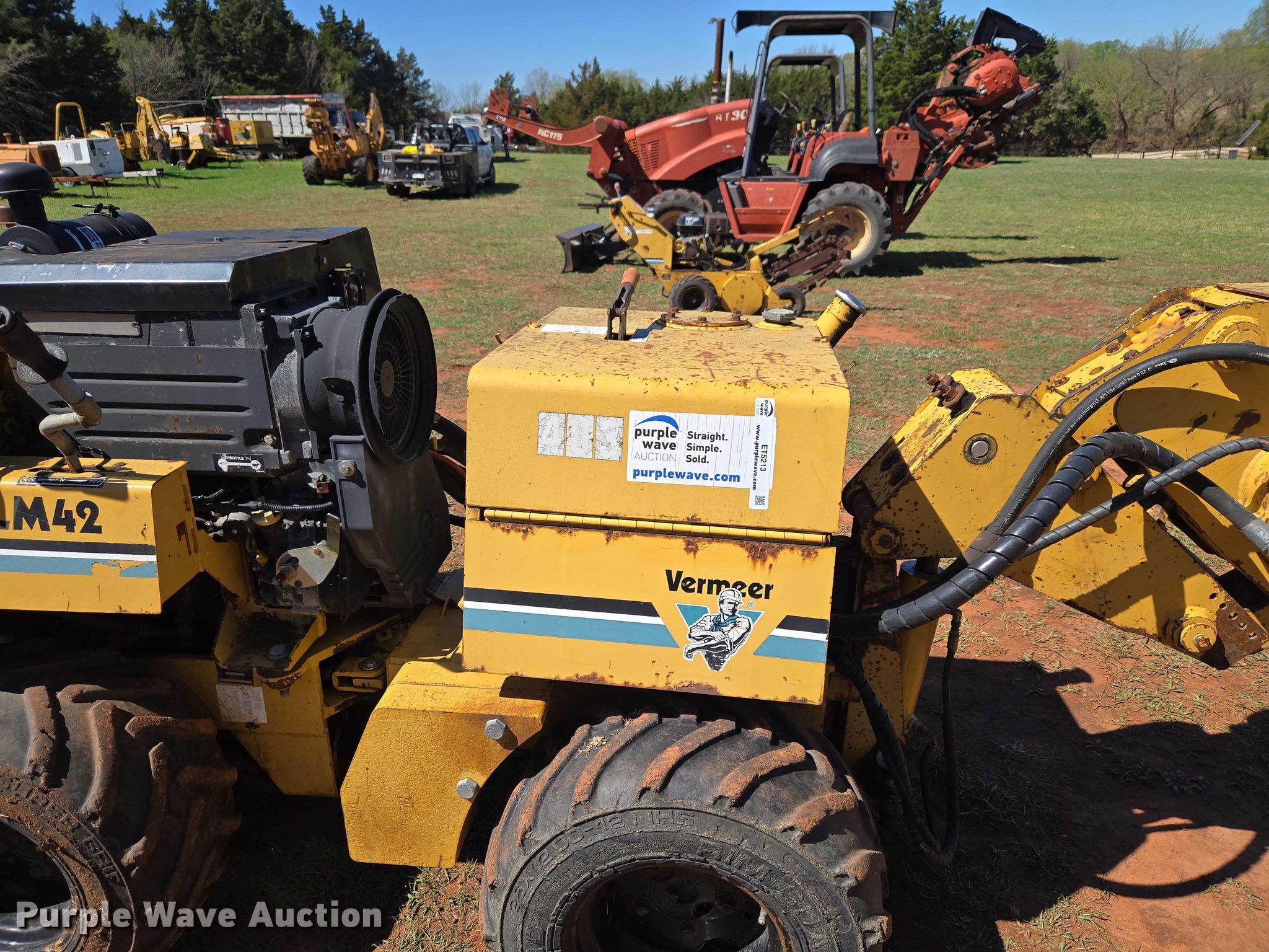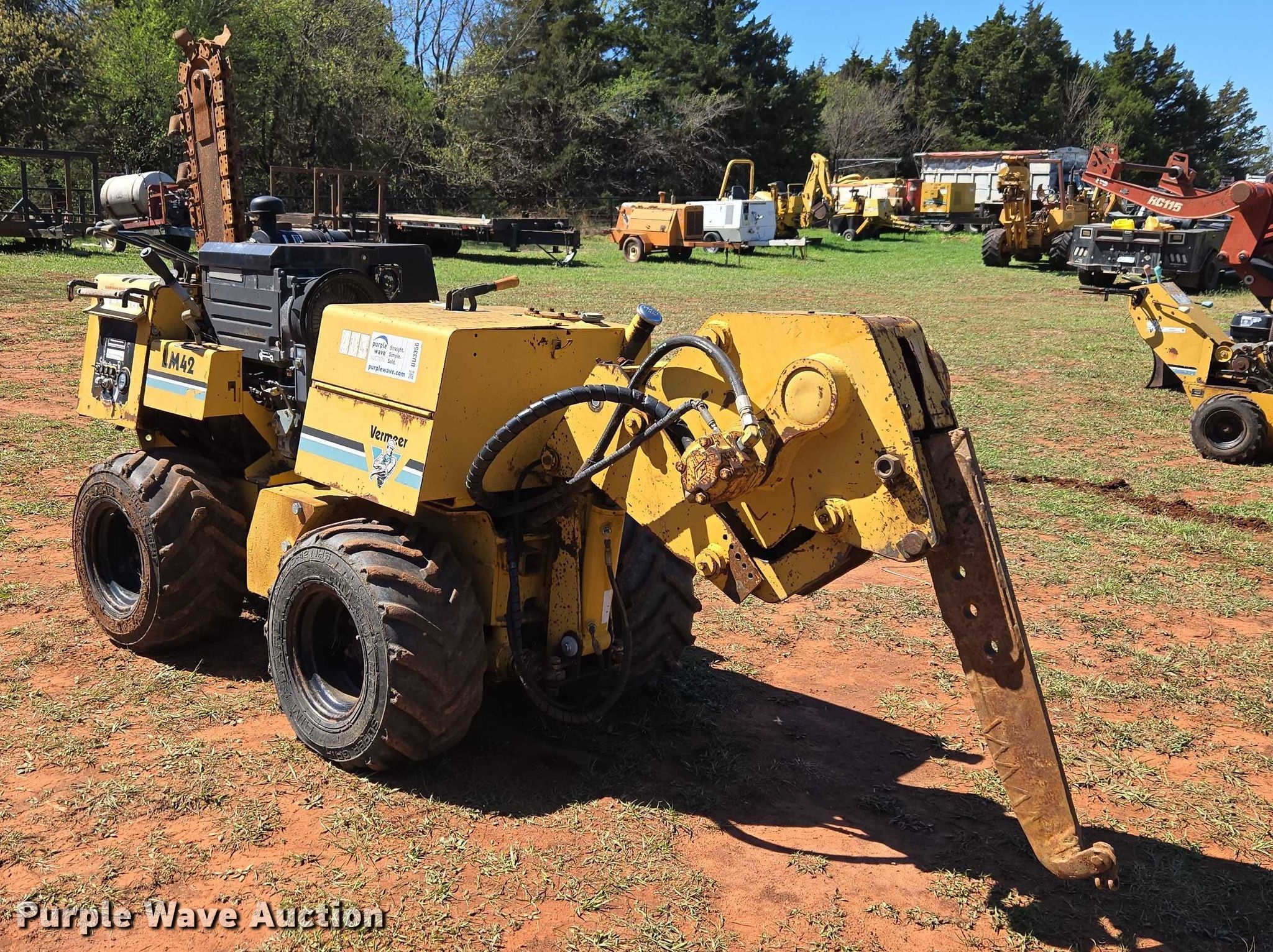 2004 Vermeer LM42 trencher. Hours: 1,866 on meter, Serial: 1VRM1121241003456. Engine Deutz F3L 1011 F, Cylinders: 3, Fuel type: Diesel. Transmission Hydrostatic. Chassis Four wheel drive. Features Trencher Estimated dig depth: 45", Wheel diameter: 7", Cutting width: 5", Teeth: Dirt, Vibratory plow Model: VP40, Serial: 1VRM040E101000493, Depth: 25". Tires Front: 26/12.00-12. Notes Possible hydraulic plow issues, Trencher missing teeth. Tracy Arms Trenching, LLC. Crescent, OK 73028