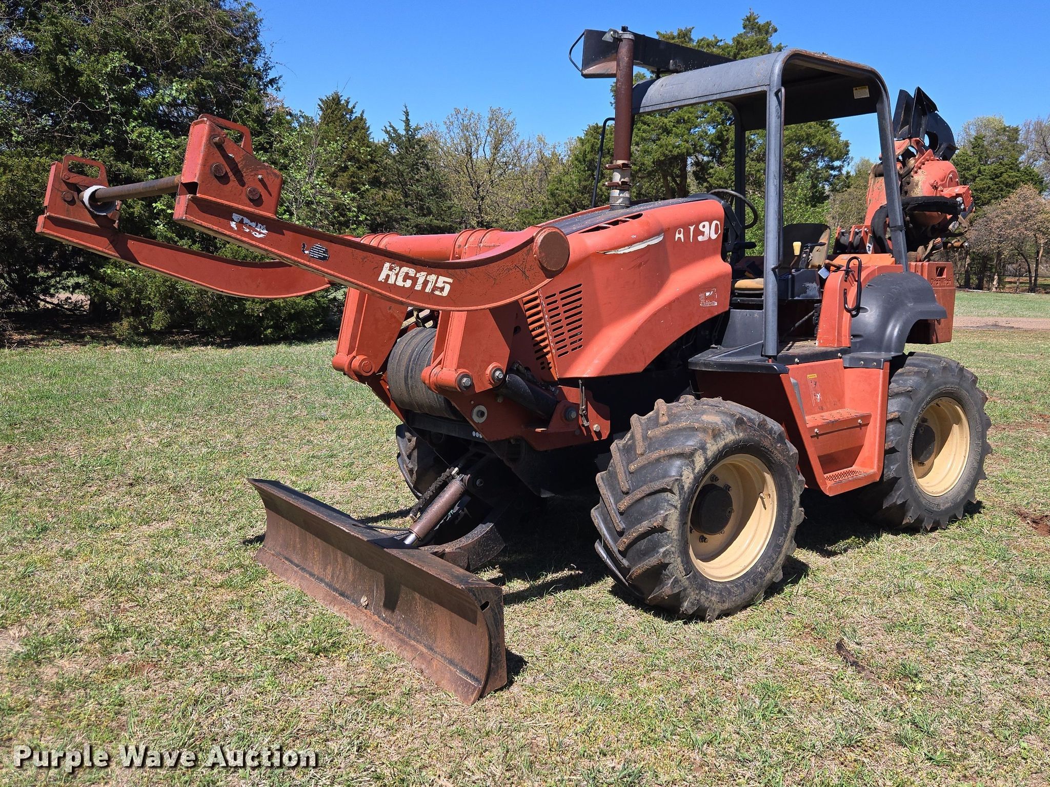 2002 Ditch Witch RT90 vibratory cable plow. Hours: 1,815 on meter, Serial: 5W0284. Engine John Deere 4045DF150A, Displacement: 4.5L, Cylinders: 4, Fuel type: Diesel. Transmission Hydrostatic, Two speed travel. Chassis Four wheel drive, Differential lock, Four wheel steer. Operators station OROPS, Canopy. Features Vibratory plow Model: H932, Serial: CMWH932XEB0000206, Reel carrier Model: RC115, Serial: 5W0677, Maximum reel width: 56", Backfill blade Width: 80". Tires Size: 38/18.00-20. Notes (3) additional blades included. Tracy Arms Trenching, LLC. Crescent, OK 73028