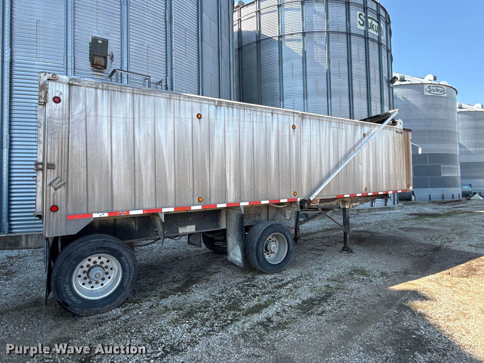 Trail King Industries end dump trailer. VIN: 1TKDS302X9B028333. Dimensions Overall Length: 30', Width: 96", Side height: 70". Features Body type: Aluminum, Ram: Single, End gate: Air operated, Poly liner, Roll tarp. Chassis Landing gear: Dual, Suspension: Air, Brakes: Air, Axles: Spread, GVWR: 80,000 lbs, GAWR: 20,000 lbs. Tires Aluminum wheels, Size: 425/80R22.5. Kansas title. Title distribution may be delayed up to 14 days from verification of funds. Bradford Grain. Neodesha, KS 66757