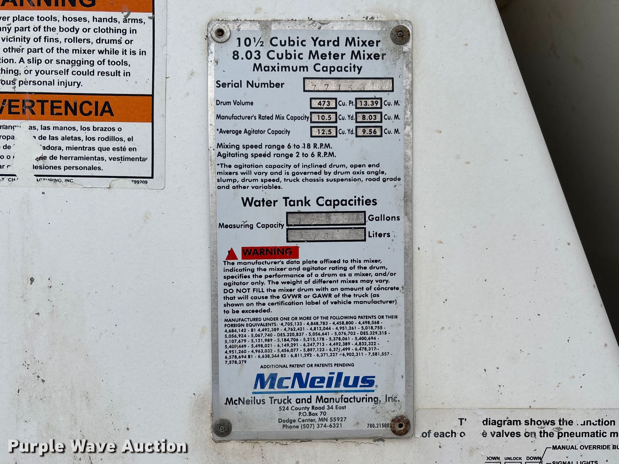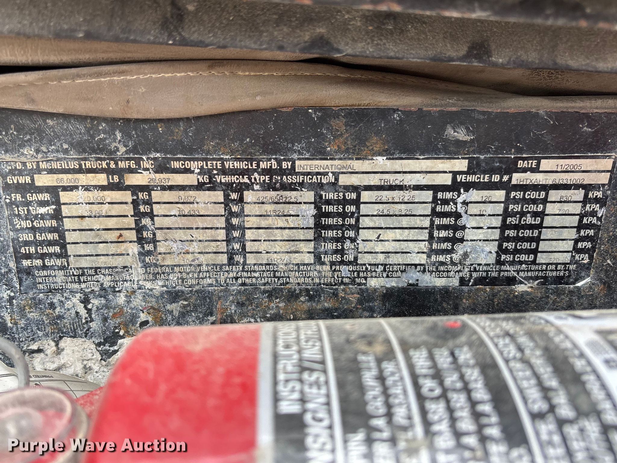 2006 International 5600i ready mix truck. Miles: 216,564 on odometer, Hours: 24,916 on meter, VIN: 1HTXHAHT06J331002. Engine Cummins ISM, Displacement: 10.8L, Cylinders: 6, Fuel type: Diesel, HP: 305. Transmission Automatic. Chassis Axles: Tandem, Differential lock: Inter-axle, Suspension: Spring over walking beam, Brakes: Air, Front mount PTO, GVWR: 66,000 lbs FAWR: 20,000 lbs, RAWR: 46,000 lbs, Wheelbase: 215". Interior AC, Heat, Heated mirrors, Cruise control. Features Mixer McNeilus, Serial: 77153, Capacity: 10 cu.yd., Discharge: Rear, In-cab controls, Rear drum controls, Water tank capacity: 125 gallons, Chute Extensions: 1, Chute type: Steel.. Tires Front: 425/65R22.5, Rear: 11R24.5. Notes Windshield chipped or cracked. Missouri title. Title distribution may be delayed up to 30 days from verification of funds. Emery Sapp & Sons, Inc... Columbia, MO 65202